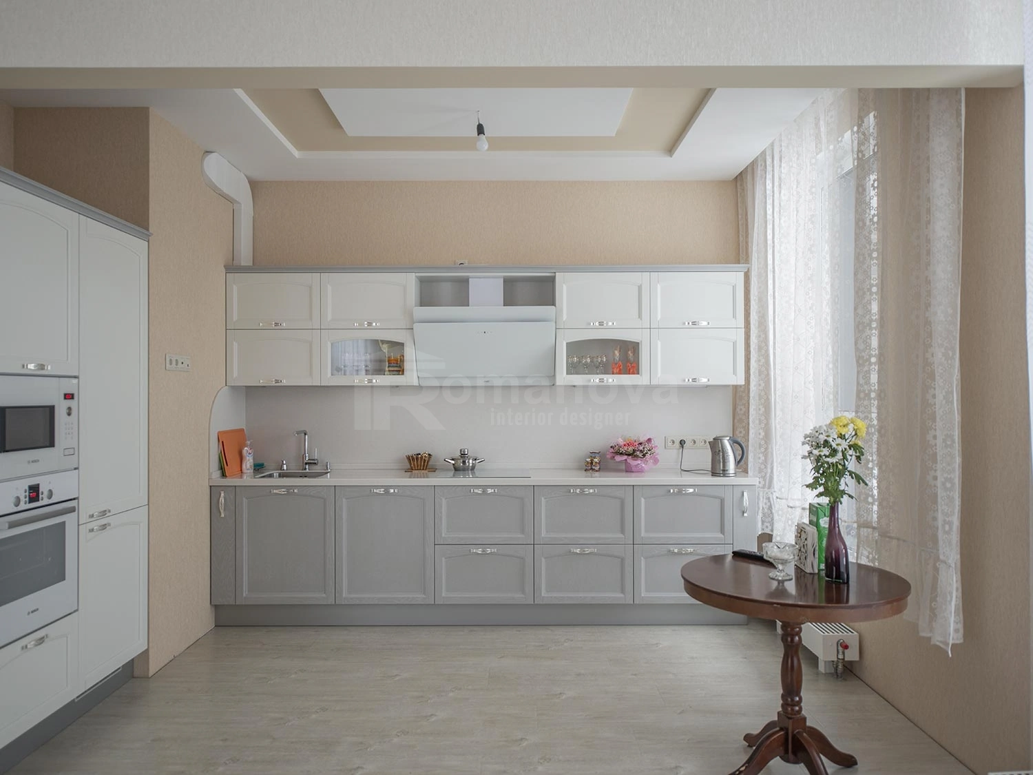 В современном и минималистичном интерьере дизайнером были привнесены неоклассические элементы, прослеживающийся в дизайне межкомнатных дверей, в некоторых светильниках, частично в меблировке. Такое стилистическое соединение, создало в интерьере очень уютную атмосферу, квартира выглядит стильно и элегантно.