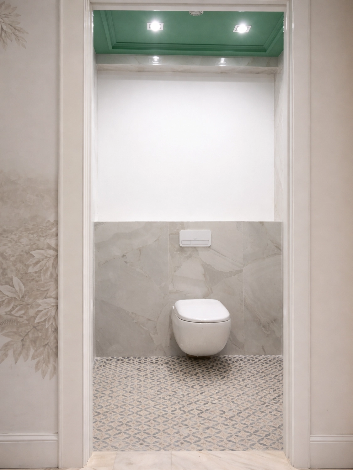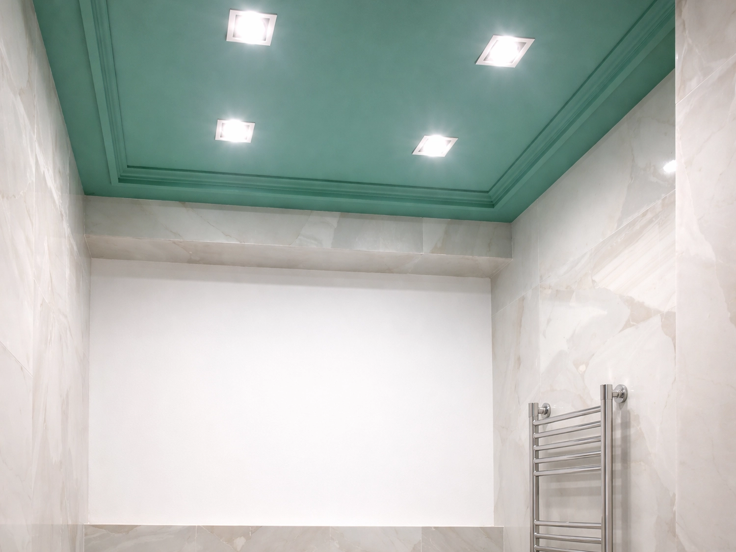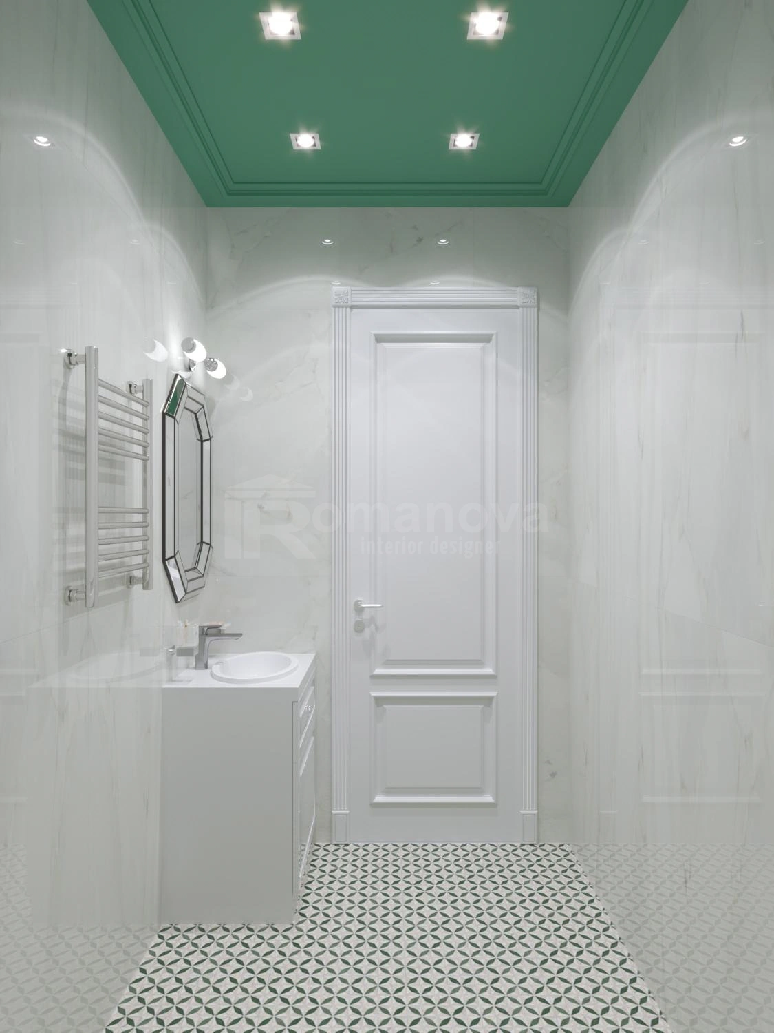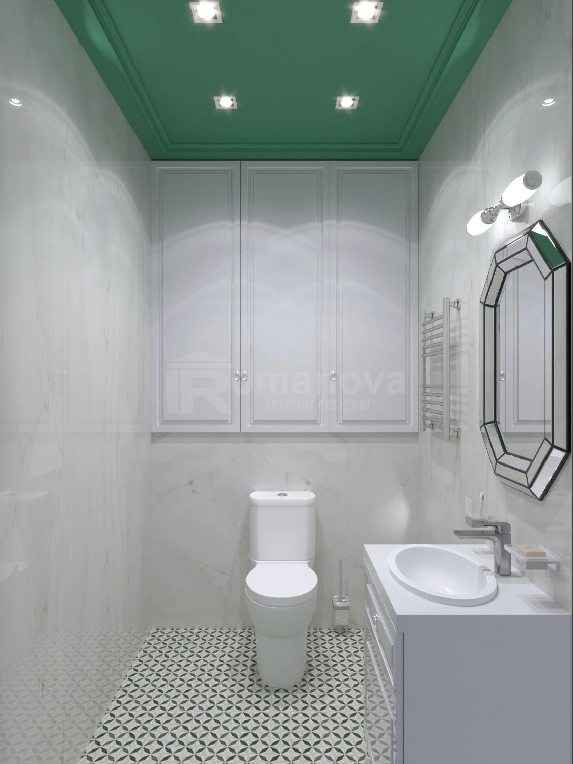 Дизайн для санузла смотрится необычно за счёт цветового решения, применённого для потолка, но как раз из-за подобного смелого акцента, даже такое маленькое помещение выглядит очень нарядным и теперь имеет свой характер.