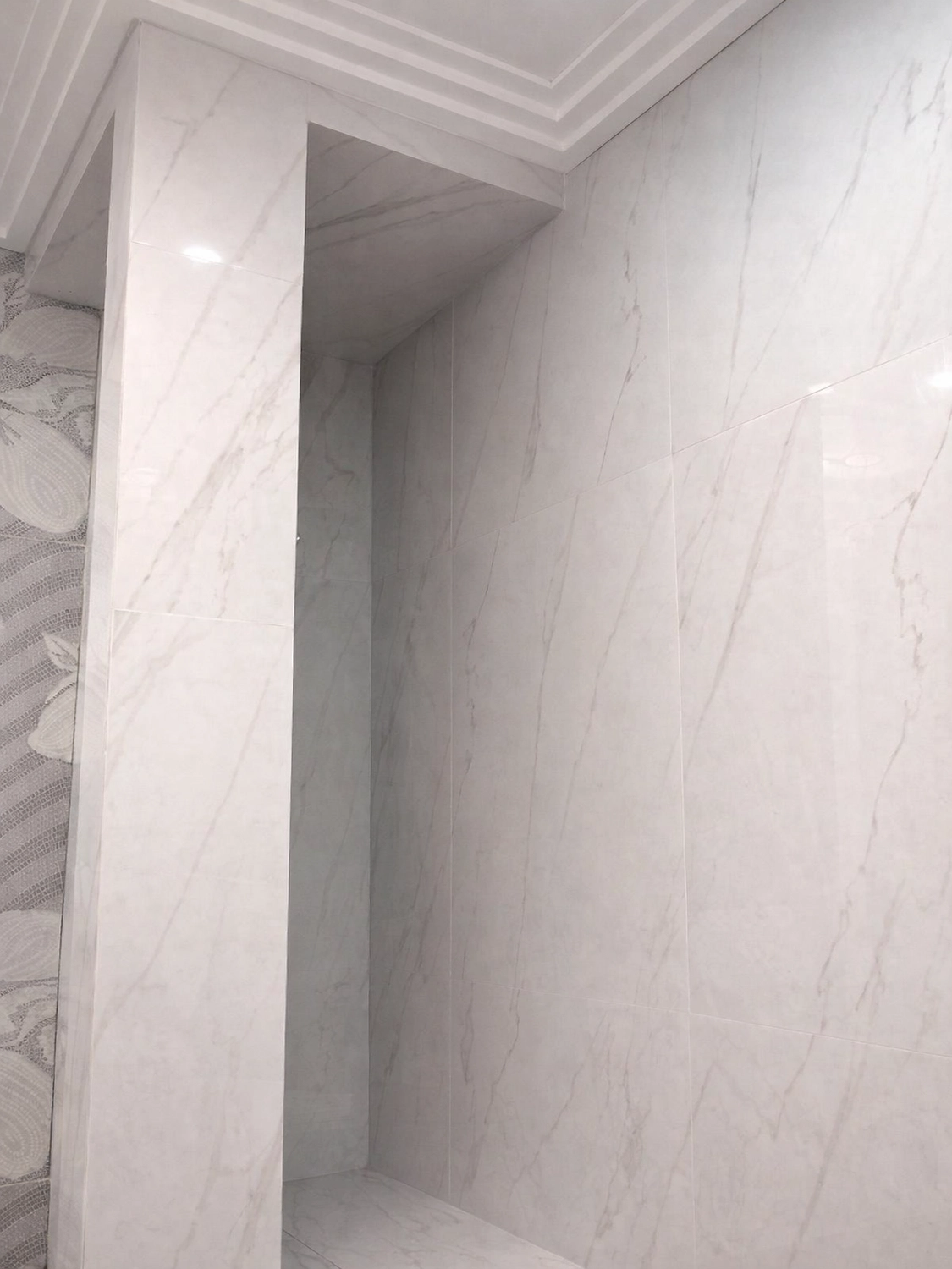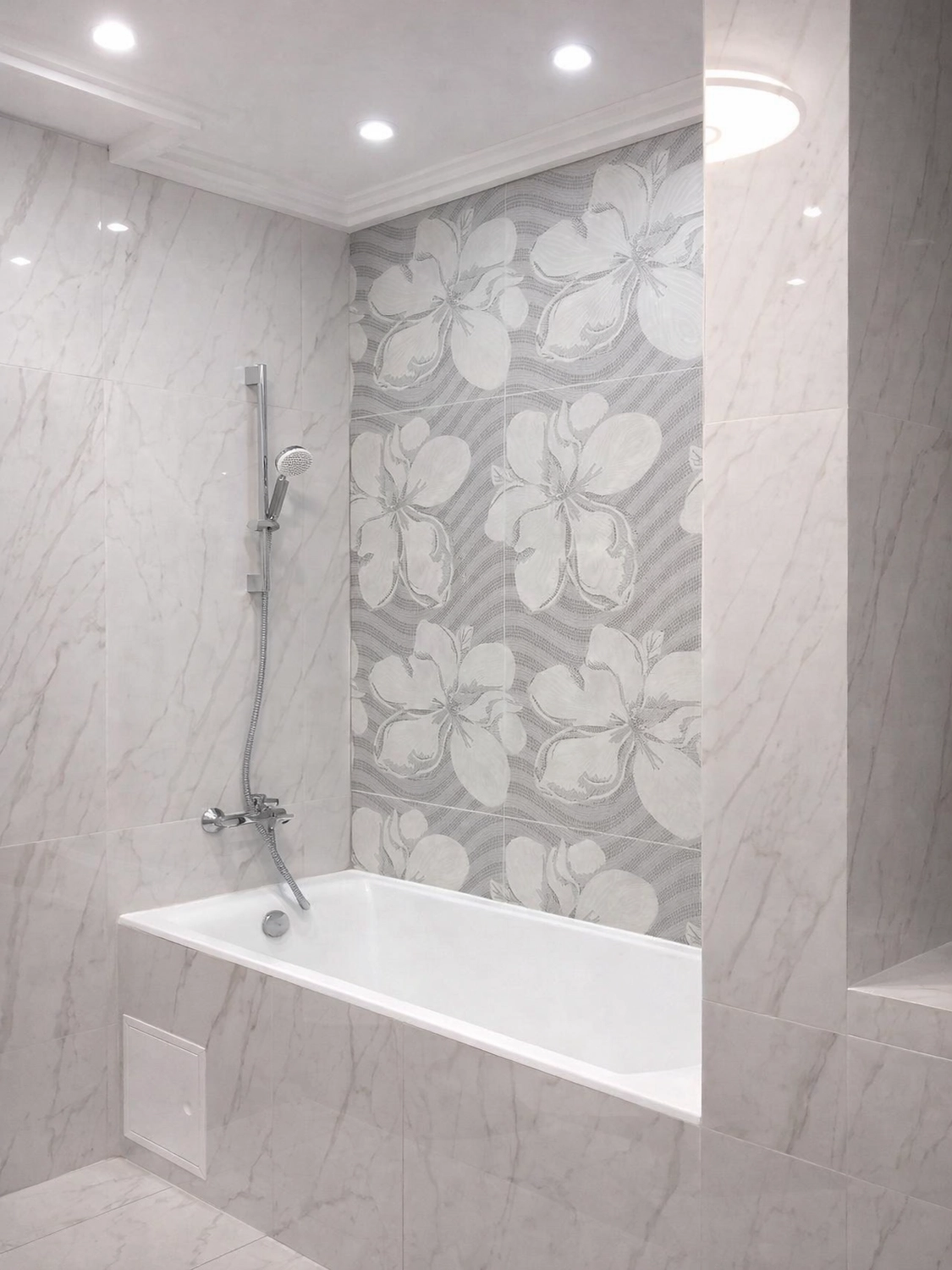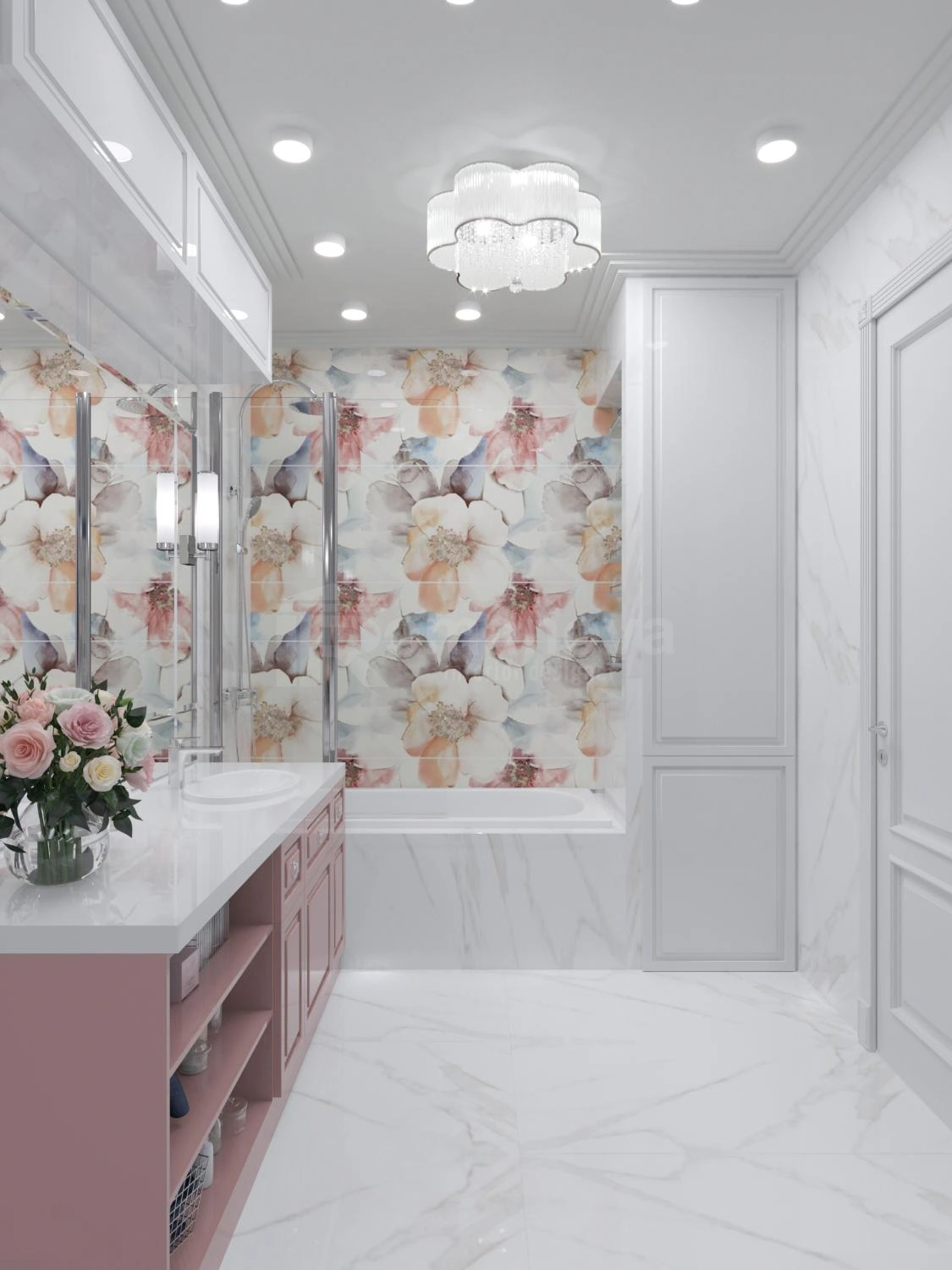 Интерьер ванной комнаты очень светлый, глянцевый и нарядный. Фоновая плитка больших размеров визуально очень расширяет пространство, а яркий акцент в виде панно с цветочным орнаментом освежает интерьерное решение комнаты.