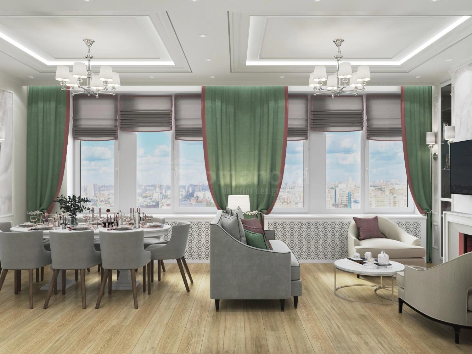 Дизайн интерьера в трёхкомнатной квартире бизнес класса с так называемой свободной планировкой выполнен дизайнером интерьера Ириной Романовой в неоклассическом стиле для очень интеллигентной пары средних лет. Приобретя новую просторную квартиру, хозяева для себя решили, что им нужен индивидуальный дизайн-проект интерьера, который был бы не только выполнен для них красивым и уютным, но и был максимально функционален.