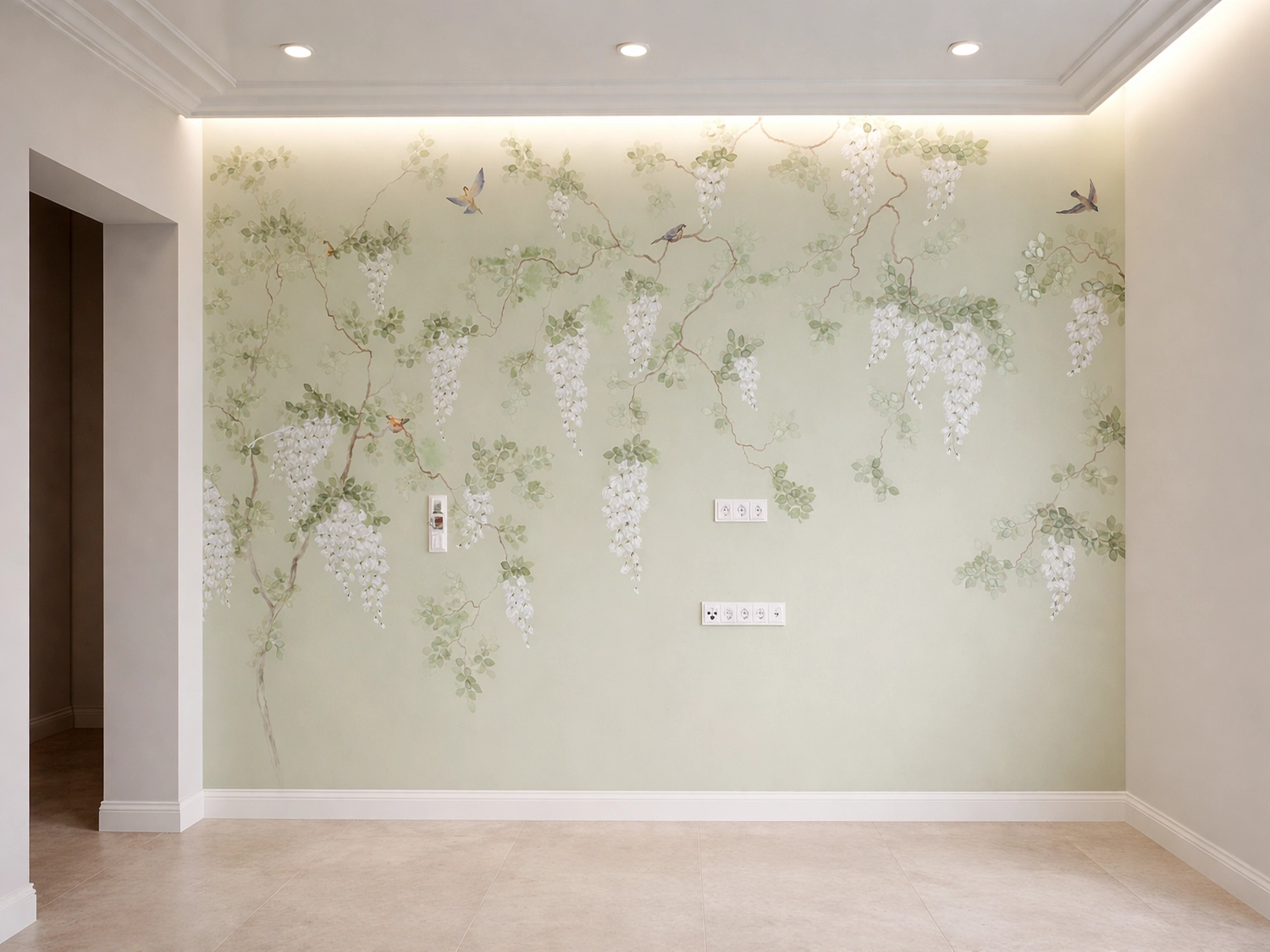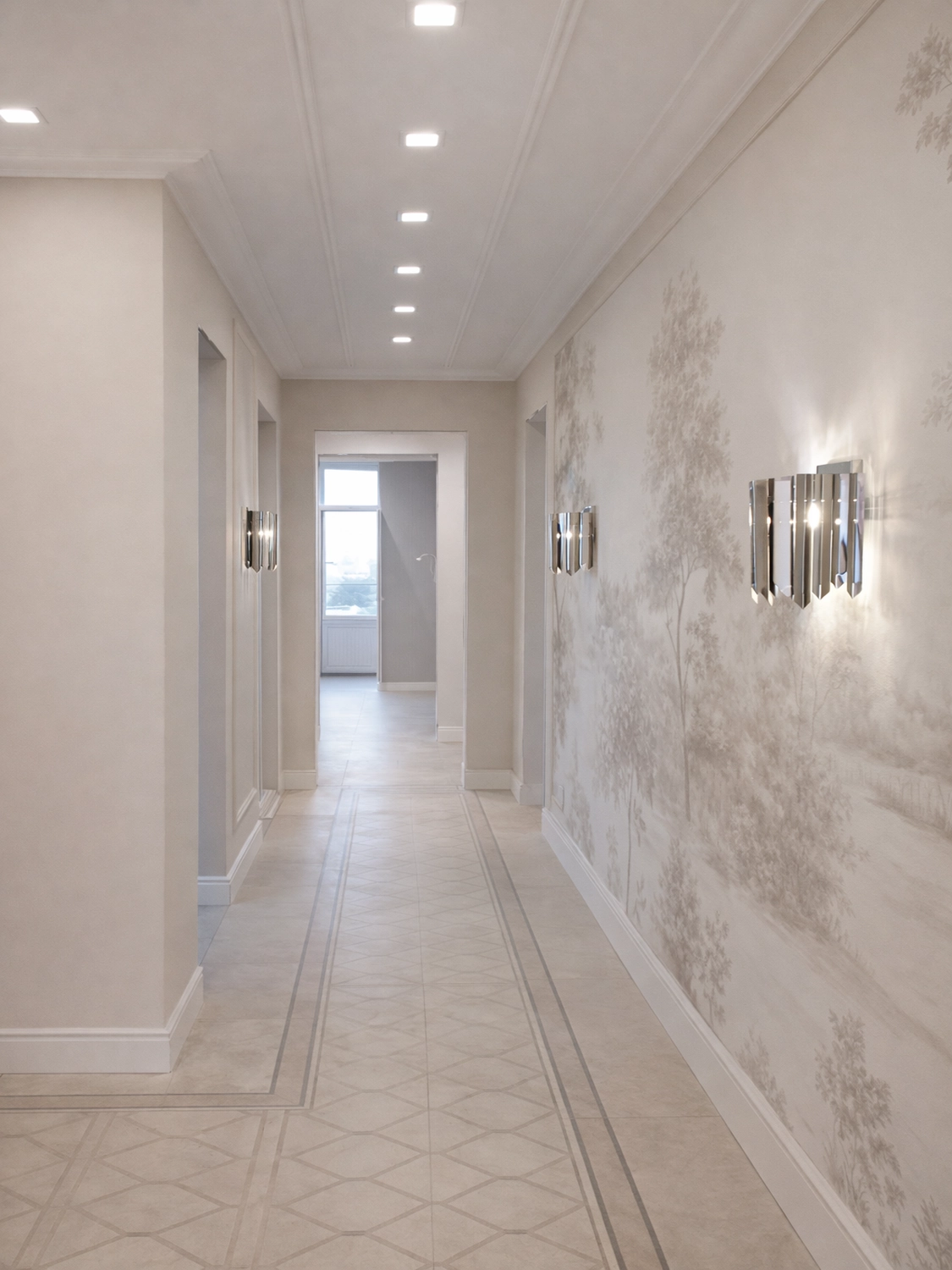 Помещение прихожей с порога встречает лёгким и нарядным интерьером. Светлое пространство имеет яркий и в тоже время неброский акцент – это бесшовные обои с идеей перспективы в виде сада. Подобный декор ненавязчиво распространён по всем стенам и очень освежает интерьерное оформление пространства.