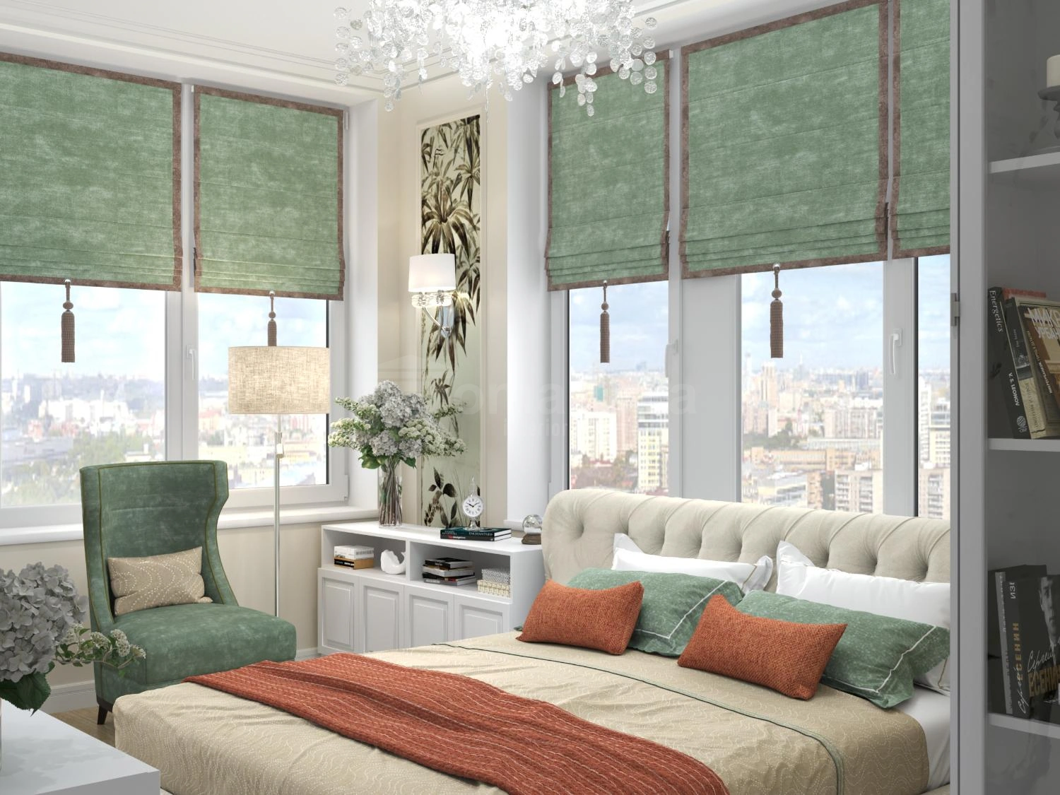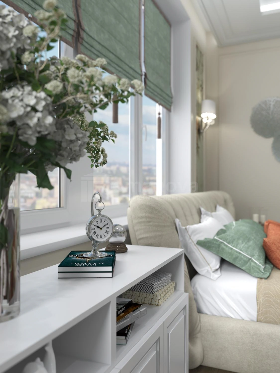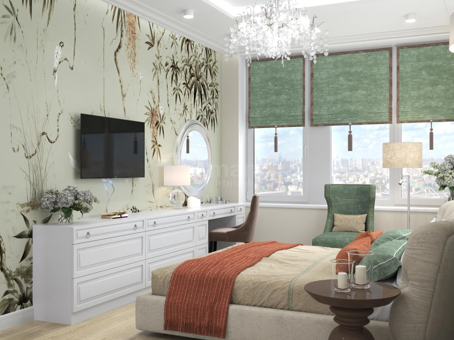 Спальня хозяйки дома – это комната для спокойного время препровождения, для отдыха. Интерьер имеет спокойную цветовую палитру «сливок» и «мяты» с небольшими яркими акцентными пятнами в оранжевой палитре для настроения. Но самым ярким акцентом в комнате являются бесшовные обои с тематикой тёплого оазиса, который визуально делает помещение очень тёплым и уютным.
