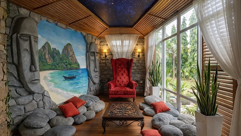 Данная комната рассчитана на отдых и релакс и никакой функциональной нагрузки не несет, поэтому идея интерьера для данной комнаты была выбрана в виде «шале на Гавайях», т. к. заказчик Бари Алибасов изначально поставил задачу мне, чтобы интерьер был интересным и креативным.