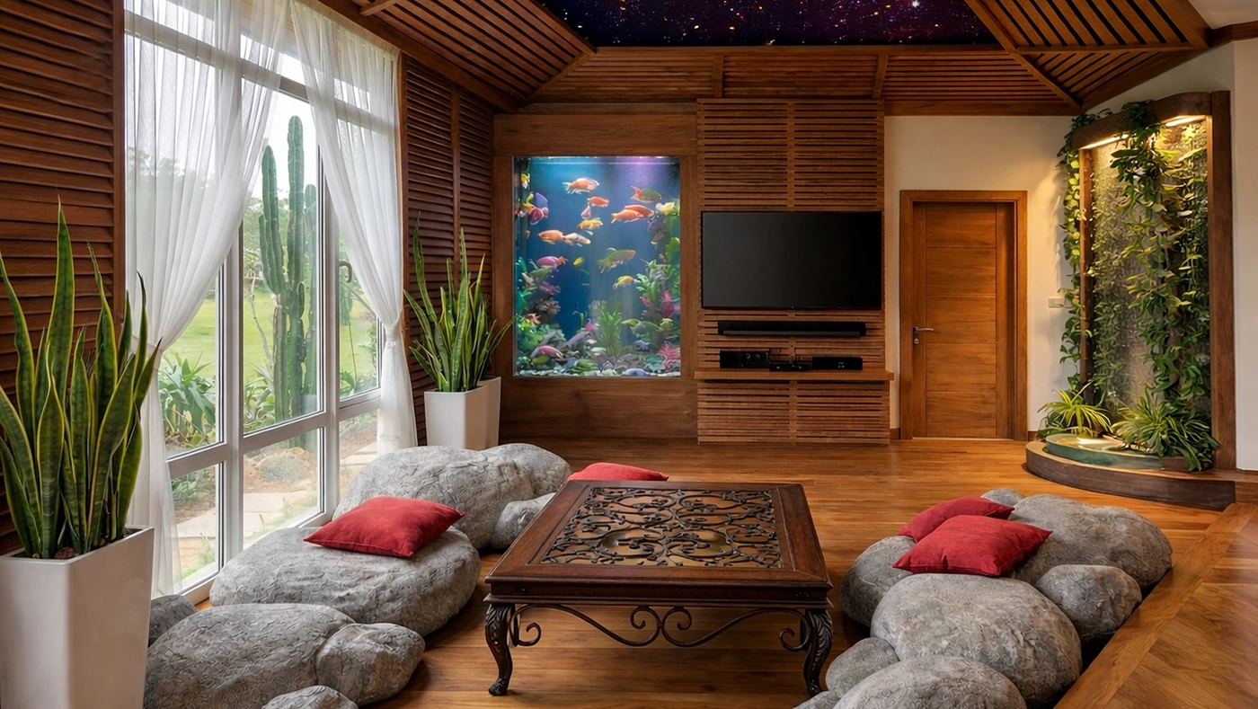 В эко комнате так же установлены: огромный от пола до потолка аквариум с морскими рыбками, водопад и телевизор, которые дополняют комнату отдыха.
