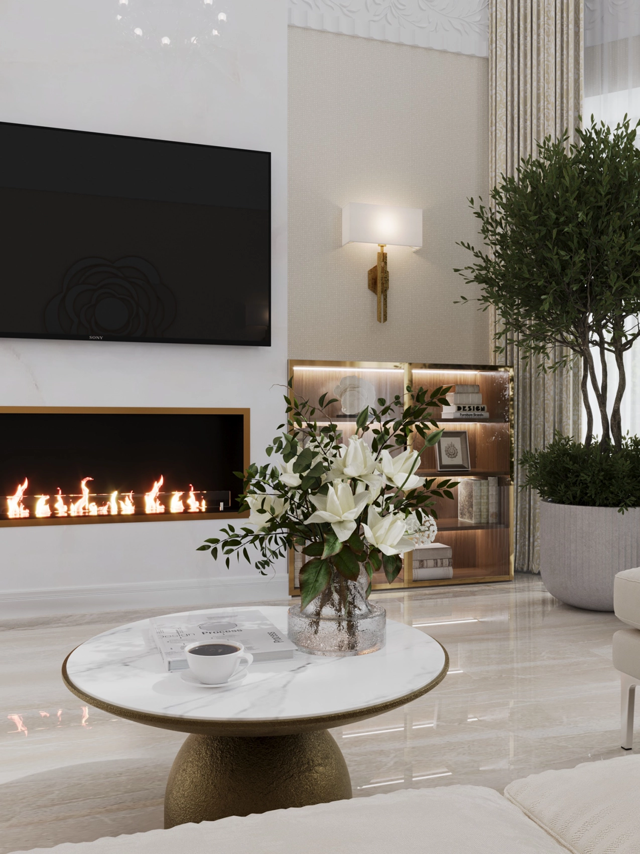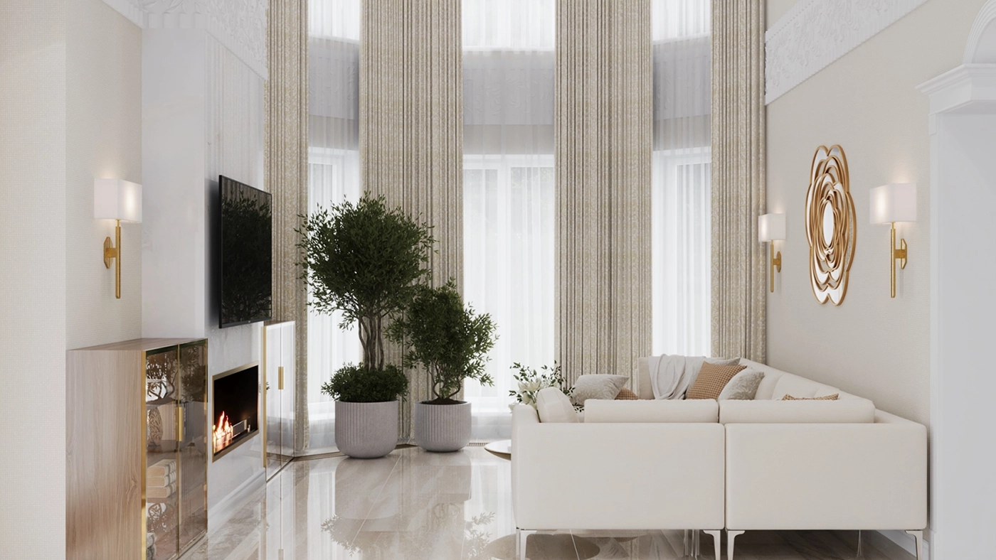Самым ярким акцентом в интерьере являются глянцевые и отражающие поверхности, а также сложный световой дизайн. Что касается цветового оформления, я работала с палитрой оттенков, которые комфортны для самих заказчиков. Поэтому визуально интерьер выглядит сдержанным и благородным, но имеет характерные акцентные пятна, добавляющие пространству изюминки. В гостиной таким центром притяжения стал биокамин в обрамлении латуни и масштабное озеленение — живые деревья подчеркивают высоту потолков.