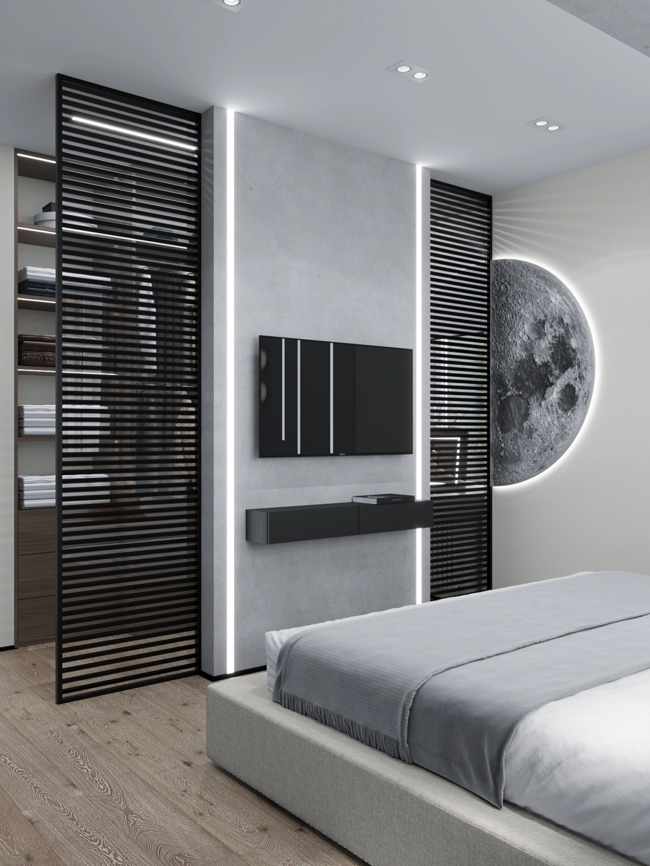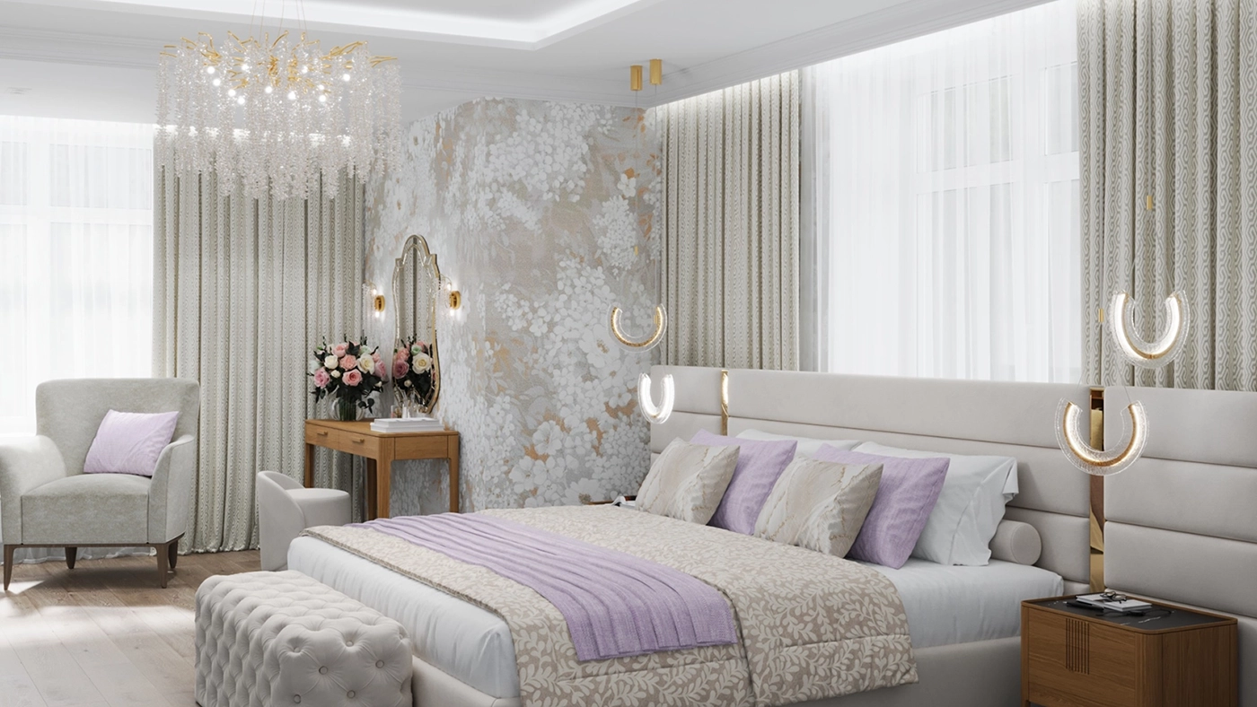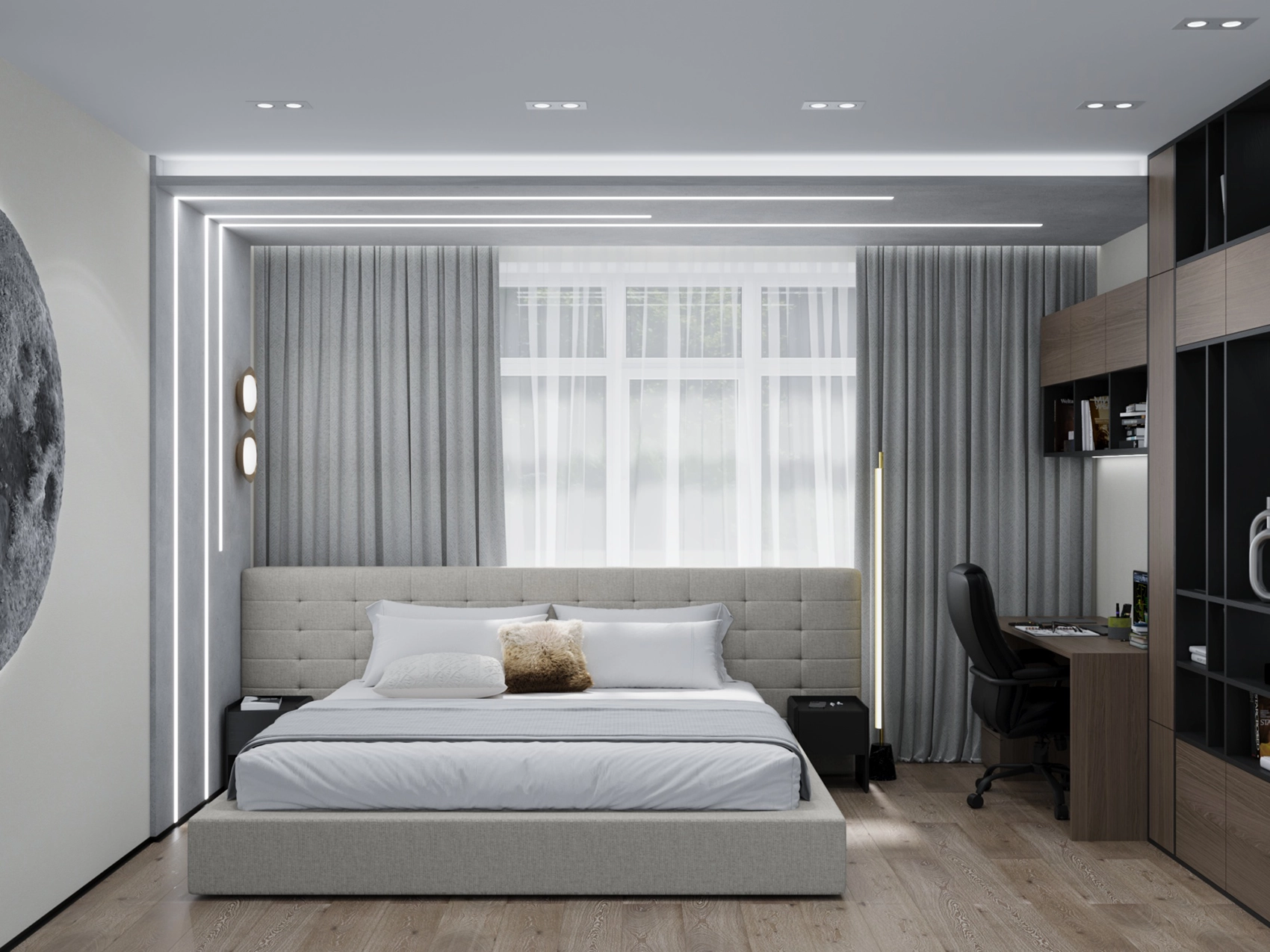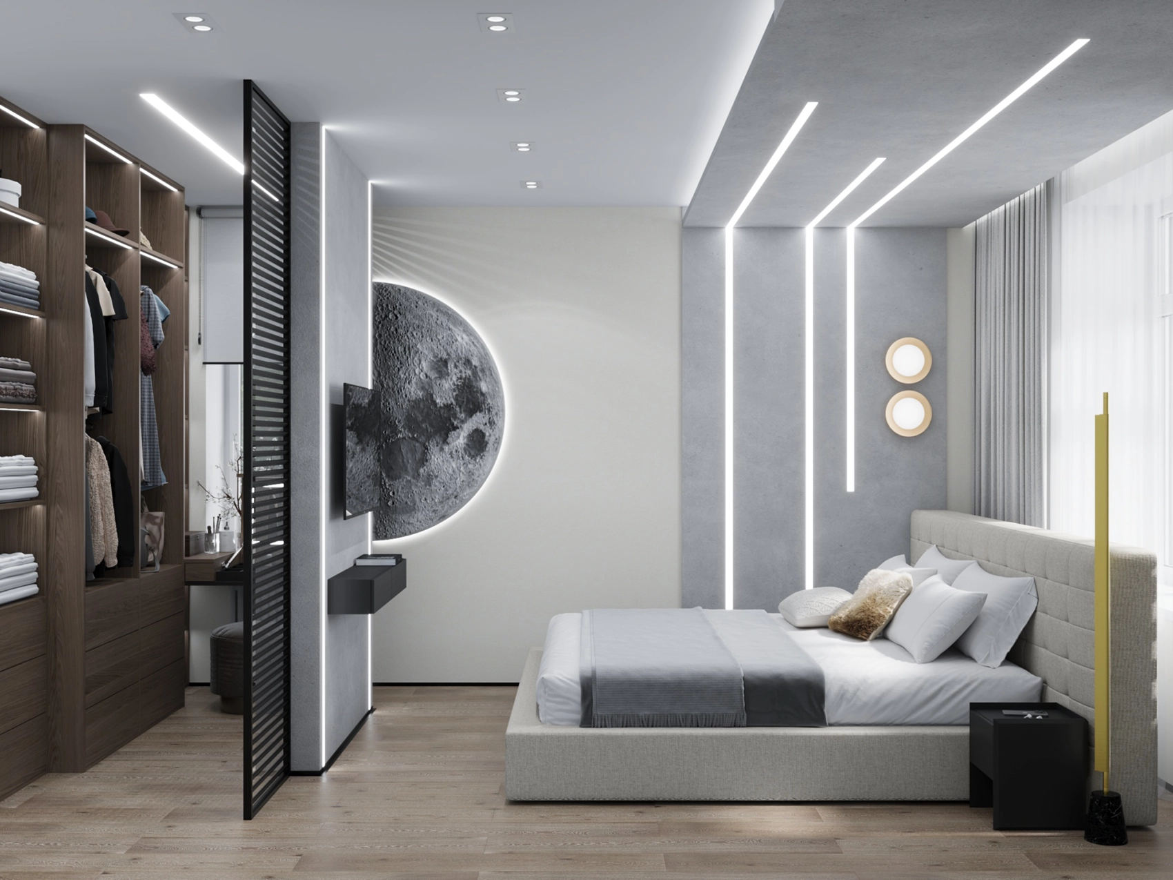 Второй этаж визуально отличается от первого за счет применяемых фактур — это приватная зона, которая выполнена более уютной и тактильно приятной. Помещений в доме довольно много, и каждое отображает свой характер, сохраняя единый концепт. Например, мастер-спальня окутывает нежностью благодаря обоям с цветочным принтом и мягкому изголовью с золотыми вставками, а вторая спальня удивляет смелостью: стена с фактурой бетона, графичные LED-линии и акцентный светильник в виде Луны создают космическое настроение.