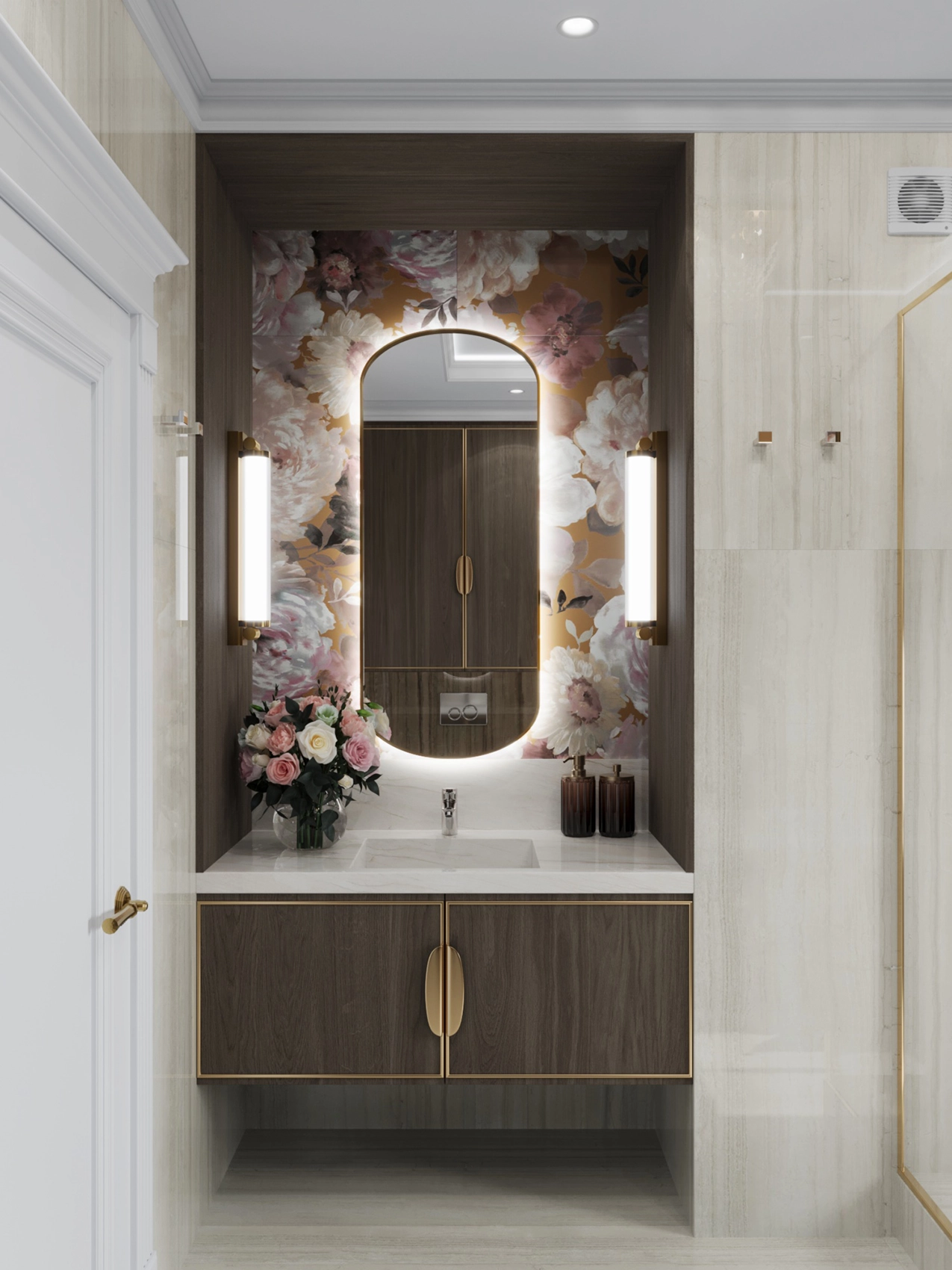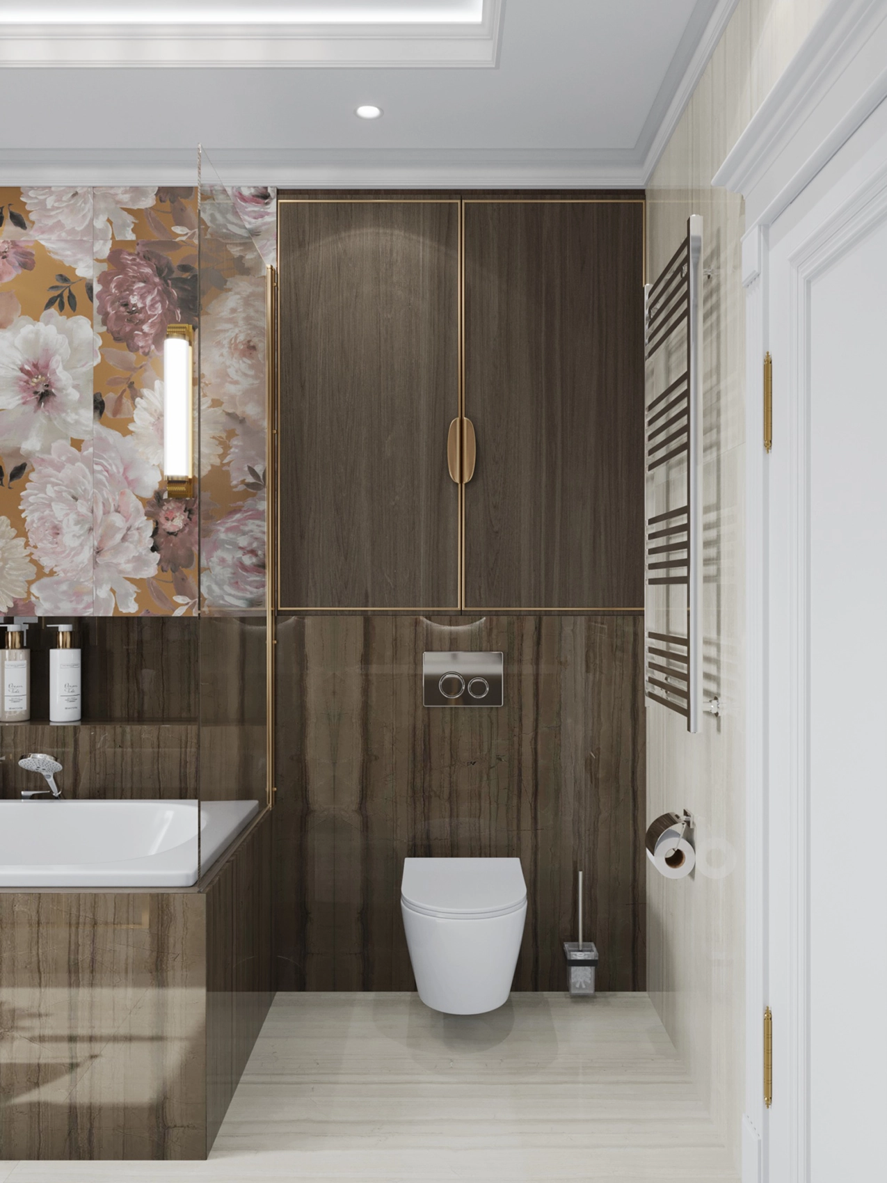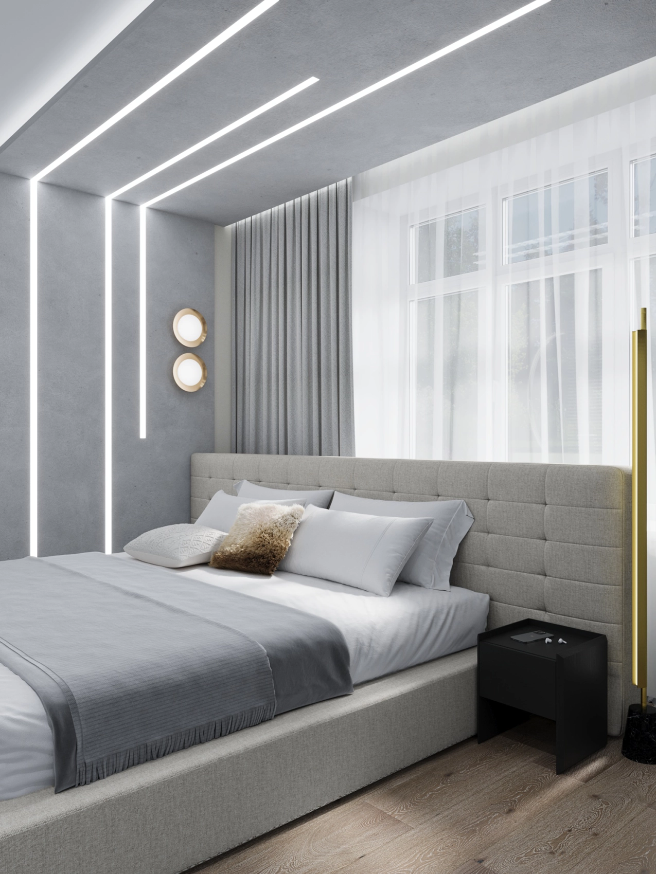Второй этаж визуально отличается от первого за счет применяемых фактур — это приватная зона, которая выполнена более уютной и тактильно приятной. Помещений в доме довольно много, и каждое отображает свой характер, сохраняя единый концепт. Например, мастер-спальня окутывает нежностью благодаря обоям с цветочным принтом и мягкому изголовью с золотыми вставками, а вторая спальня удивляет смелостью: стена с фактурой бетона, графичные LED-линии и акцентный светильник в виде Луны создают космическое настроение.