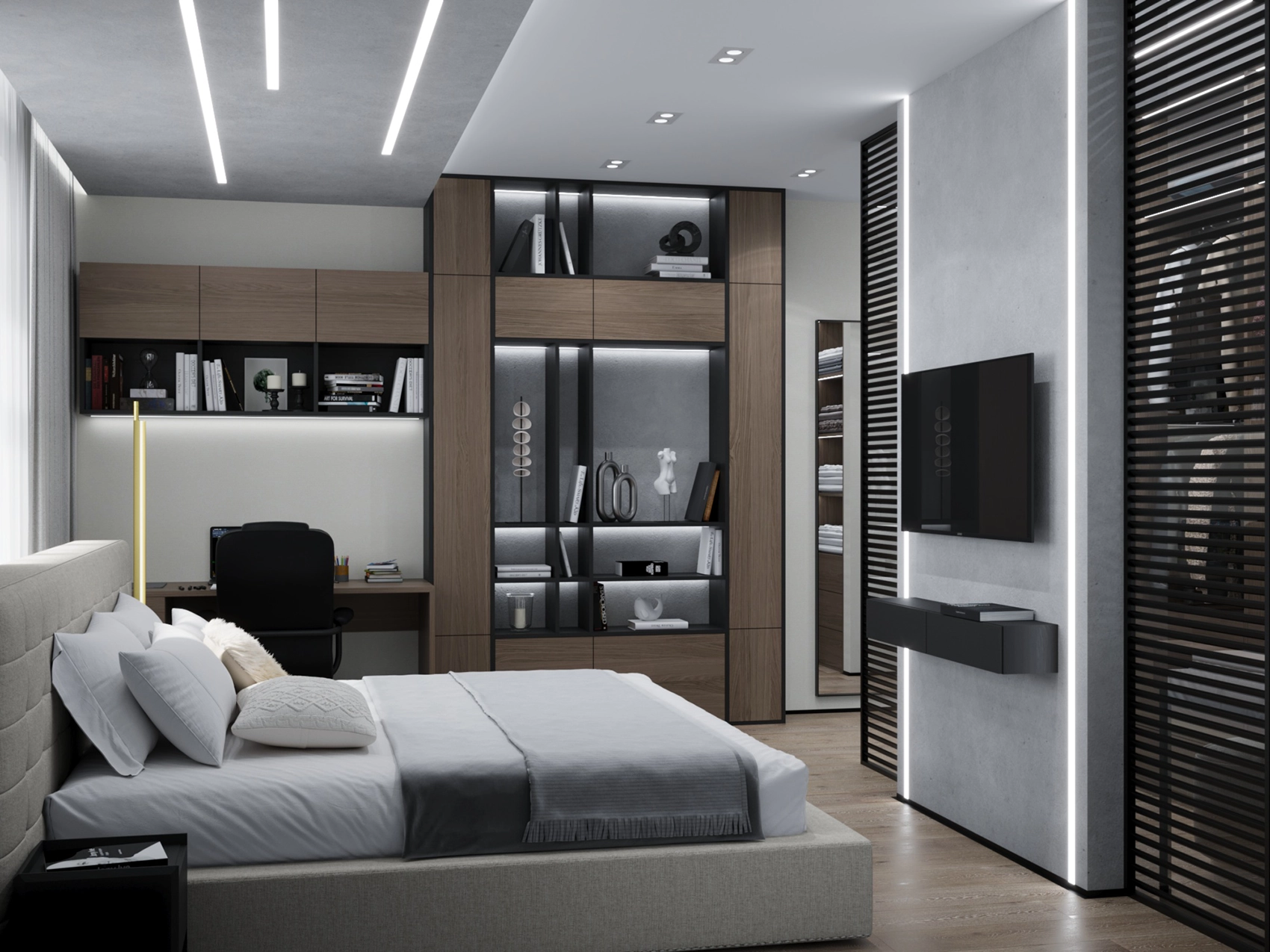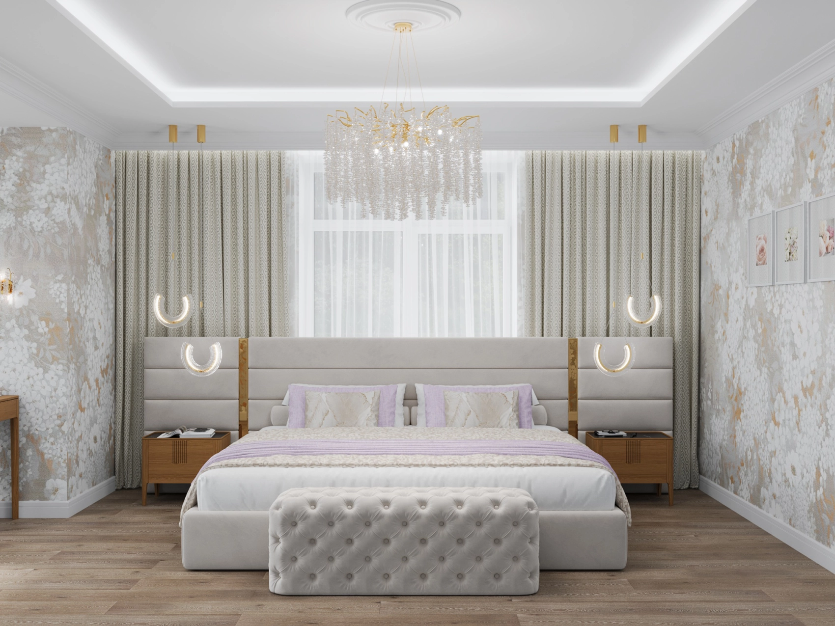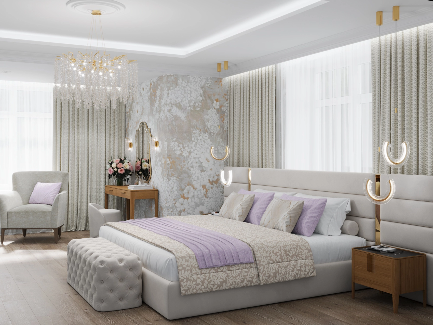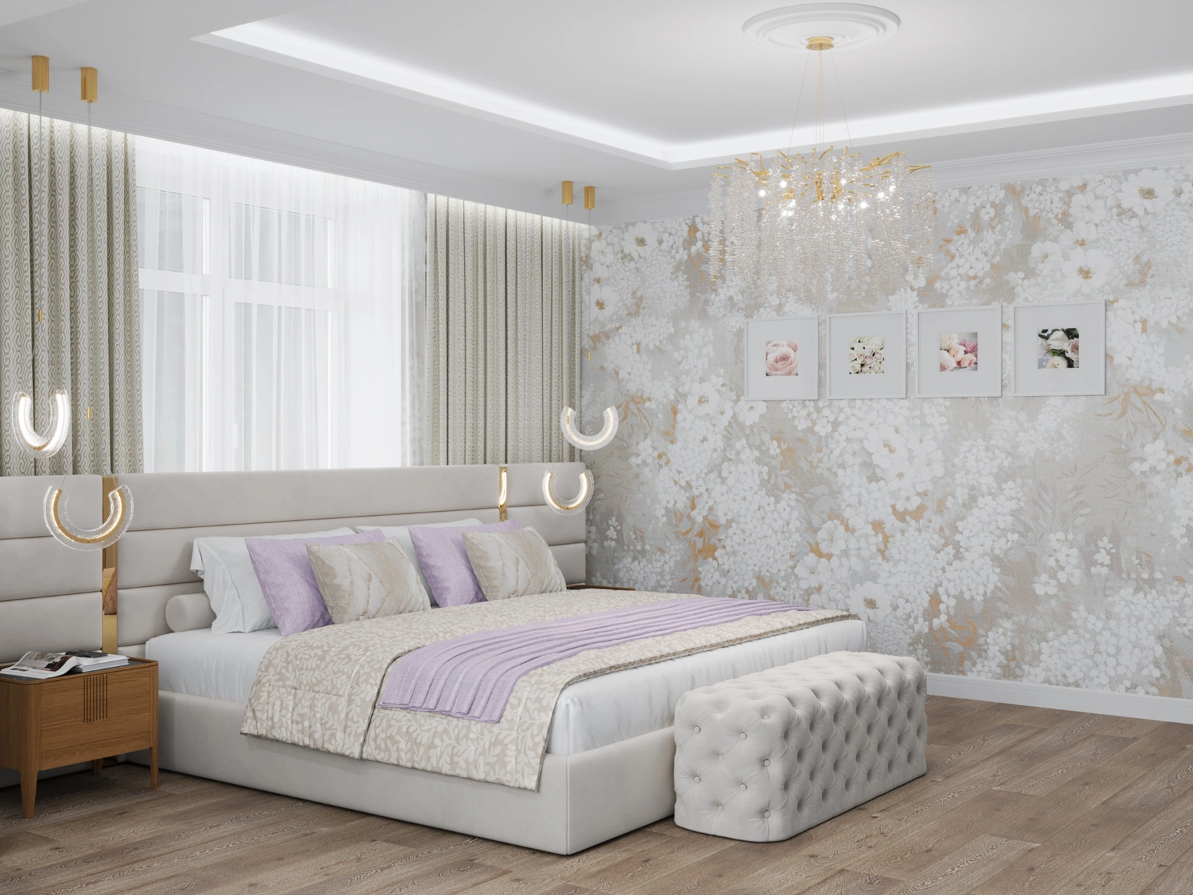 Второй этаж визуально отличается от первого за счет применяемых фактур — это приватная зона, которая выполнена более уютной и тактильно приятной. Помещений в доме довольно много, и каждое отображает свой характер, сохраняя единый концепт. Например, мастер-спальня окутывает нежностью благодаря обоям с цветочным принтом и мягкому изголовью с золотыми вставками, а вторая спальня удивляет смелостью: стена с фактурой бетона, графичные LED-линии и акцентный светильник в виде Луны создают космическое настроение.
