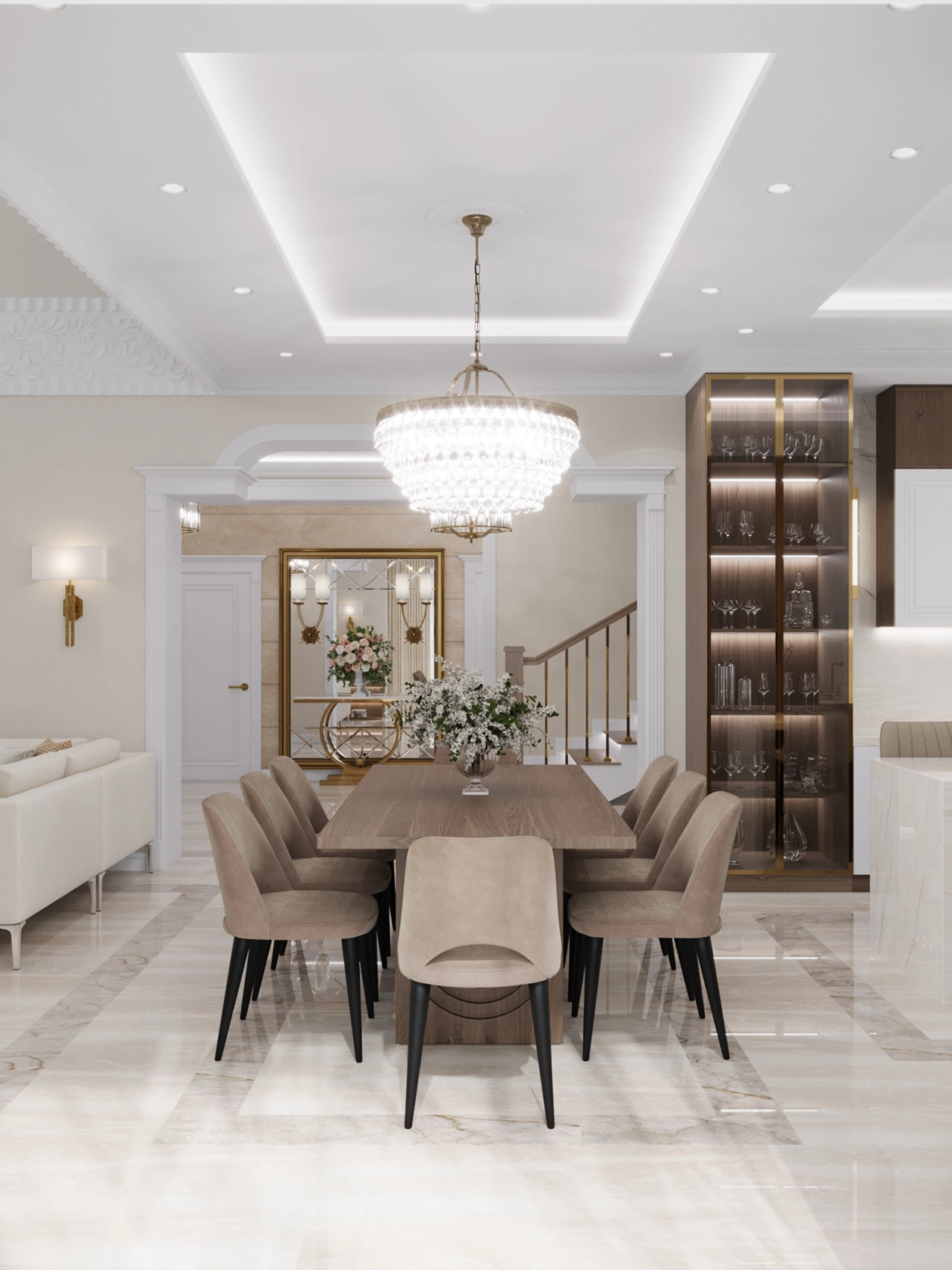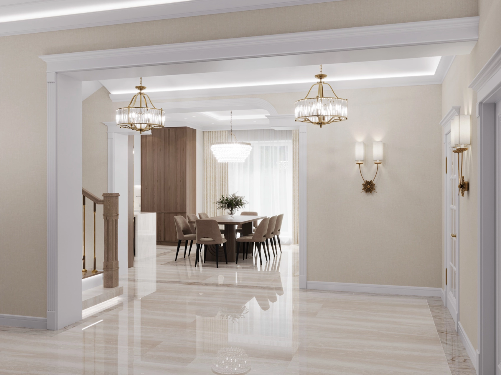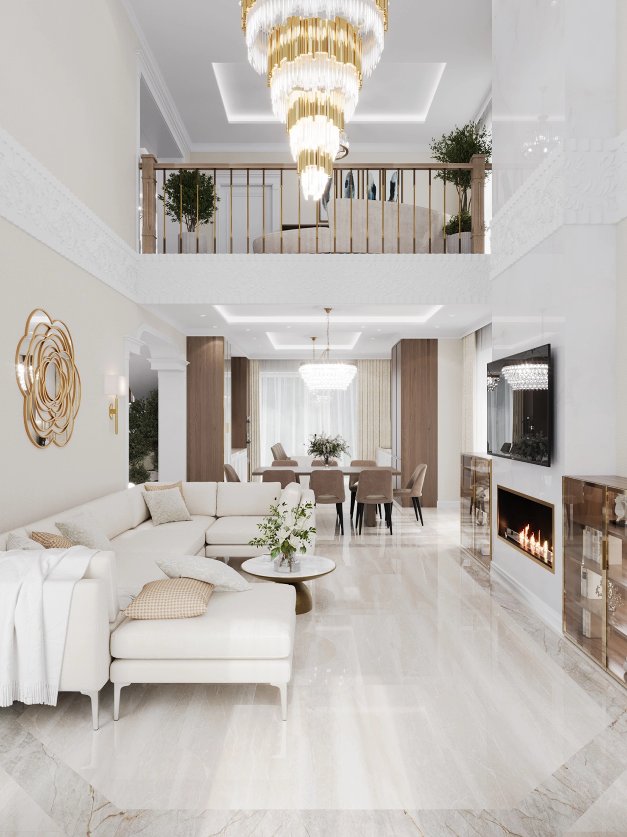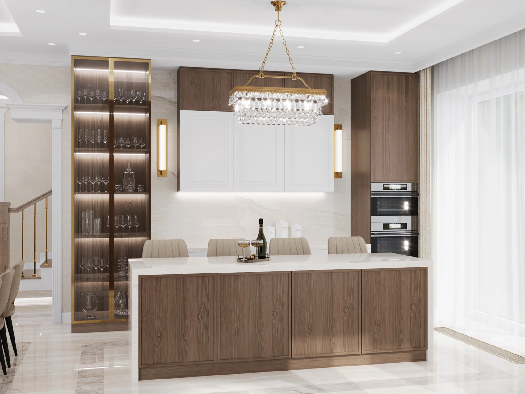 Первый этаж, где расположена двусветная гостиная с панорамными окнами, обязан выглядеть парадно и помпезно. Здесь царит атмосфера роскоши: глянцевый керамогранит с рисунком под натуральный камень, многоярусные хрустальные люстры над кухонным островом и столовой группой, а также витрины с тонированным стеклом. Кухня сочетает в себе теплоту шпона дерева и элегантность белых фасадов с классической филенкой.