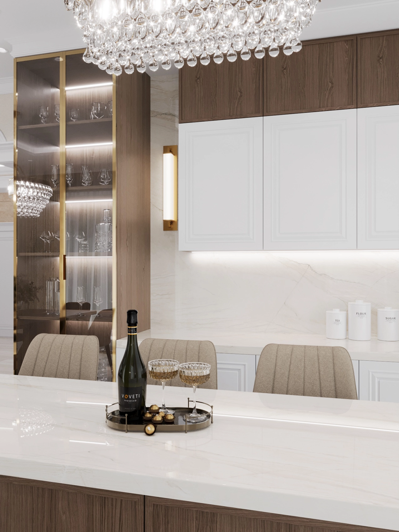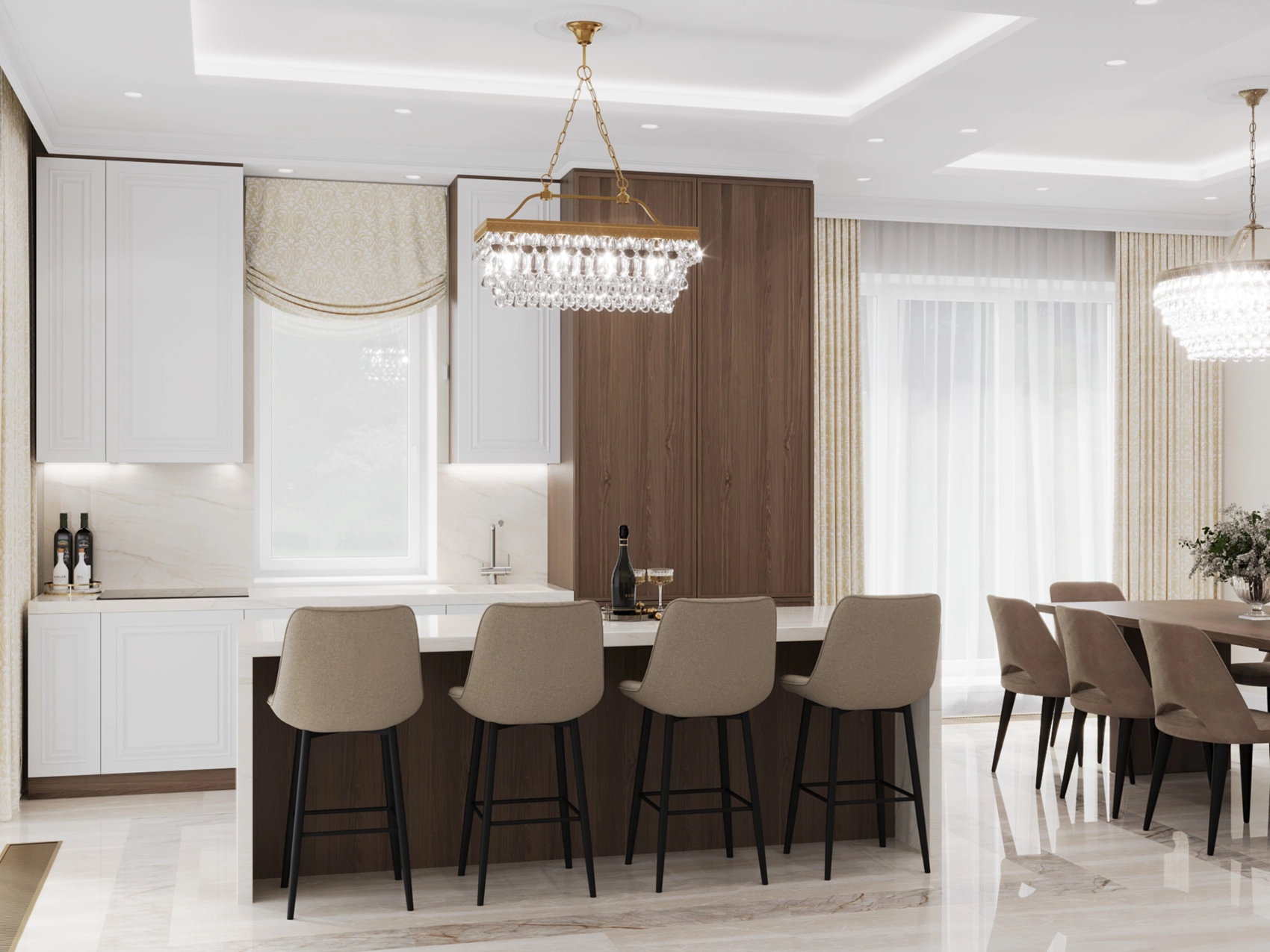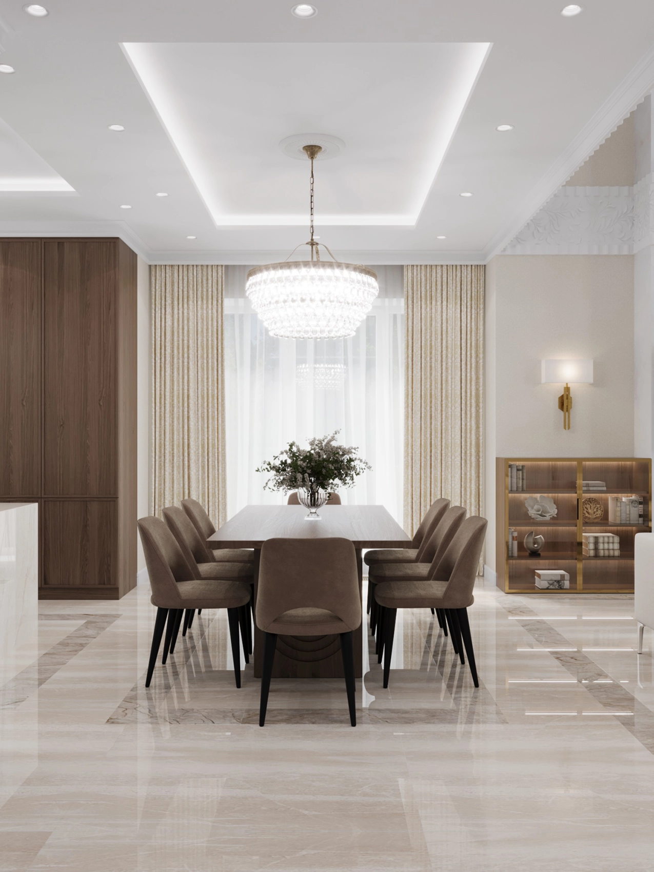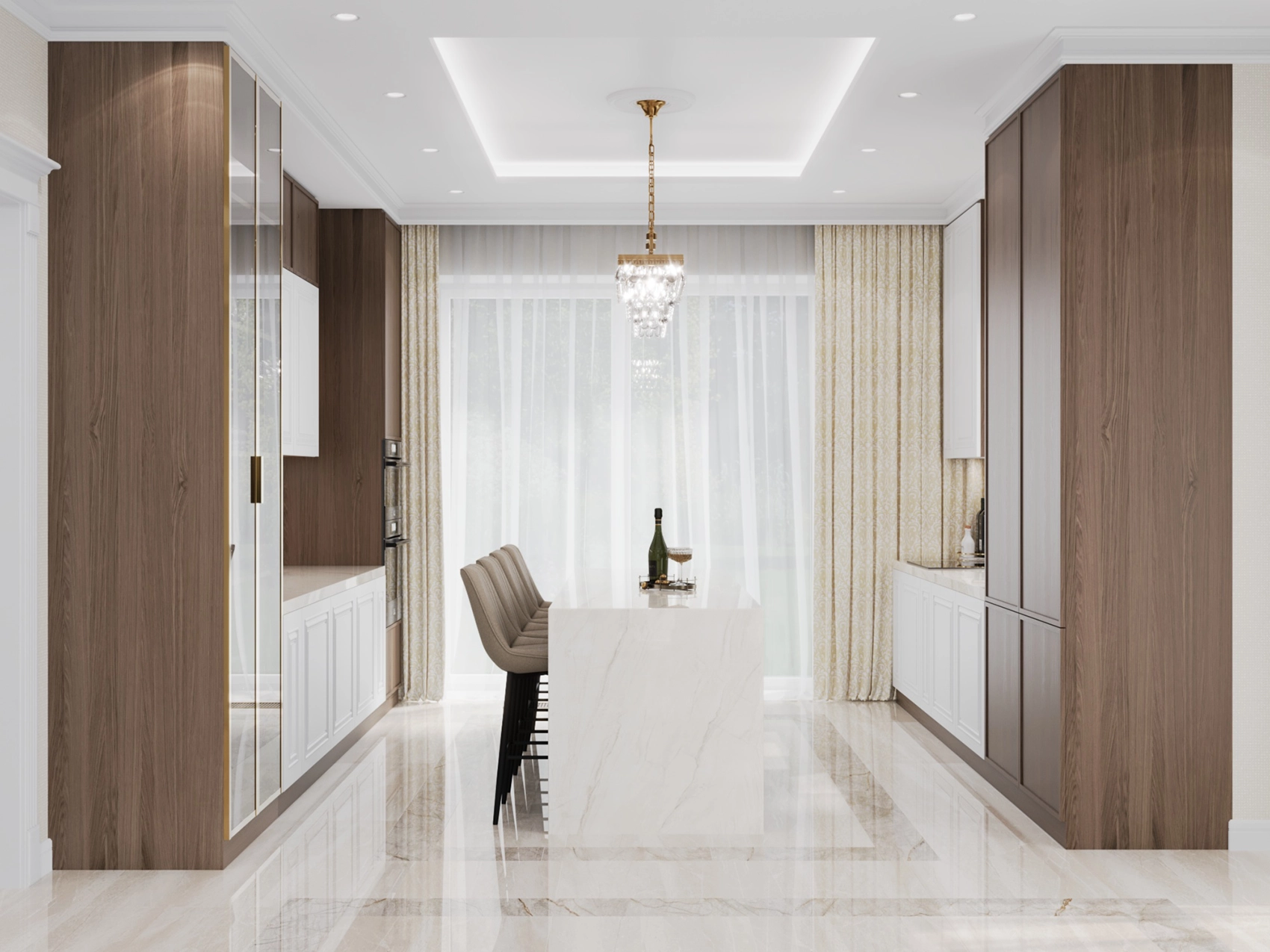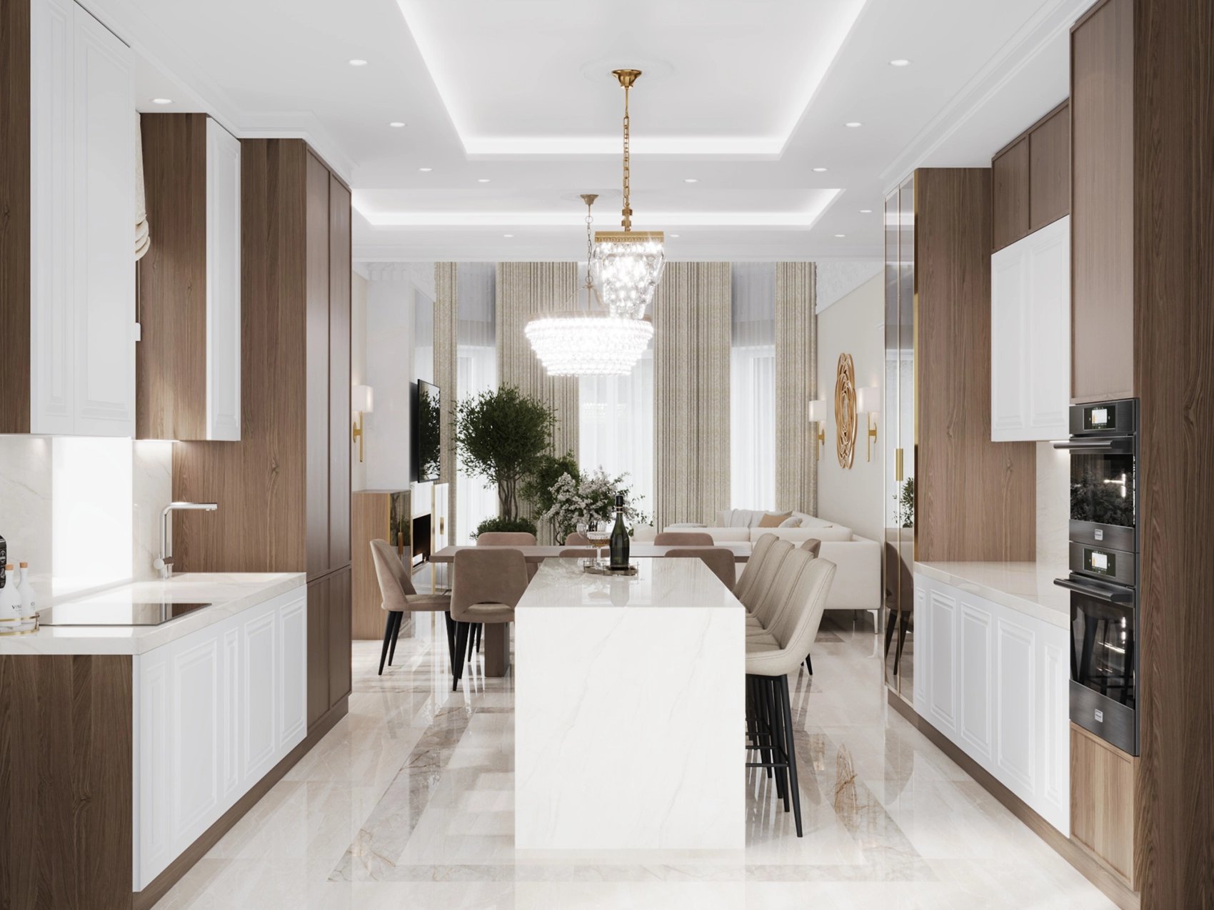 Первый этаж, где расположена двусветная гостиная с панорамными окнами, обязан выглядеть парадно и помпезно. Здесь царит атмосфера роскоши: глянцевый керамогранит с рисунком под натуральный камень, многоярусные хрустальные люстры над кухонным островом и столовой группой, а также витрины с тонированным стеклом. Кухня сочетает в себе теплоту шпона дерева и элегантность белых фасадов с классической филенкой.