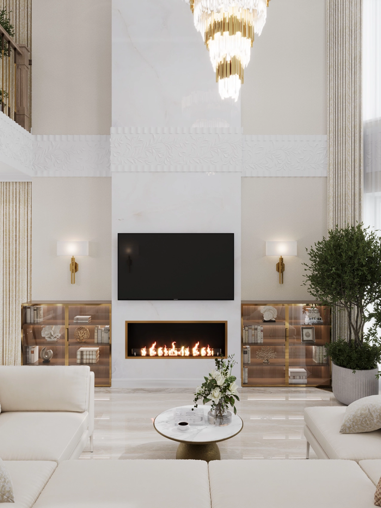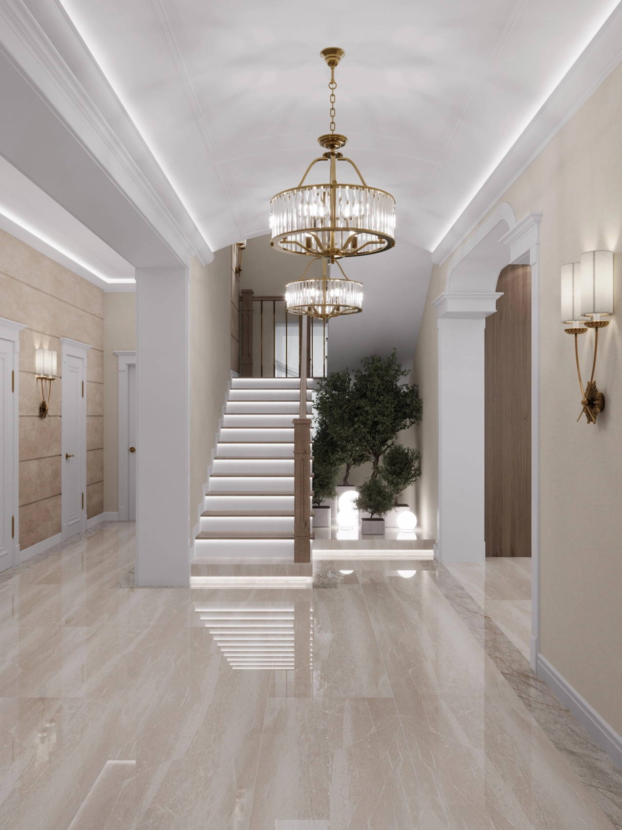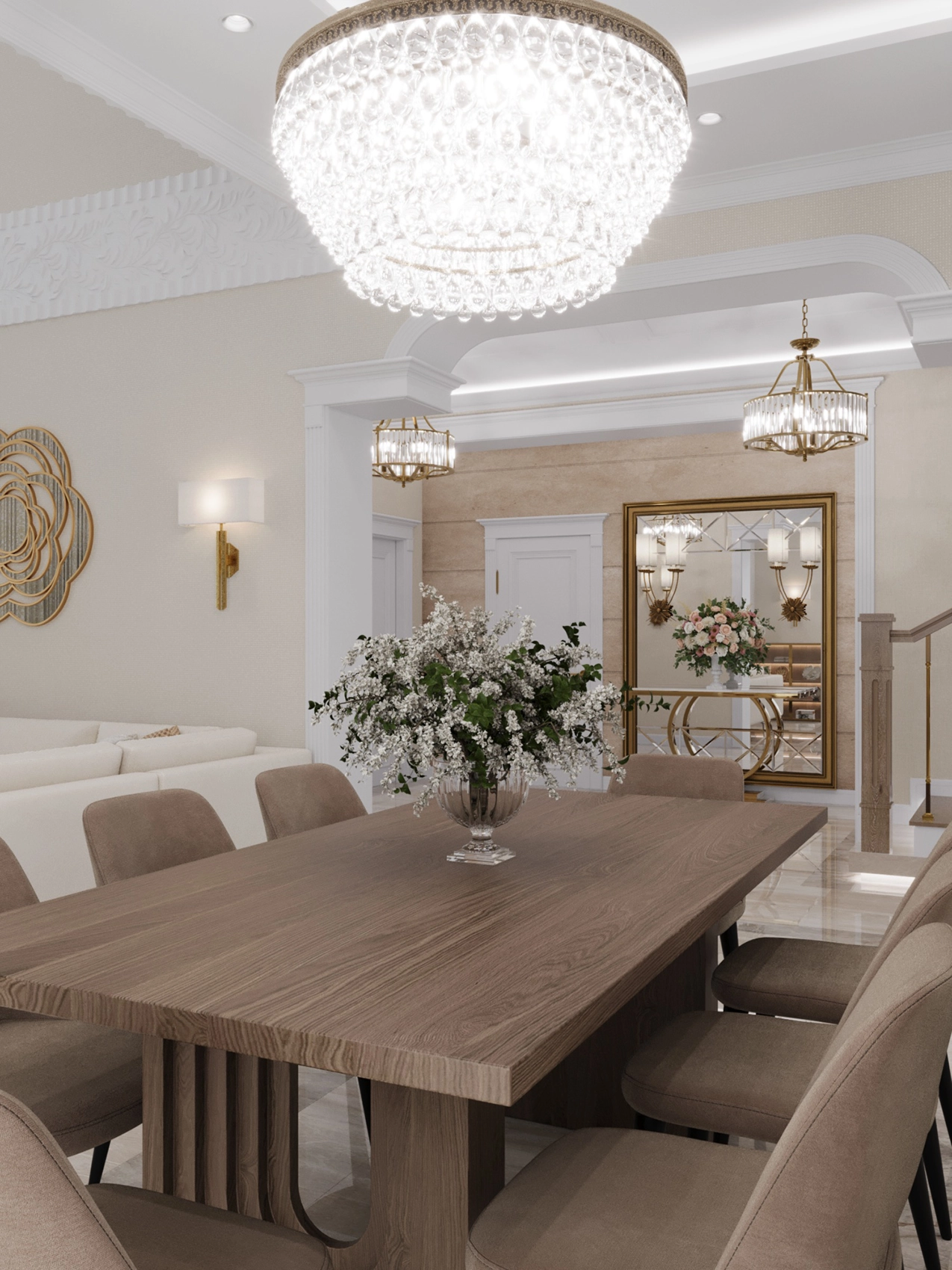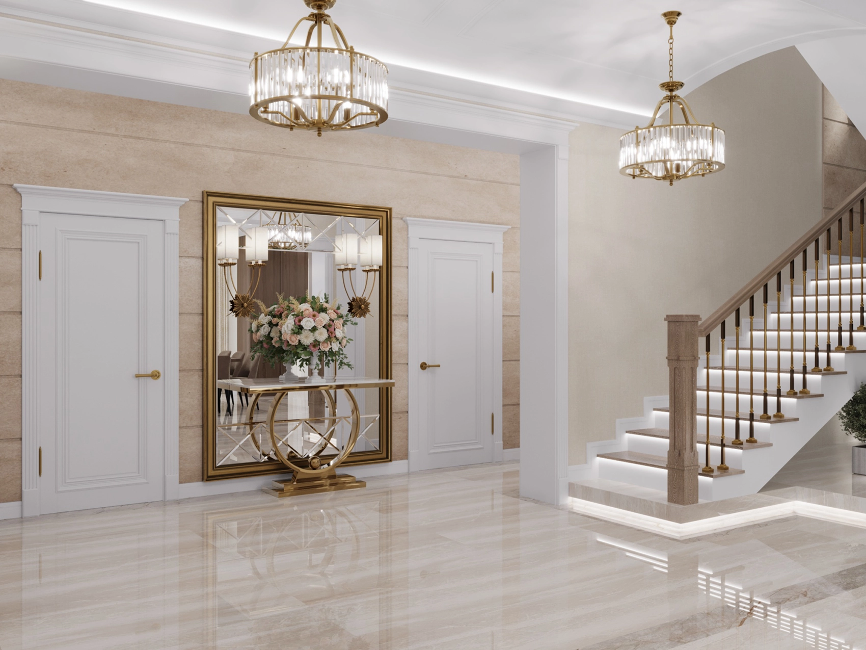 Первый этаж, где расположена двусветная гостиная с панорамными окнами, обязан выглядеть парадно и помпезно. Здесь царит атмосфера роскоши: глянцевый керамогранит с рисунком под натуральный камень, многоярусные хрустальные люстры над кухонным островом и столовой группой, а также витрины с тонированным стеклом. Кухня сочетает в себе теплоту шпона дерева и элегантность белых фасадов с классической филенкой.