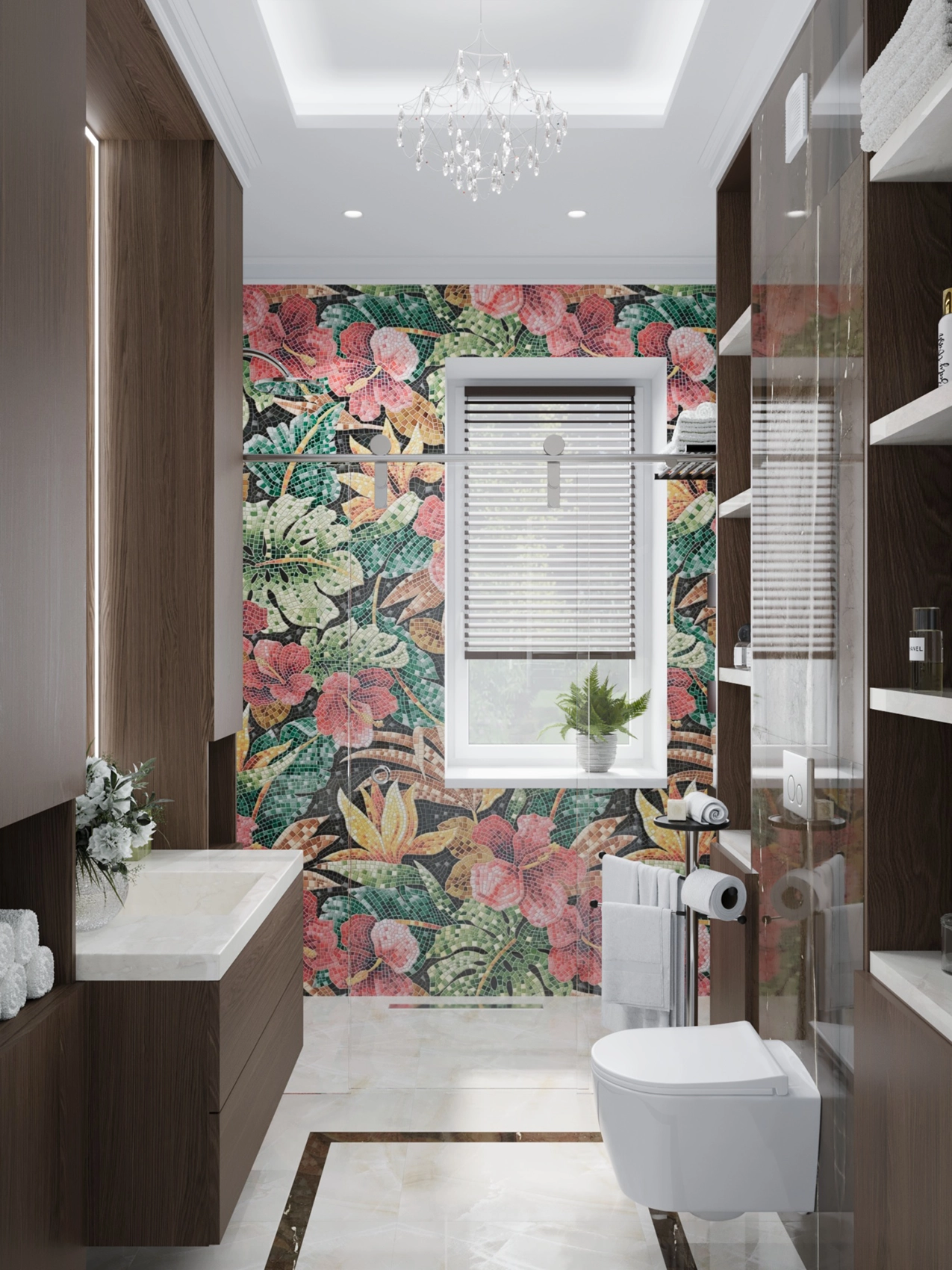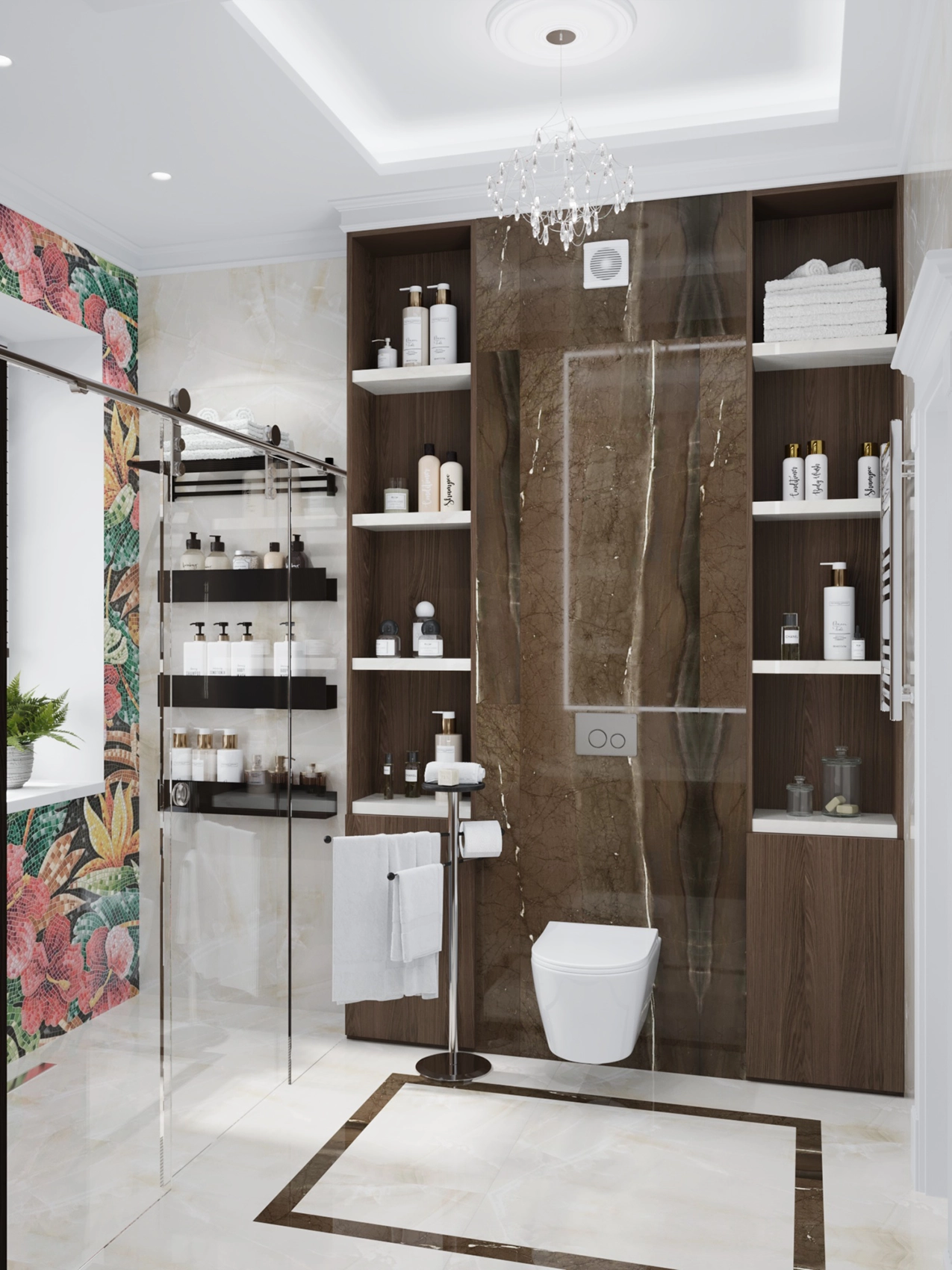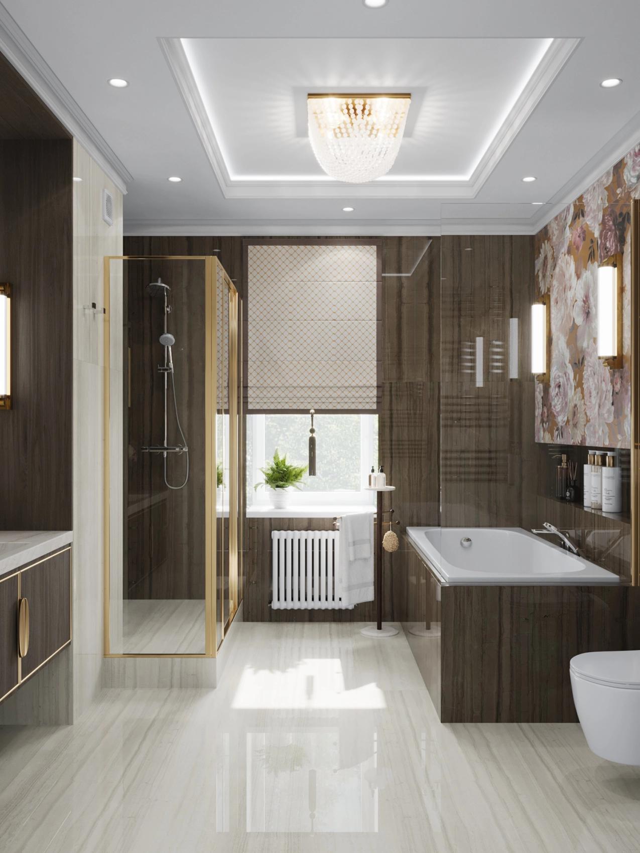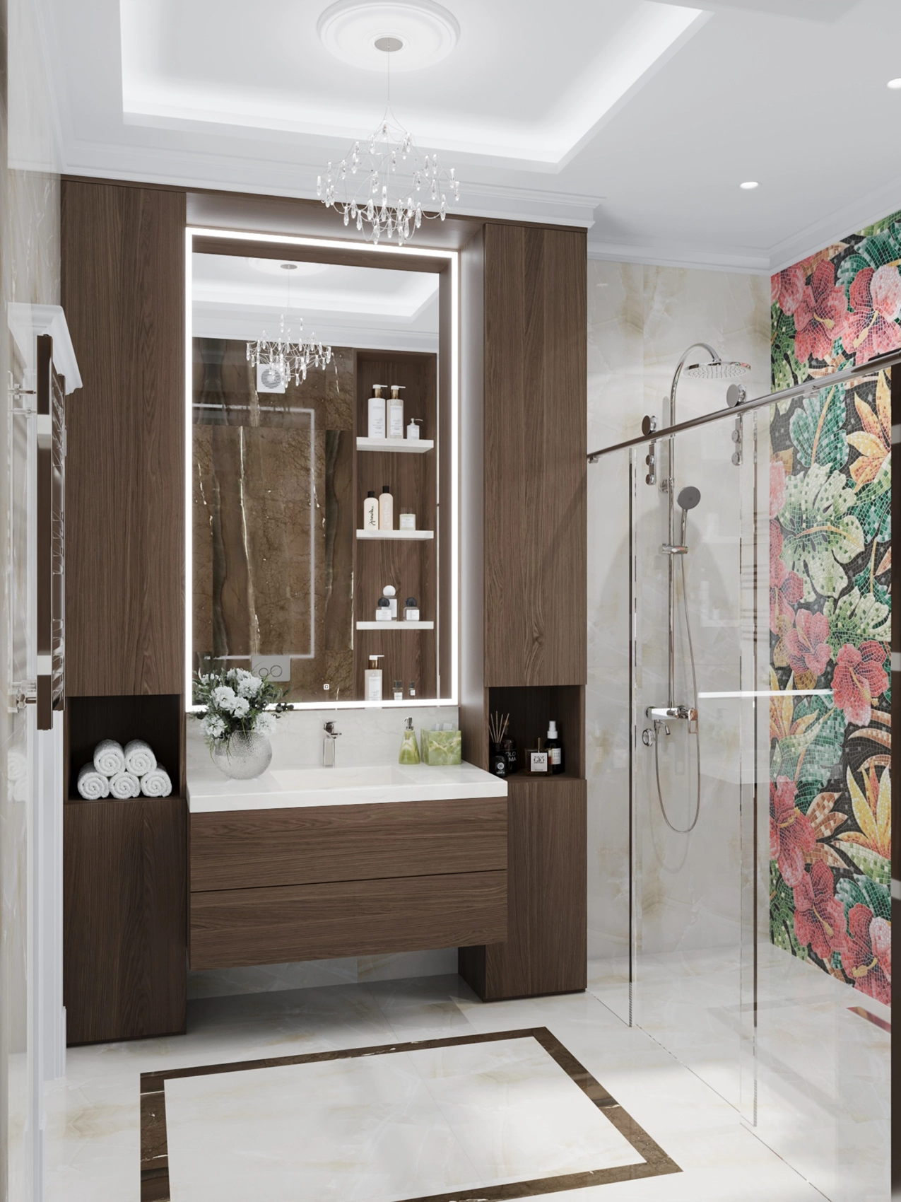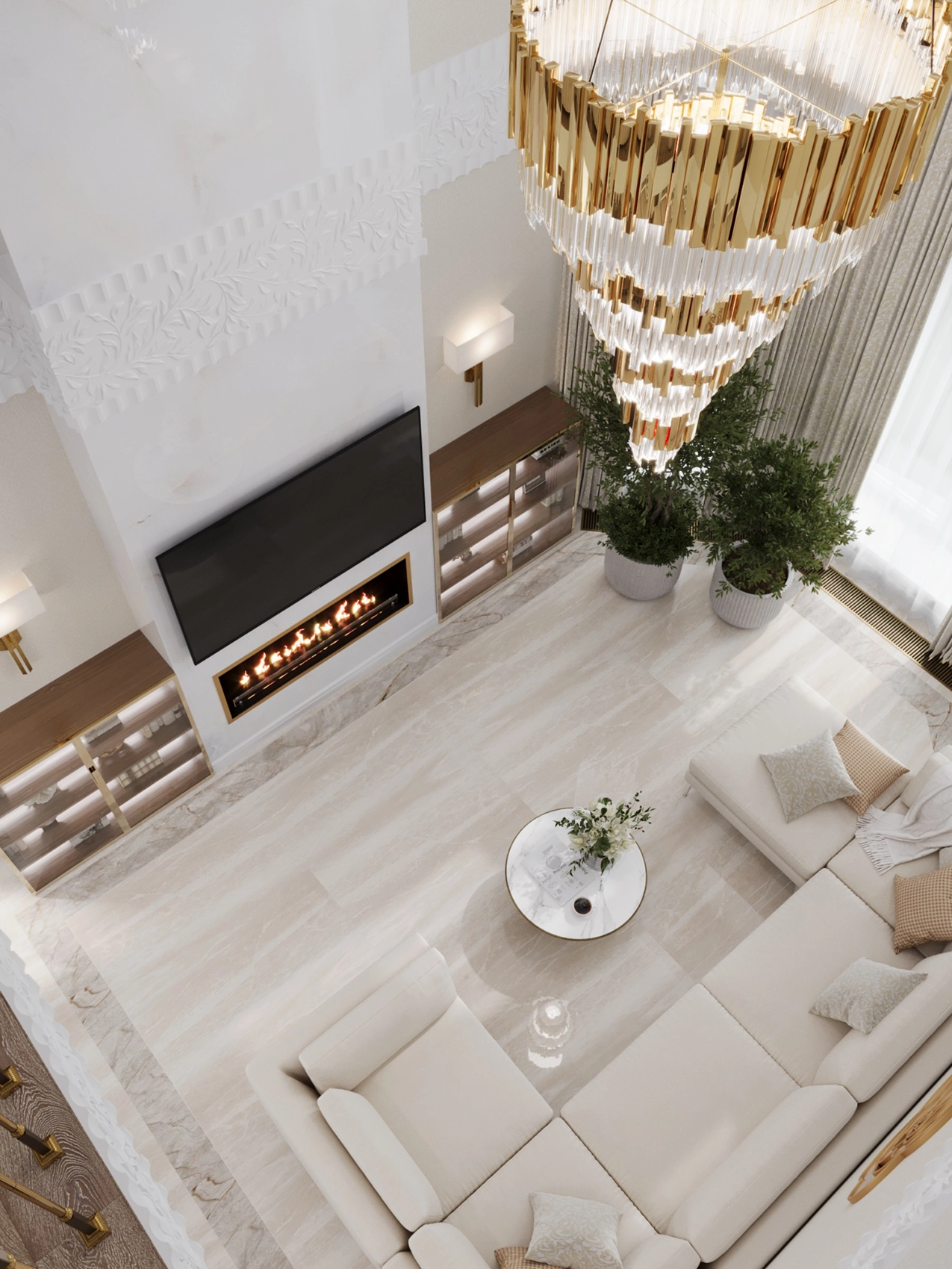 Первый этаж, где расположена двусветная гостиная с панорамными окнами, обязан выглядеть парадно и помпезно. Здесь царит атмосфера роскоши: глянцевый керамогранит с рисунком под натуральный камень, многоярусные хрустальные люстры над кухонным островом и столовой группой, а также витрины с тонированным стеклом. Кухня сочетает в себе теплоту шпона дерева и элегантность белых фасадов с классической филенкой.