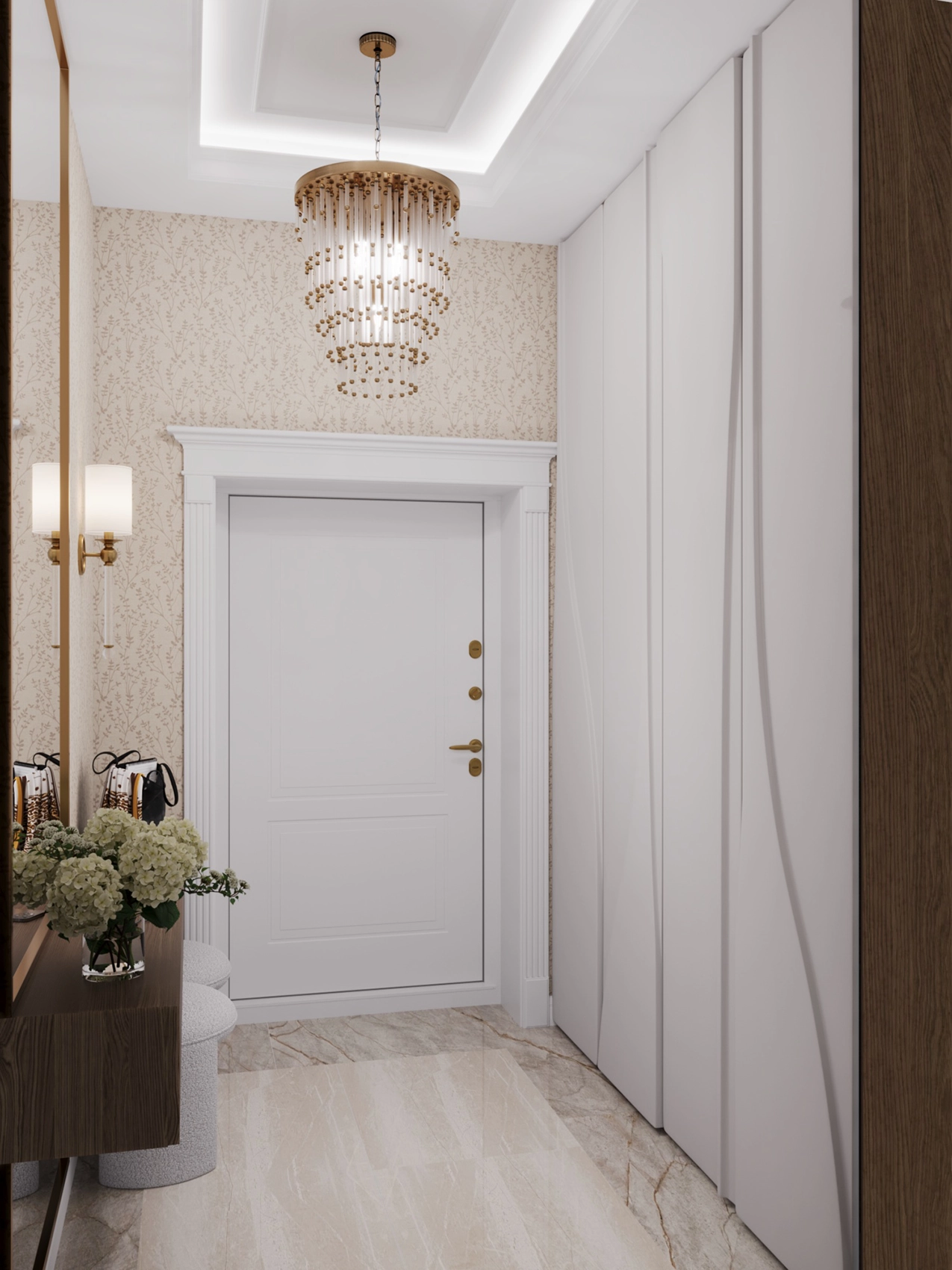В прихожей я использовала шкафы с 3D-фрезеровкой, напоминающей волны, что сразу задает ритм всему дому. Световой дизайн разработан с учетом максимального освещения разных зон с возможностью многослойного сценария. Это позволяет визуально трансформировать интерьер, делая его торжественным при приеме гостей или камерным, когда хозяева хотят уединиться.
