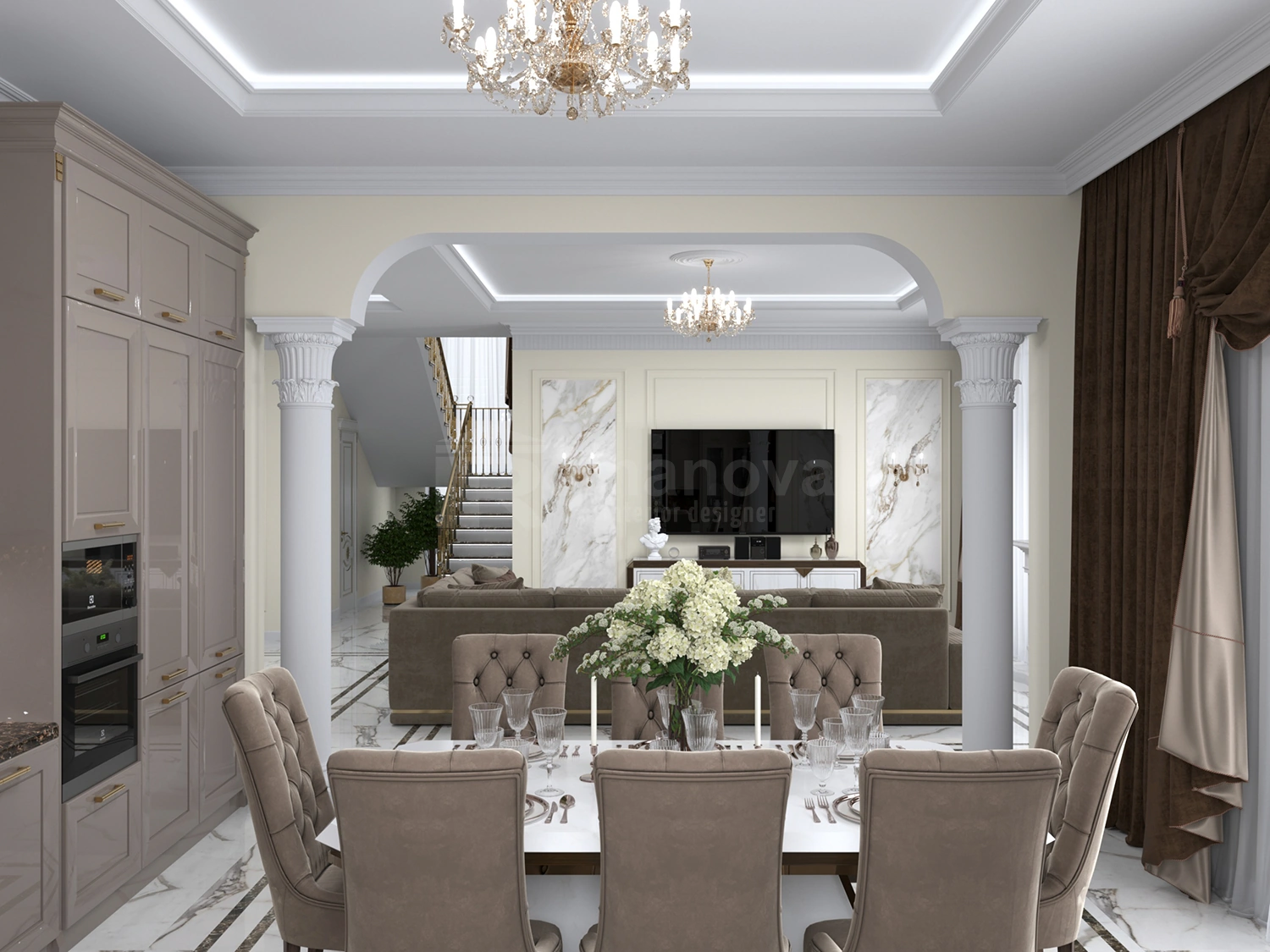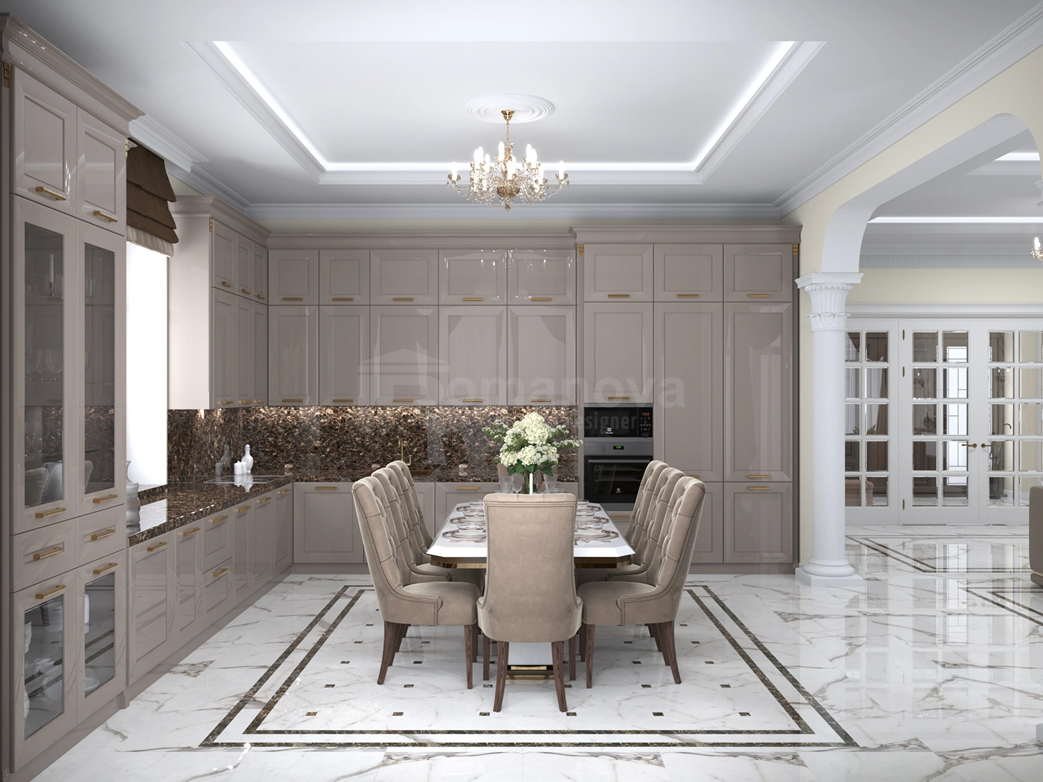 Разработанный дизайн-проект интерьера, с учётом изысканной мебели, разных дизайнерских приёмов оформления пространства, предметов декора и разнообразной подсветки, дизайнеру удалось создать роскошный, элегантный и при этом сдержанный интерьер, который способствует атмосфере расслабленности и отдыха всей семьи и приглашённых гостей.