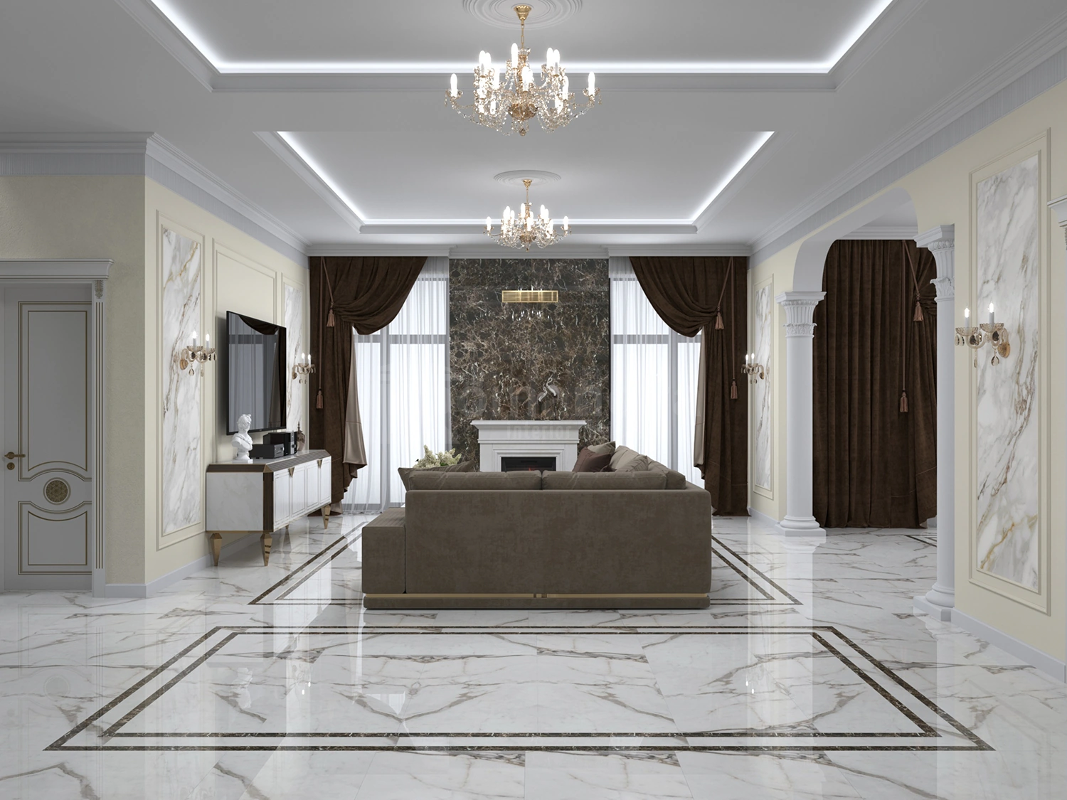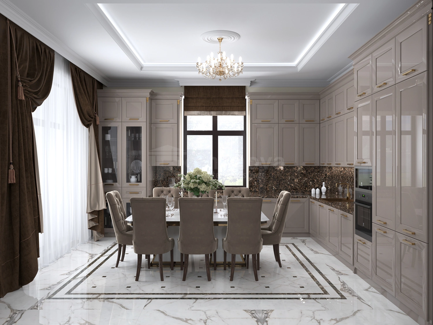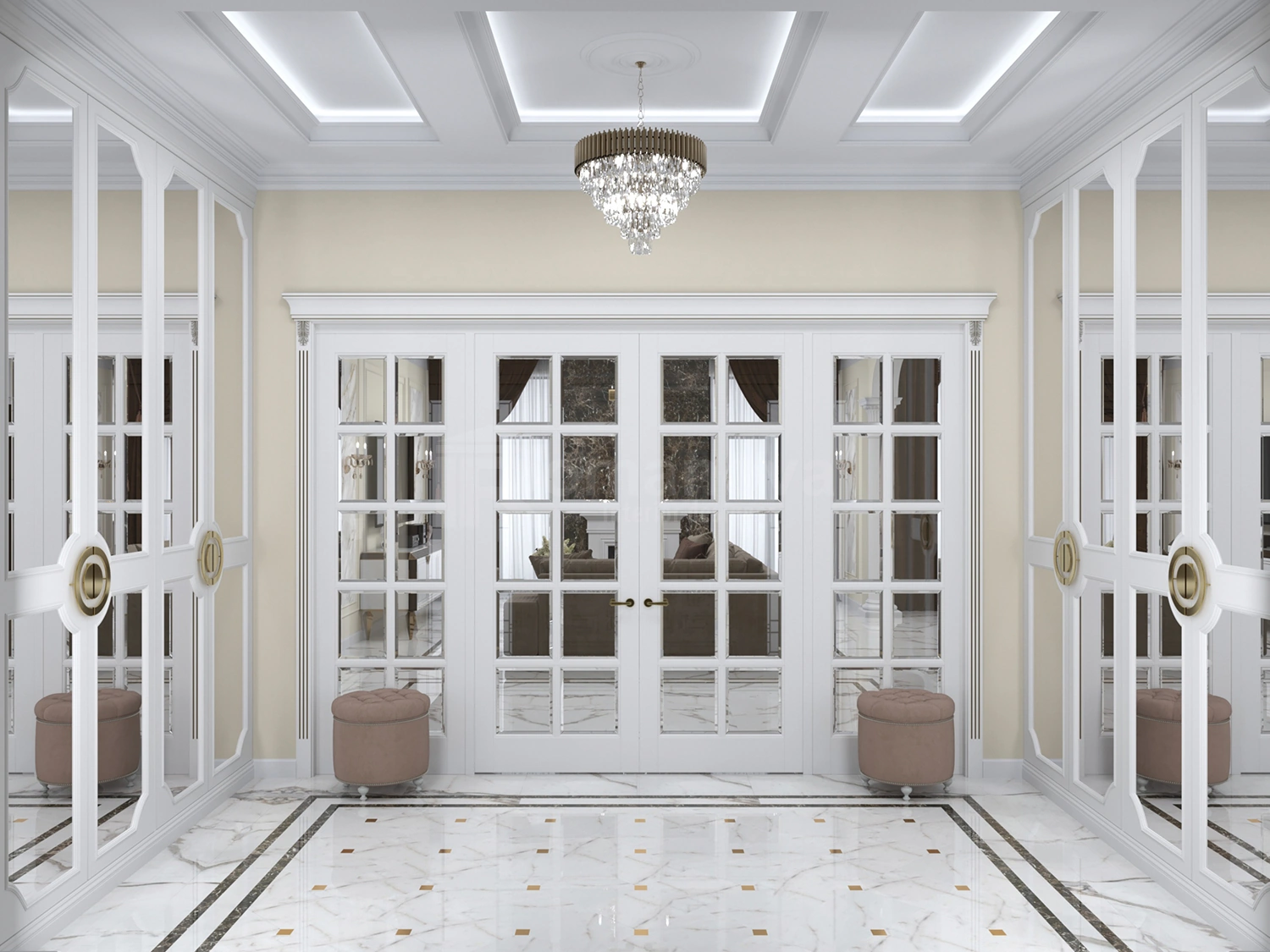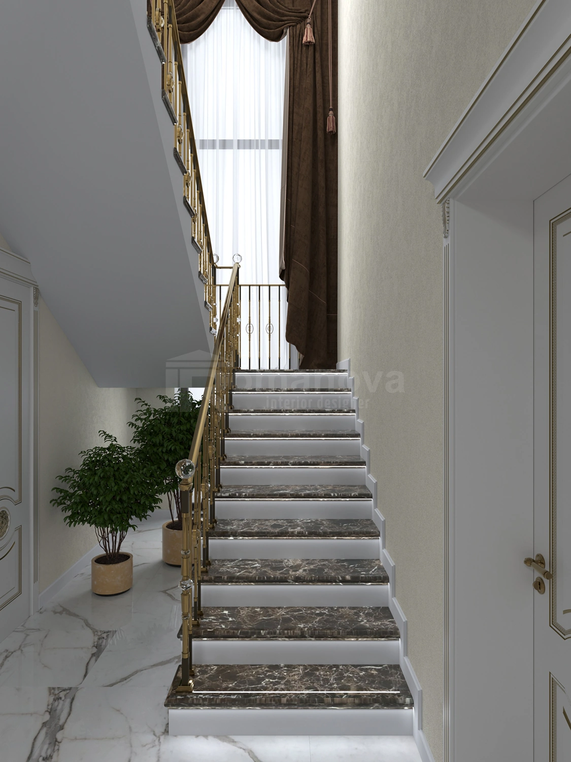 Интерьерное решение выполнено с учётом пожеланий хозяев, они любят светлые тона с добавлением тёмных акцентных деталей, а также золота и глянца, поэтому стиль неоклассика идеально подошёл для интерьерного решения дома.