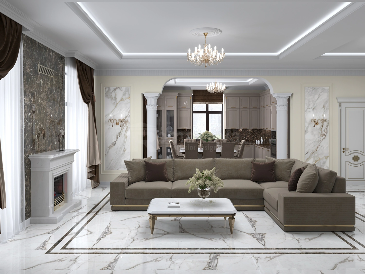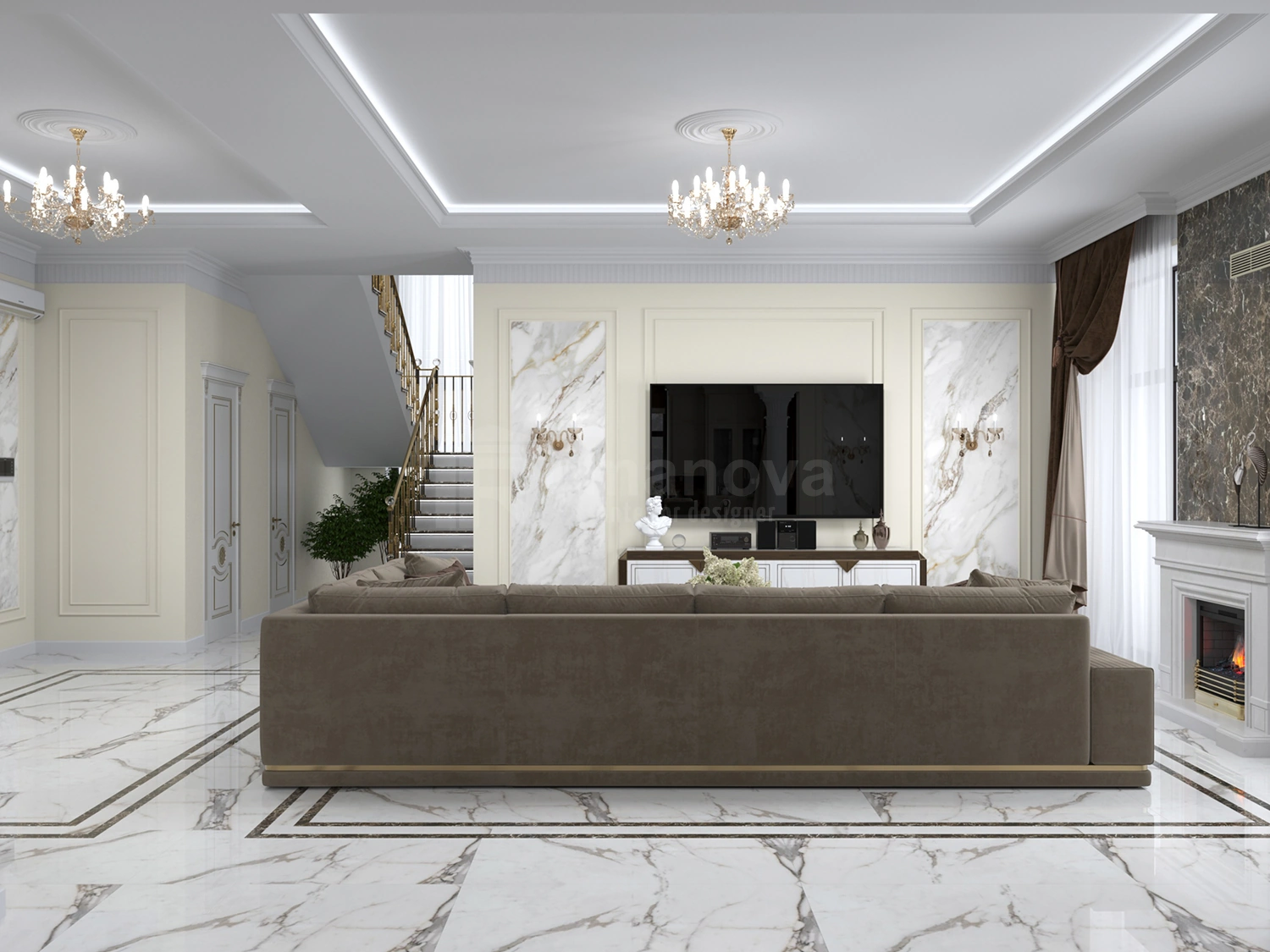 Роскошь и благородство присущие неоклассическому стилю, который отражён во всех деталях интерьерного решения, привносит атмосферу респектабельности, комфорта и уюта. Цветовая палитра для отделки стен и пола, добавляет интерьеру ощущения элегантности, выбранная палитра мебели и текстиля, добавляет штрихи шика, а имеющийся в помещении гостиной камин, привносит в атмосферу энергетику уюта.