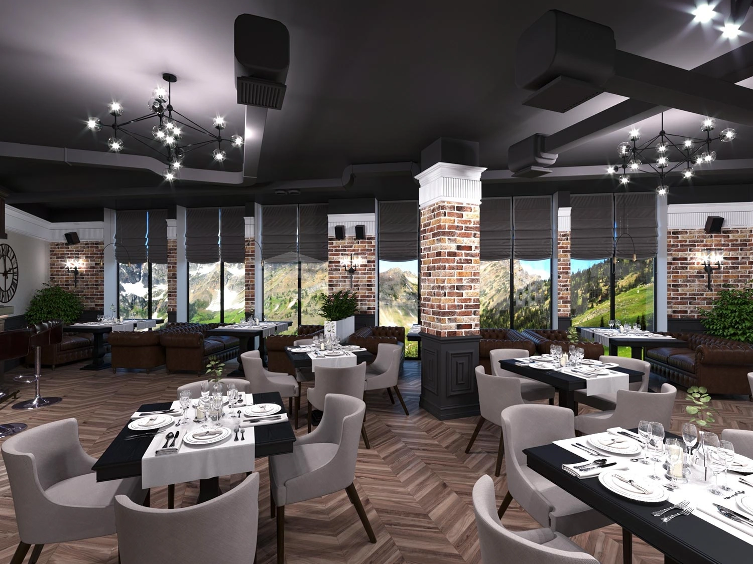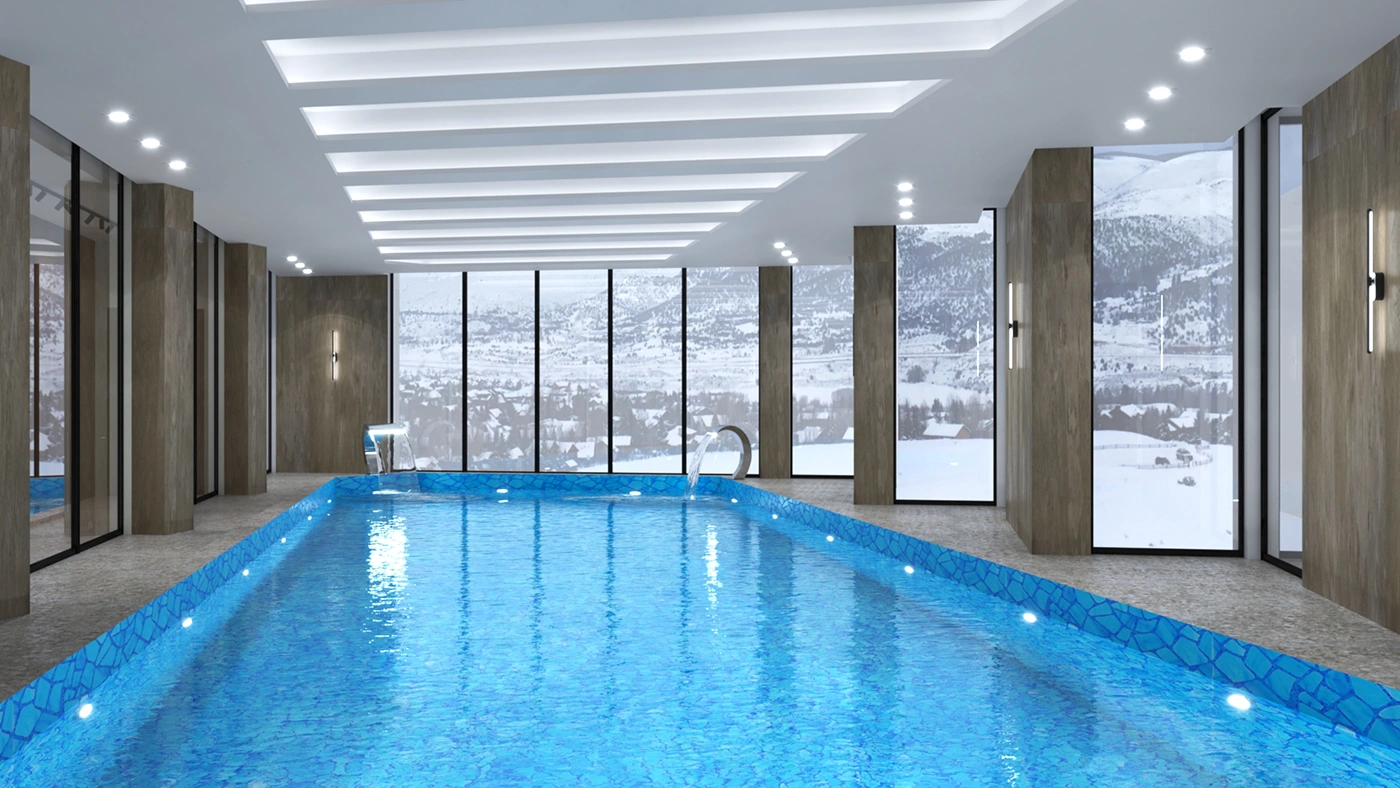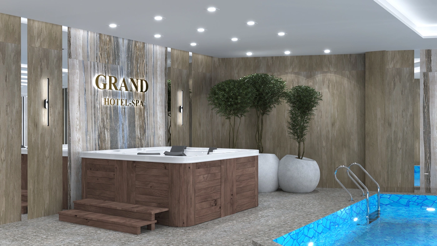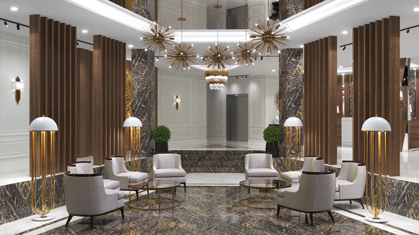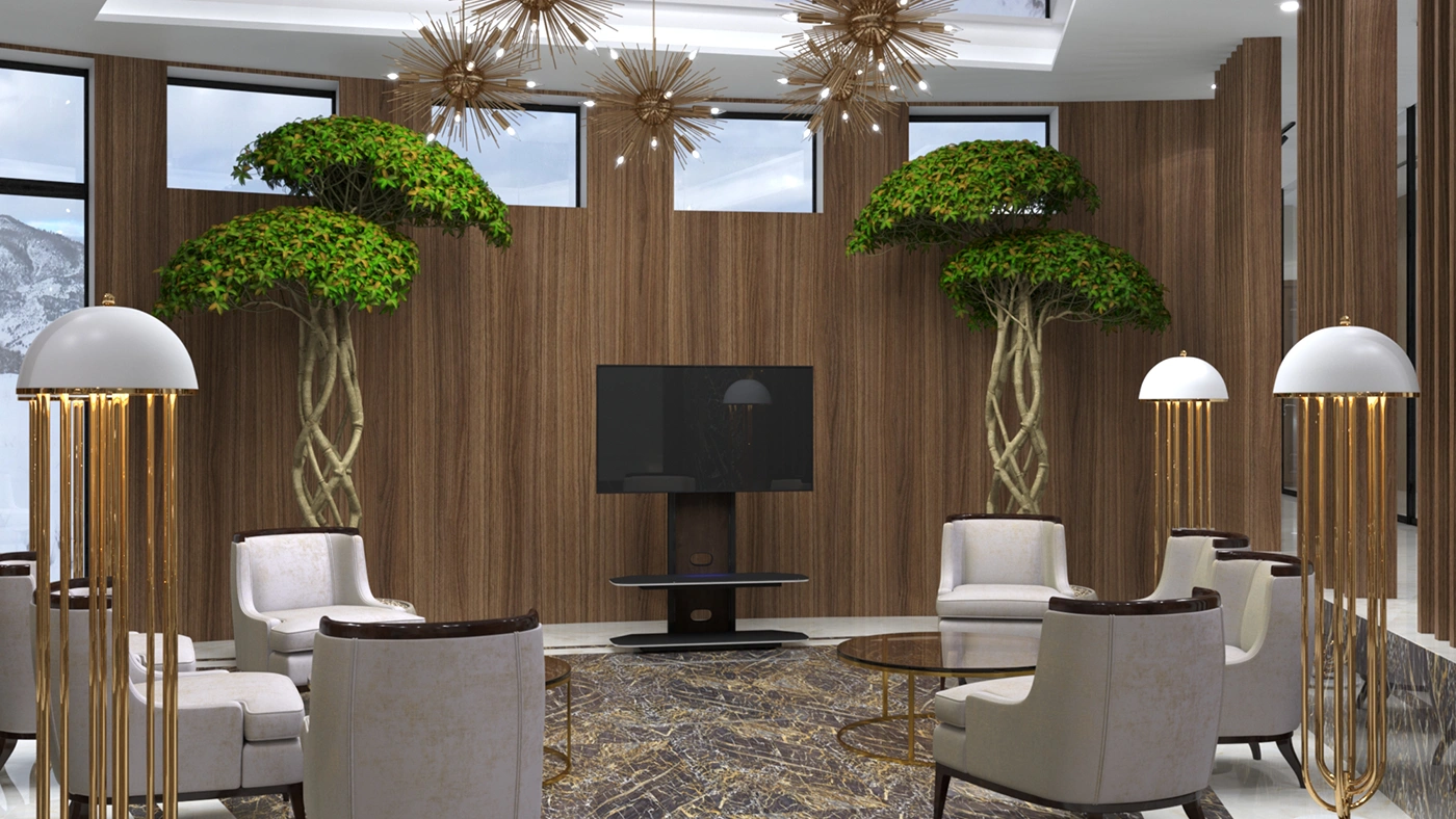 В итоге интерьеры во всех помещениях очень понравились заказчику, всё было выполнено безупречно, итог превзошёл все ожидания. Светлые тона мягко перетекают в тёмные акцентные детали тёплого ореха, зеркала и глянцевое золото подчёркивают парадность и благородство отеля. Глянцевые поверхности крупномасштабных мраморных слэбов сочетаются с матовыми поверхностями стен отделанной элегантной лепниной, а также отделка искусственным камнем в сочетании с фреской, выполненной в старинном исполнении. Уюту пространствам придаёт всевозможное озеленение, которое имеет зачастую достаточно большие масштабы. Всевозможное освещение, придаёт всем помещениям яркое и нарядное настроение. Применимое панорамное остекление во всём здании, позволяет соприкасаться с природным горным ландшафтом и быть с ним в постоянном контакте.