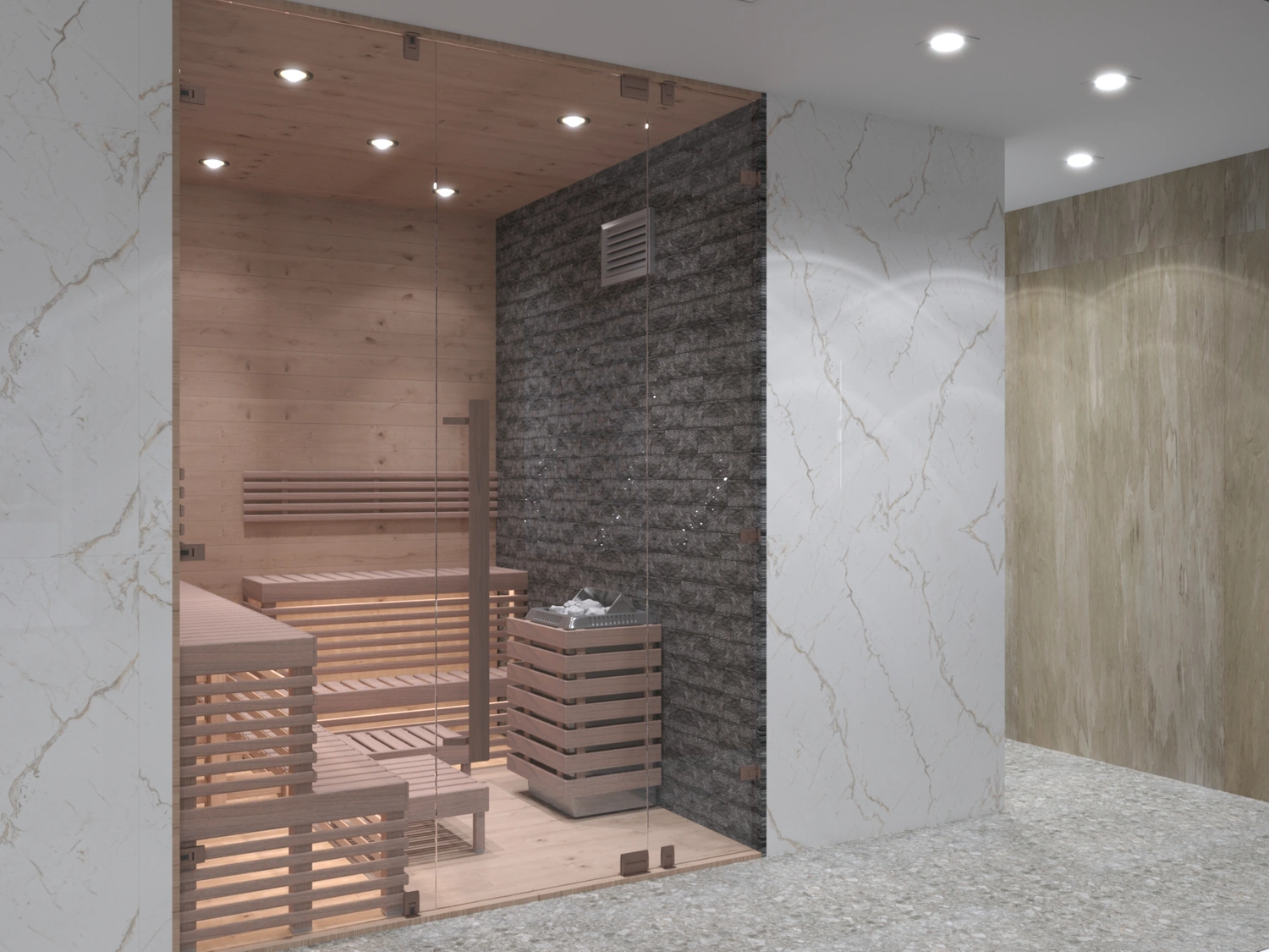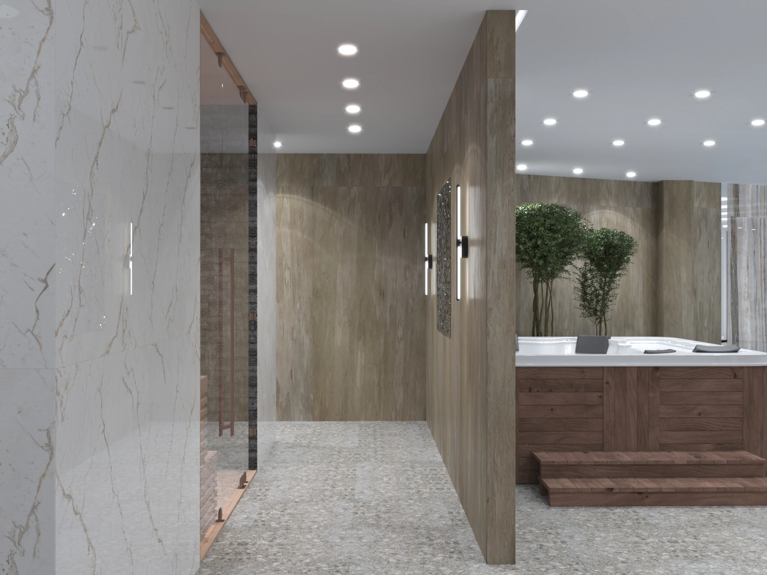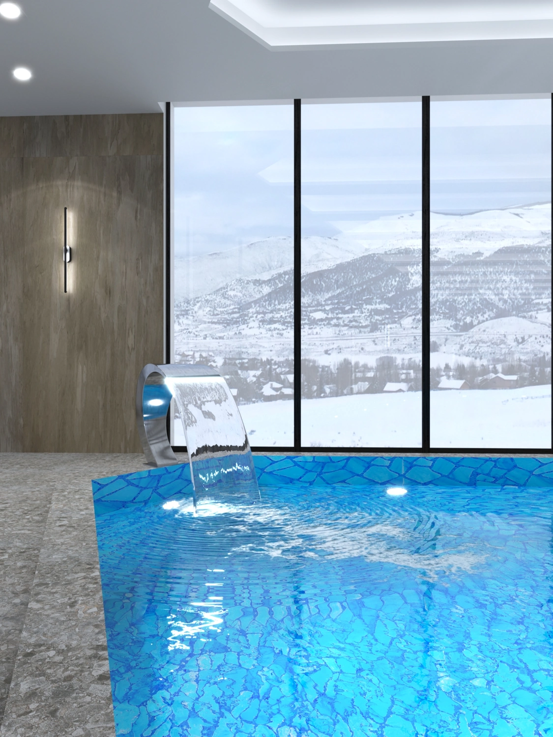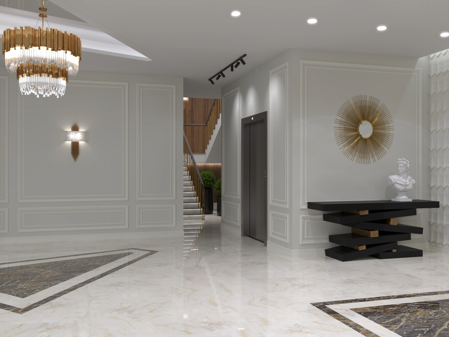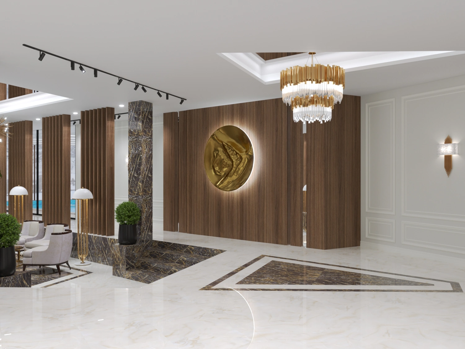 В итоге интерьеры во всех помещениях очень понравились заказчику, всё было выполнено безупречно, итог превзошёл все ожидания. Светлые тона мягко перетекают в тёмные акцентные детали тёплого ореха, зеркала и глянцевое золото подчёркивают парадность и благородство отеля. Глянцевые поверхности крупномасштабных мраморных слэбов сочетаются с матовыми поверхностями стен отделанной элегантной лепниной, а также отделка искусственным камнем в сочетании с фреской, выполненной в старинном исполнении. Уюту пространствам придаёт всевозможное озеленение, которое имеет зачастую достаточно большие масштабы. Всевозможное освещение, придаёт всем помещениям яркое и нарядное настроение. Применимое панорамное остекление во всём здании, позволяет соприкасаться с природным горным ландшафтом и быть с ним в постоянном контакте.