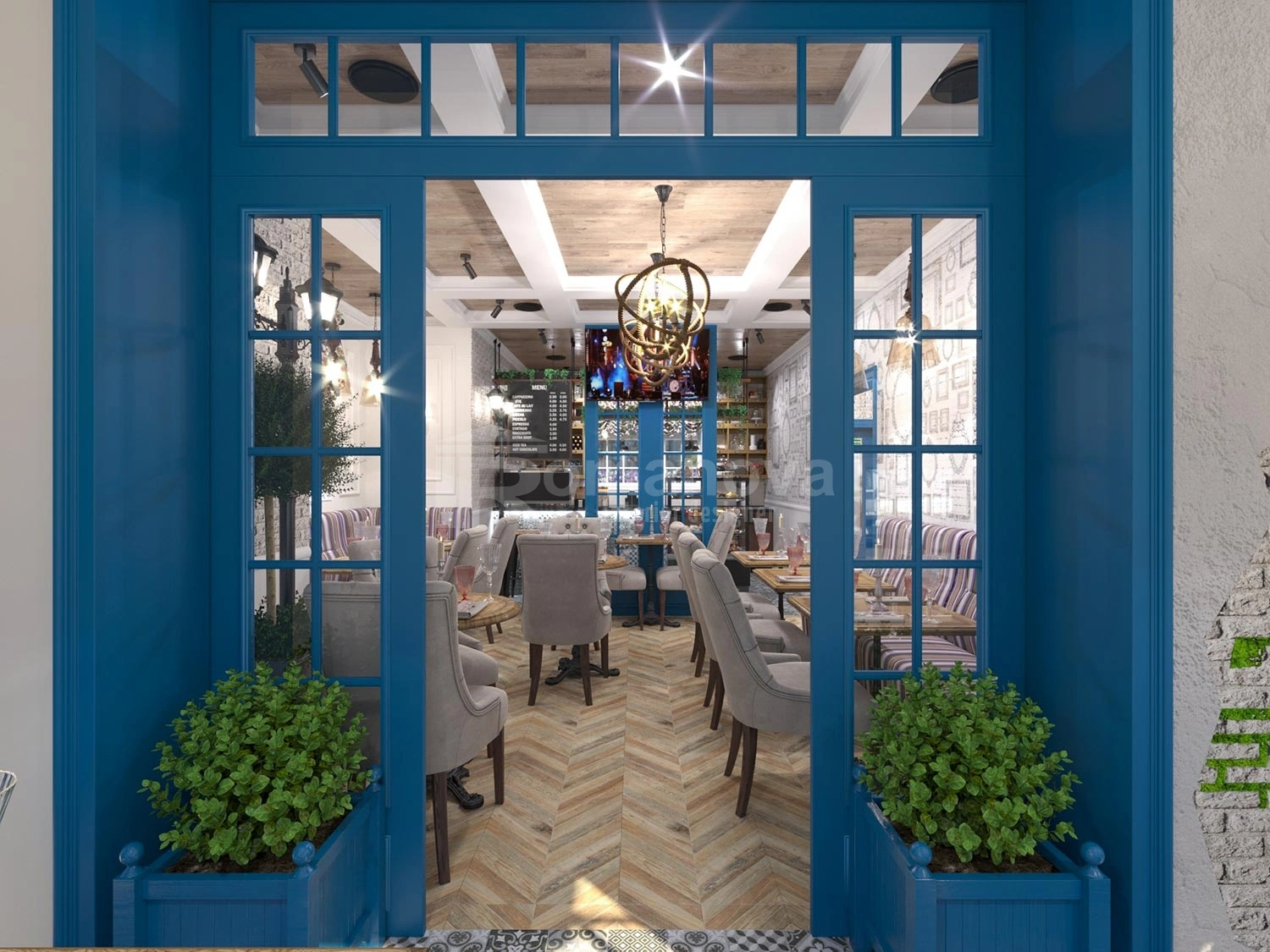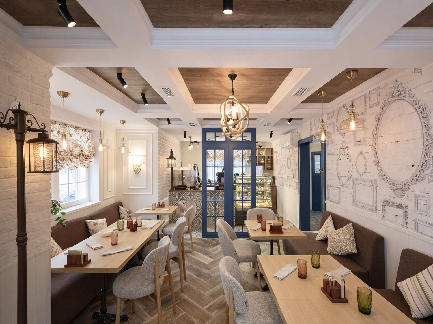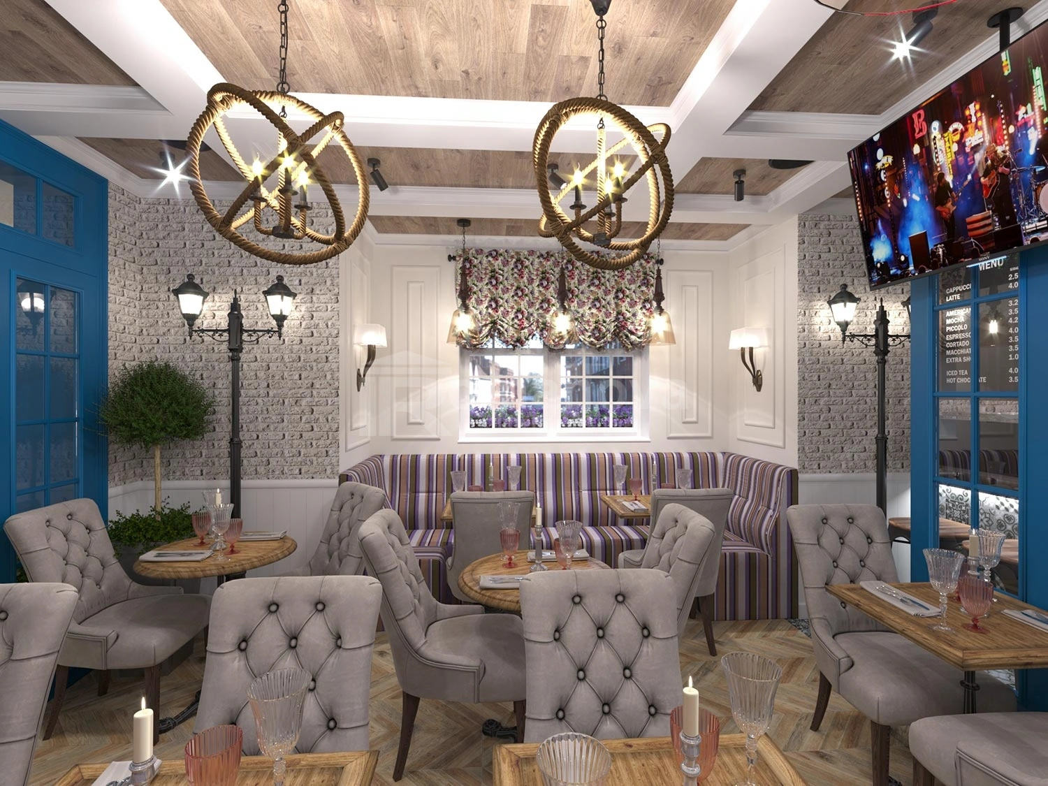 Интерьер двухэтажного кафе-кондитерской пекарни в стиле прованс с элементами стиля лофт