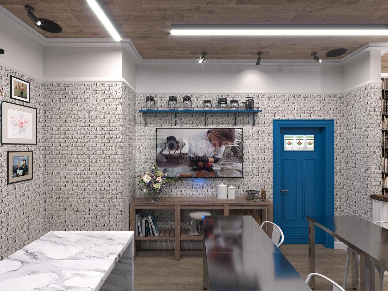 Концепция кафе состоит в том, чтобы не только печь и продавать вкуснейшие десерты, но и уютно расположившись там же угощаться ими, а также в концепции хозяйки дома, иметь возможность проводить мастерклассы по обучению кондитерского дела, так как она сама является профессиональным кондитером для этого на втором этаже дома спроектировали зал для занятий по обучению приготовления сладких десертов.