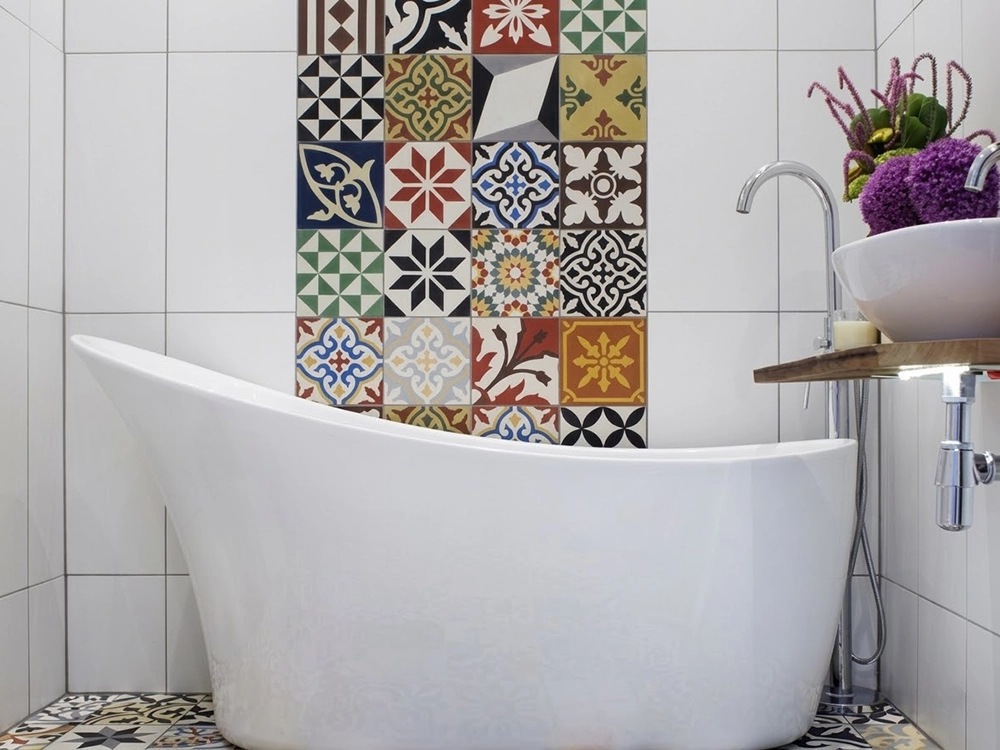 Подобного рода плитка в дизайне интерьера загородного дома или интерьера квартиры привнесёт ритм, движение она станет «звездой» в оформленном ею пространстве. Так как плитка достаточно динамична в рисунке, использовать её надо обязательно с плиткой нейтральной палитры, чтобы она не затмевала глаз от истинного функционального назначения помещения.