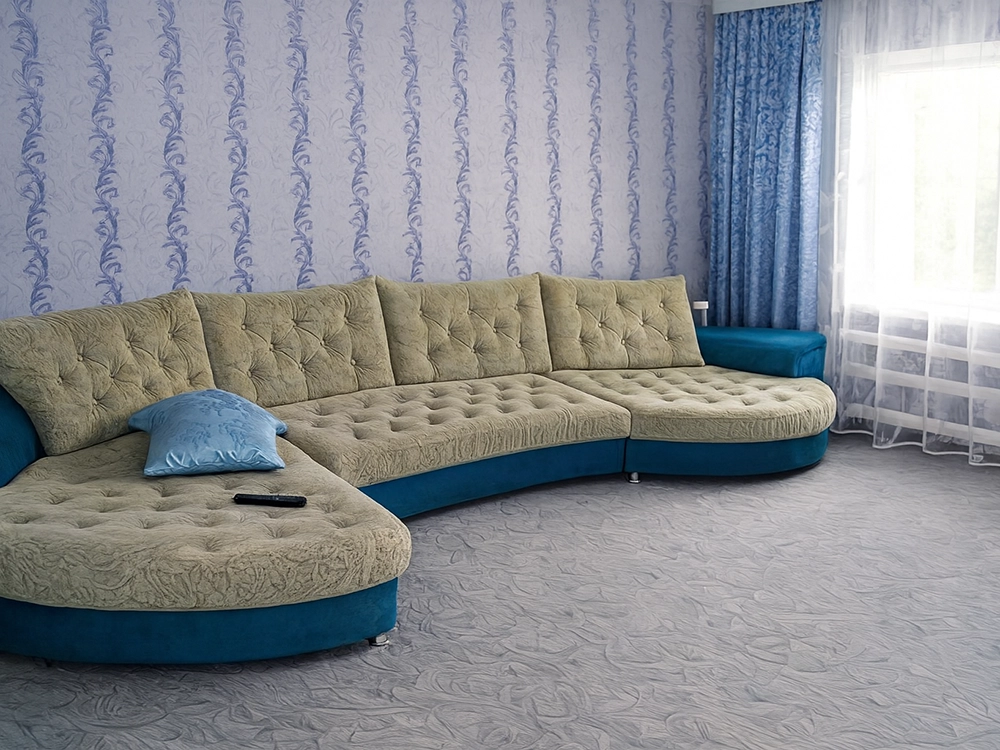 Затем нужно приобрести дополнительные портьеры для украшения зоны окна, т. к. имеющихся синих с рисунком портьер недостаточно. Вторые портьеры должны быть вывешены на передней линии и подхвачены синими кистями на шнурах, а также дополнительно могут быть украшены декоративной тесьмой. В результате двойные портьеры станут смотреться более элегантно и нарядно. Принципиальным моментом является правильное расположение штор на карнизе, а именно синие портьеры должны быть расположены ближе к тюлю и должны свисать до пола без подхватов, а вторые портьеры будут являться дополнительными и в большей степени декоративными, т. к. вывесить их надо на передний план. Они должны быть однотонными в цвете «слоновая кость», светло-сером или светлый хаки, к тому же данные портьеры могут быть выполнены из портьерной рогожки, льна или хлопка, т. к. такое сочетание будет наиболее выигрышно смотреться, нежели из подобной ткани, что и основные шторы. Дополнительно для украшения дивана из второго вида ткани нужно сшить пару подушек: