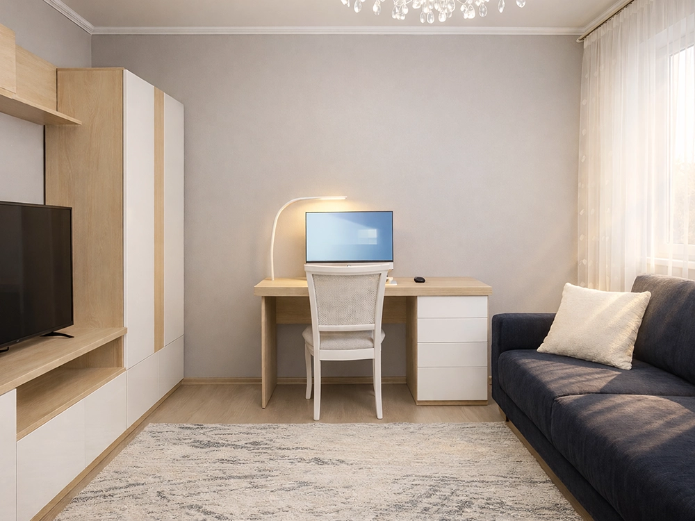 Здравствуйте! Подскажите, пожалуйста, как можно оформить стену, где стоит стол с компьютером. Она кажется какой-то незавершённой. На Ваш взгляд, будут ли уместны молдинги?