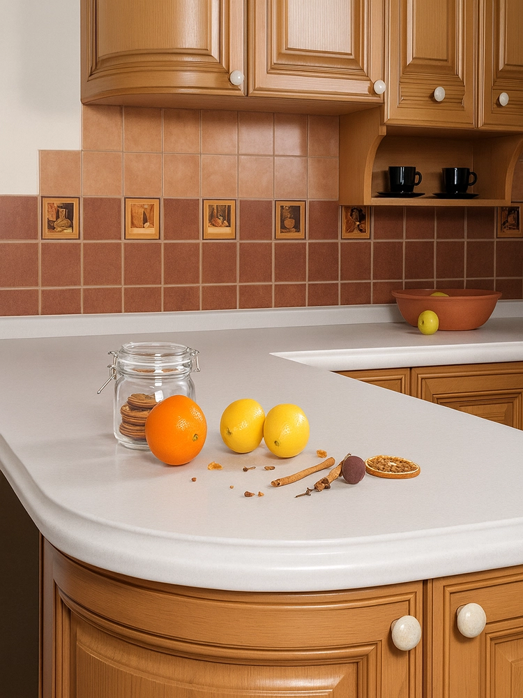 Уважаемая Ирина, во-первых, большое спасибо Вам за совет. Мне очень понравилось Ваше предложение по выбору цвета столешницы и дополнительных аксессуаров. Я уже так загорелась побыстрее все сделать, как Вы мне советуете. Только вот еще один маленький вопрос. Столешницу выбирать однотонную светлую или можно выбрать с небольшими фрагментами, только чтобы тон был светлый? Дело в том, что остановила выбор на немецкой столешнице фирмы «Дюропал», и из светлых тонов этой фирмы мне понравилась столешница «Бежевый ситец» 7431 или «Антарктида» 6480. Но так как воображение отсутствует полностью, не могу принять решение. А очень хотелось бы встретить Новый год в новой кухне.