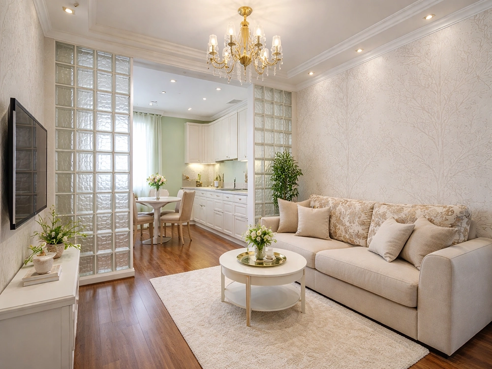 Здравствуйте! Подбираем шторы и диван в гостиную. Комната небольшая, соединена широким проходом с кухней. На стенах белые обои с рисунком из серебристых веток, пол - паркет мербау, подоконники из искусственного камня, цвет - светло-бежевый. Люстра золотого цвета, как и точечные светильники по периметру комнаты. Кухню мы оформили так. Сам гарнитур светло-бежевый, стены светло-зеленые, диван - сочетание бежевой и ткани с цветочным рисунком, паркет тоже мербау. В перегородке, отделяющей гостиную от кухни - прозрачные стеклоблоки.