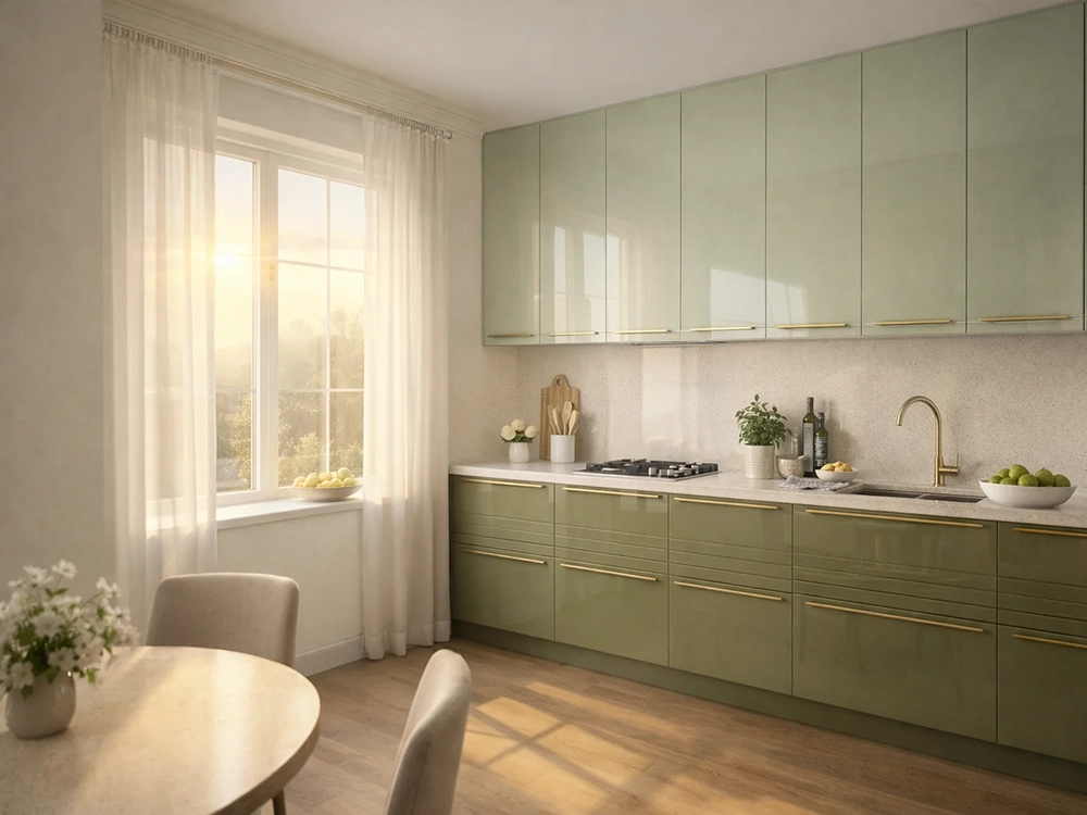Цветовое решение для кухни с фисташковыми фасадами