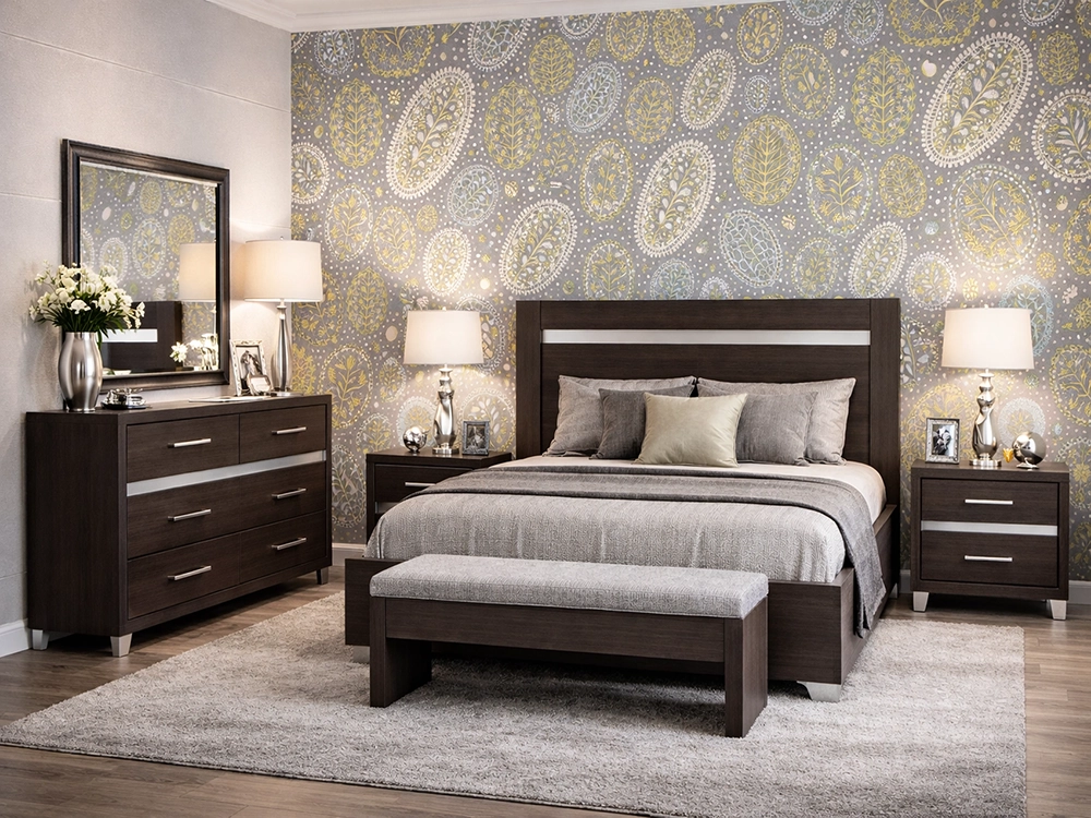 Наилучшим фоном для интерьера спальни в сочетании с купленным вами спальным гарнитуром будет серый цвет для стен. Данный цвет может быть как в более темном, так и в более светлом исполнении. Обои для одного помещения можно применить и с рисунком, и без рисунка. С рисунком расположить на всей стене за изголовьем кровати, обои фоновые без рисунка на остальных стенах. Дополнительным и наиболее подходящим цветом для декора помещения могут быть в трех вариантах на выбор, они наиболее освежат и дополнят интерьер спальни: «слоновая кость», кремово-розовый и салатово-оливковый. Данные цветовые акценты могут быть использованы в портьерах, декоративных подушках на кровать, в обивке для одного кресла, в орнаменте на обоях.