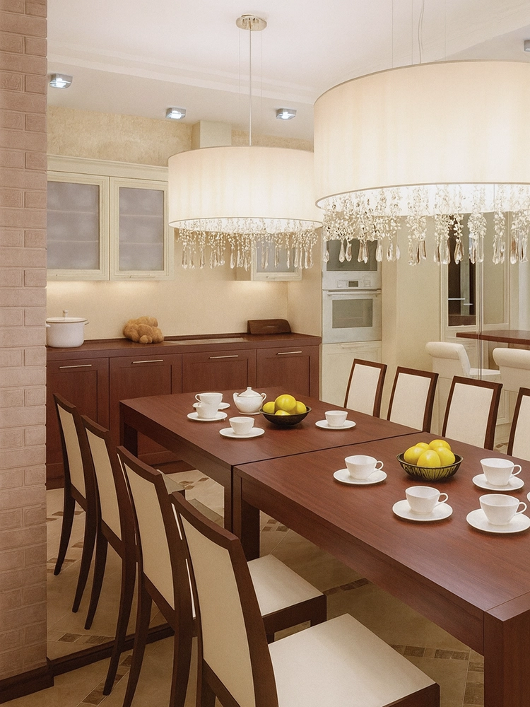 Я предложу на Ваш выбор несколько вариантов декорирования интерьера кухни. Напоминаю, что все визуальное притяжение должен взять на себя кухонный гарнитур, стена за кухонным гарнитуром, противоположная стена в столовой зоне, портьеры и центральный светильник обязательно подвесной.