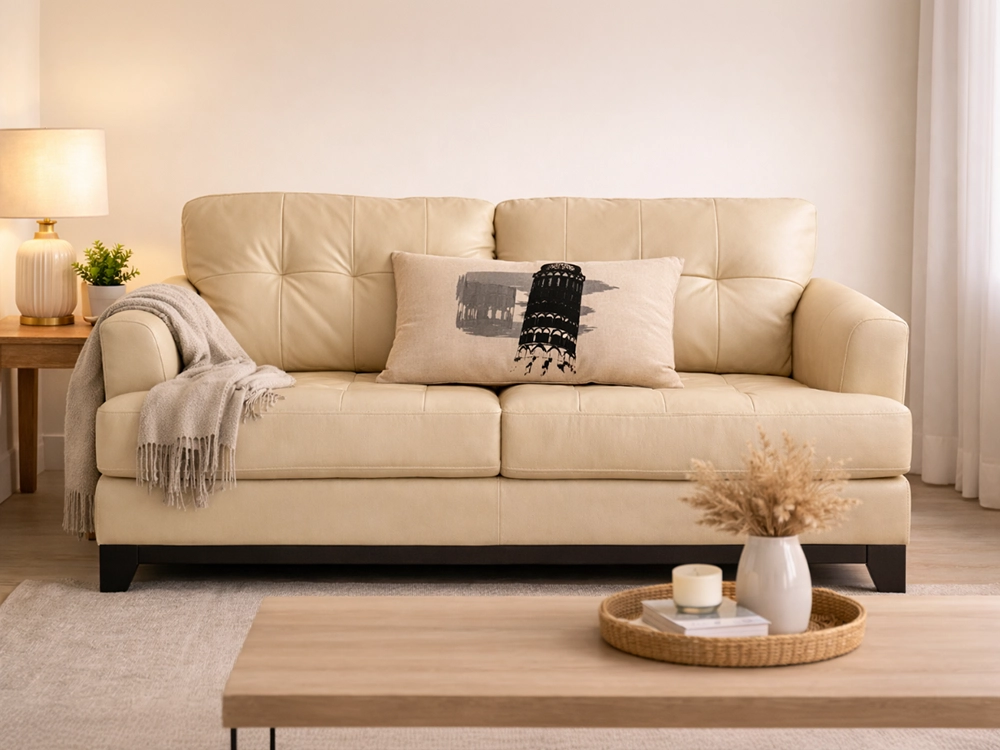 Например, в данном случае светлого цвета диван (цвет «слоновой кости») можно украсить декоративными подушками: две штуки персикового цвета, две штуки коричневого цвета, одну штуку черно-белого цвета с любым рисунком и одну штуку ворсовую светло-бежевого цвета.