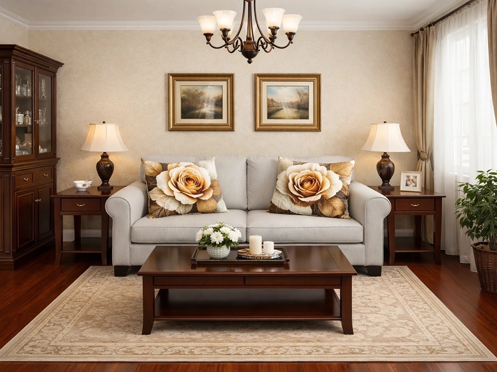 Добрый день! Очень нужен ваш совет как дизайнера интерьера! Комната является и гостиной, и спальней, комната светлая, но очень давит темная мебель. Комната где-то 20 м². Обои светло-бежевые, мебель и полы под красное дерево (мебель чуть темнее), а вот диван светло-серый с двумя большими подушками, на которых изображены большие розы бело-золотисто-коричневые. Собственно, вопрос: какого цвета шторы, тюль и ковер подойдут? Нужны однотонные или же нет?! Спасибо!