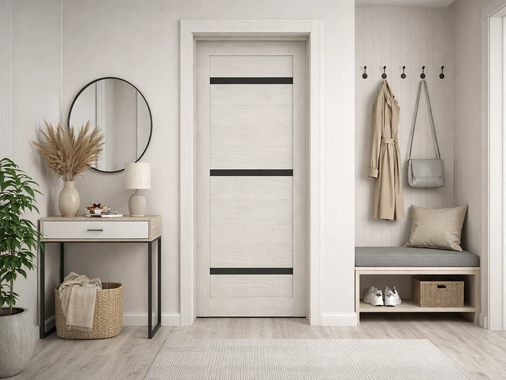 Созданная Вами палитра оформления прихожей получилась сильно забелённой, если данную цветовую палитру дополнить и подобного рода мебелью, то такой интерьер может через некоторое время надоесть, т. к. цветовая монотонность быстро надоедает. Поэтому для того, чтобы интерьер прихожей не стал выглядеть визуально полностью монотонным я рекомендую два варианта правильно подобранной меблировки на Ваш выбор.