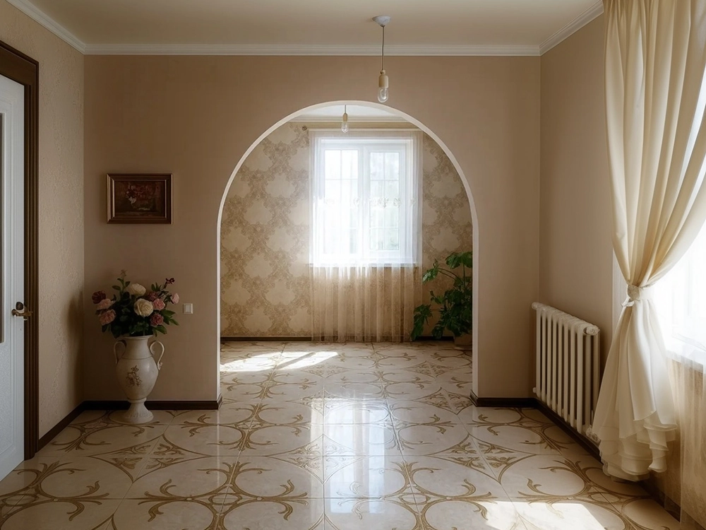 Здравствуйте, Ирина. Посоветуйте, пожалуйста, цвет и дизайн штор и тюли, люстры к уже существующему интерьеру. В кухне-столовой 3 окна, обои с трех сторон песочного цвета с неброским золотым орнаментом, одна стена такие же обои, но с крупными вензелями кофейного цвета. В гостиной эркер из 3 окон плюс еще 2 окна, одно из которых выходит на террасу. Обои в гостиной песочные однотонные с золотыми прожилками, акцентная стена обои с крупными кофейными вензелями, по этой стене расположен камин кремового цвета и планируется тумба под телевизор. По стене, где много окон расположен большой кожаный диван молочно-кремового цвета. Карнизы металлические золото-оливкового цвета, два ряда. Столовая отделена от гостиной широкой аркой. Мебель: кухню, обеденный стол, журнальный столик и тумбу под телевизор планируем белую, возможно с позолотой. Спасибо.