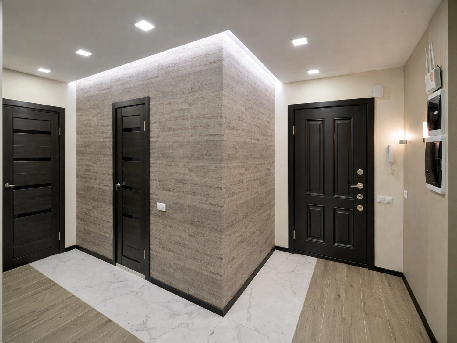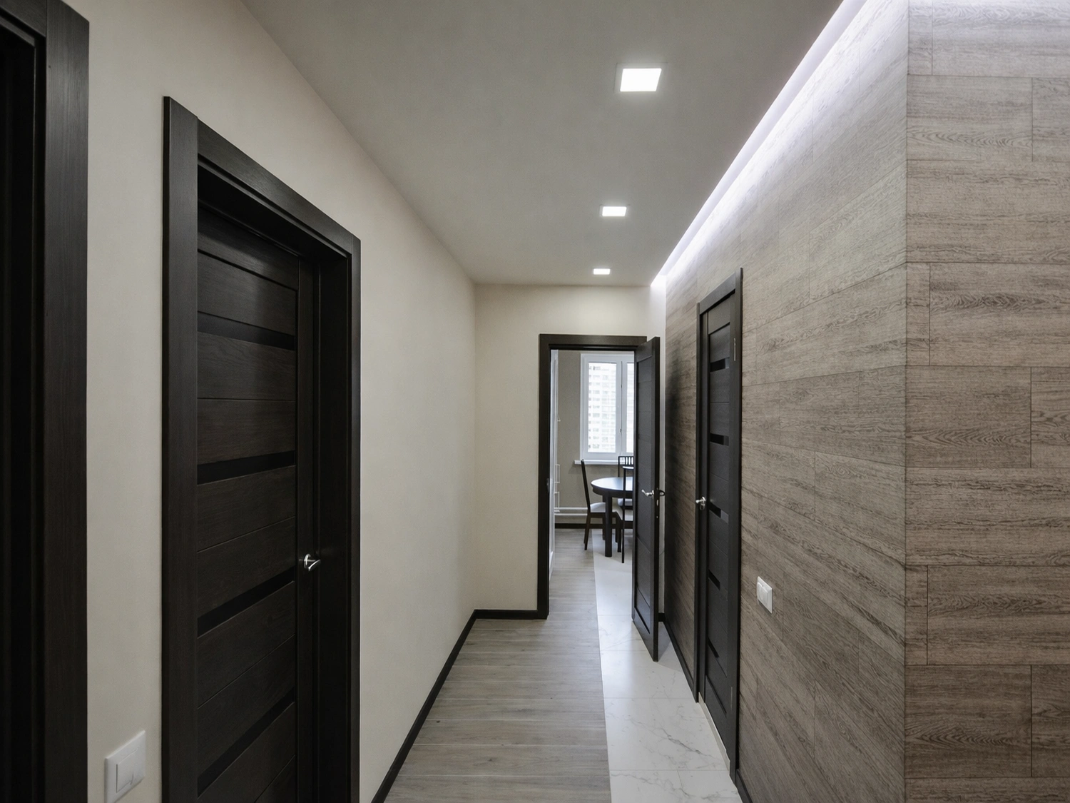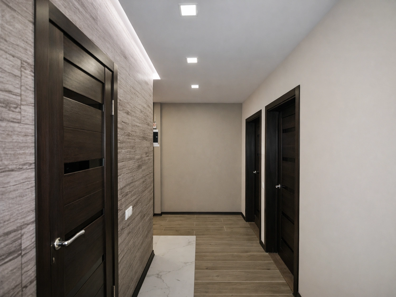 Далее, по ходу движения в жилые комнаты, керамогранит стыкуется с напольным покрытием под натуральное дерево. Мы отказались от порожков в пользу аккуратного шва, заполненного герметиком в тон, что создает единое визуальное пространство без лишних визуальных шумов. Стены в коридоре окрашены в спокойный бежевый оттенок, который служит идеальным фоном для темных межкомнатных дверей цвета венге с горизонтальными вставками.