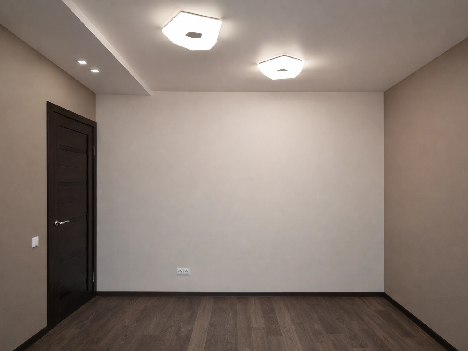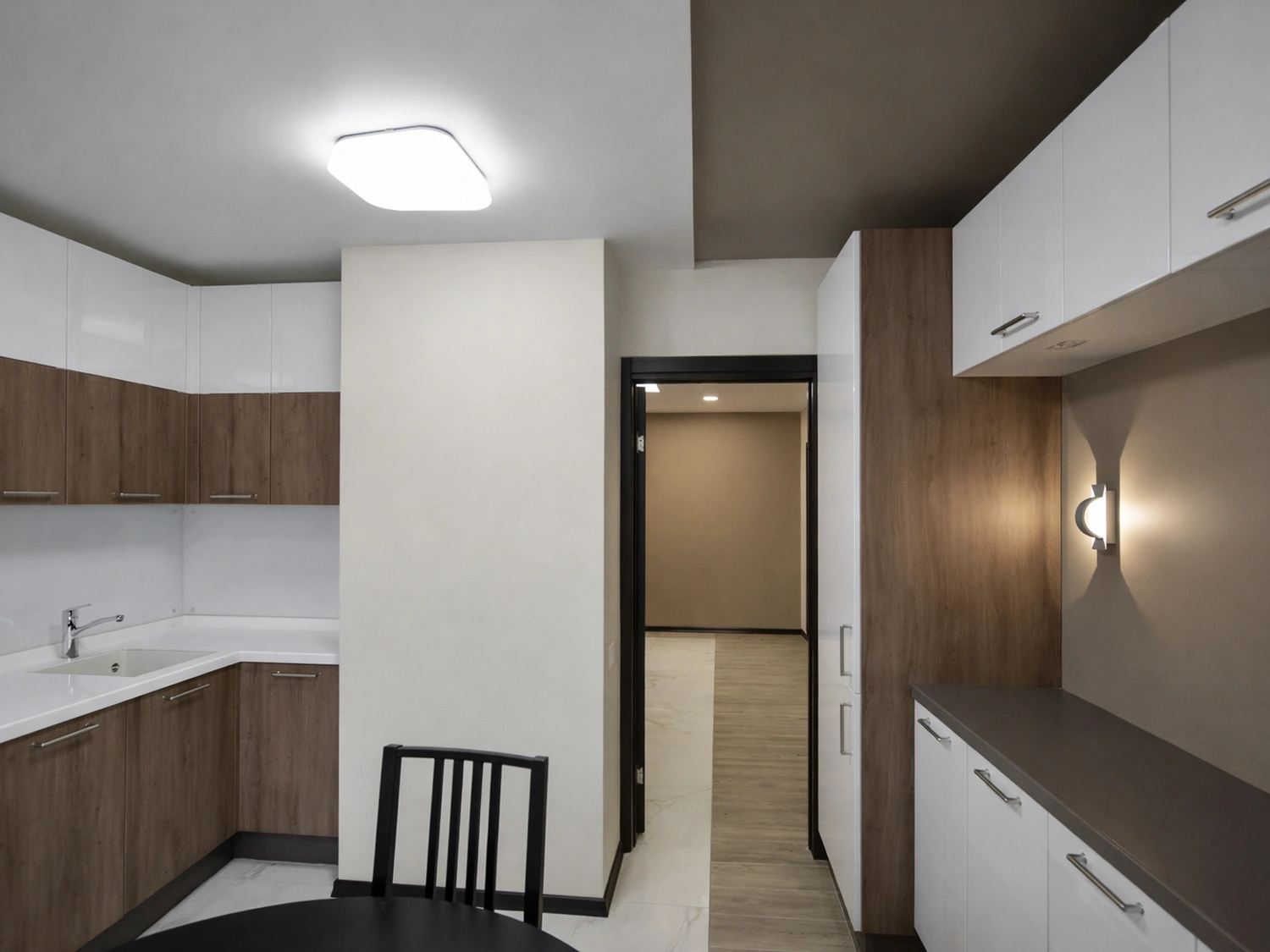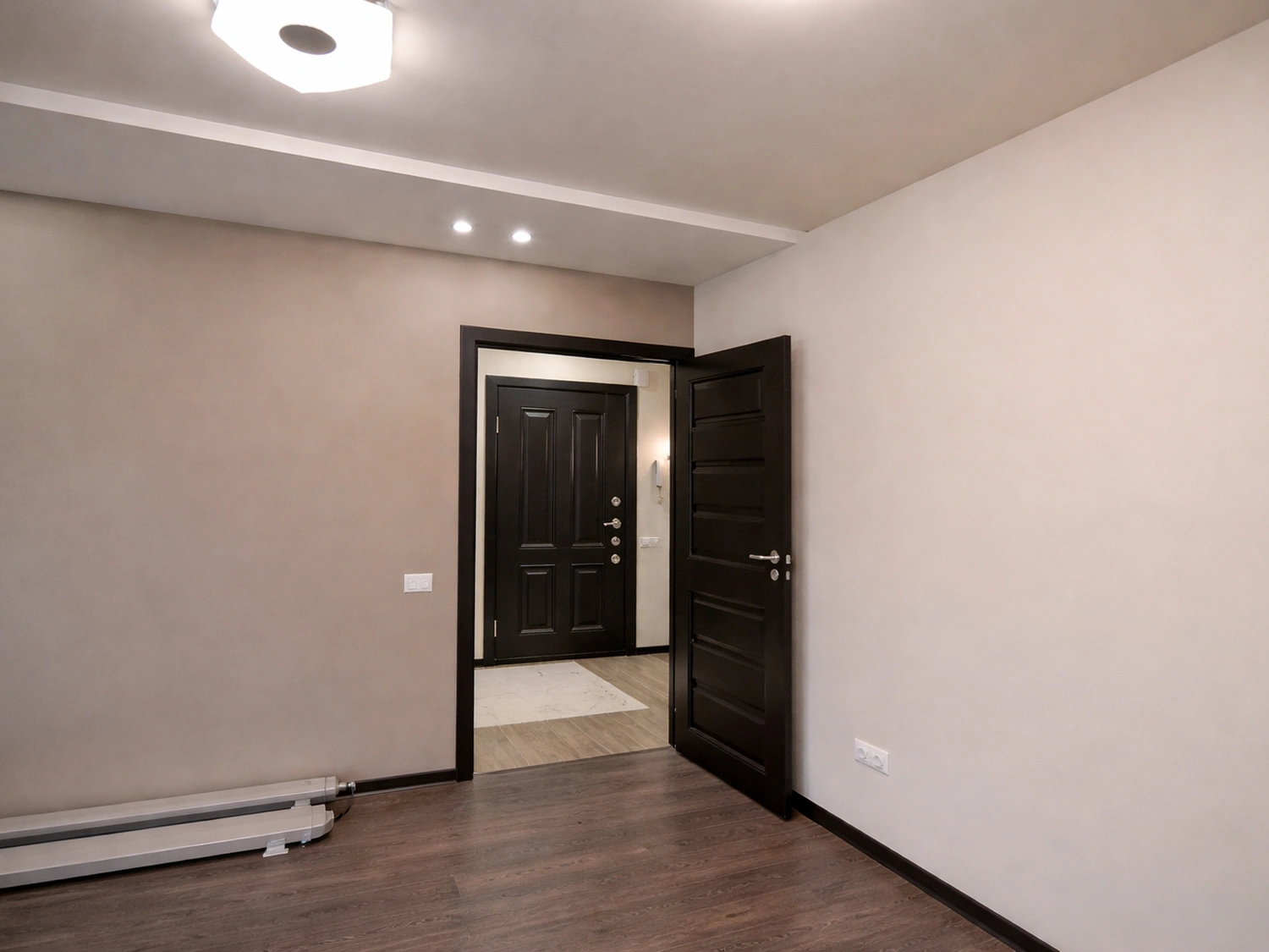 Далее, по ходу движения в жилые комнаты, керамогранит стыкуется с напольным покрытием под натуральное дерево. Мы отказались от порожков в пользу аккуратного шва, заполненного герметиком в тон, что создает единое визуальное пространство без лишних визуальных шумов. Стены в коридоре окрашены в спокойный бежевый оттенок, который служит идеальным фоном для темных межкомнатных дверей цвета венге с горизонтальными вставками.