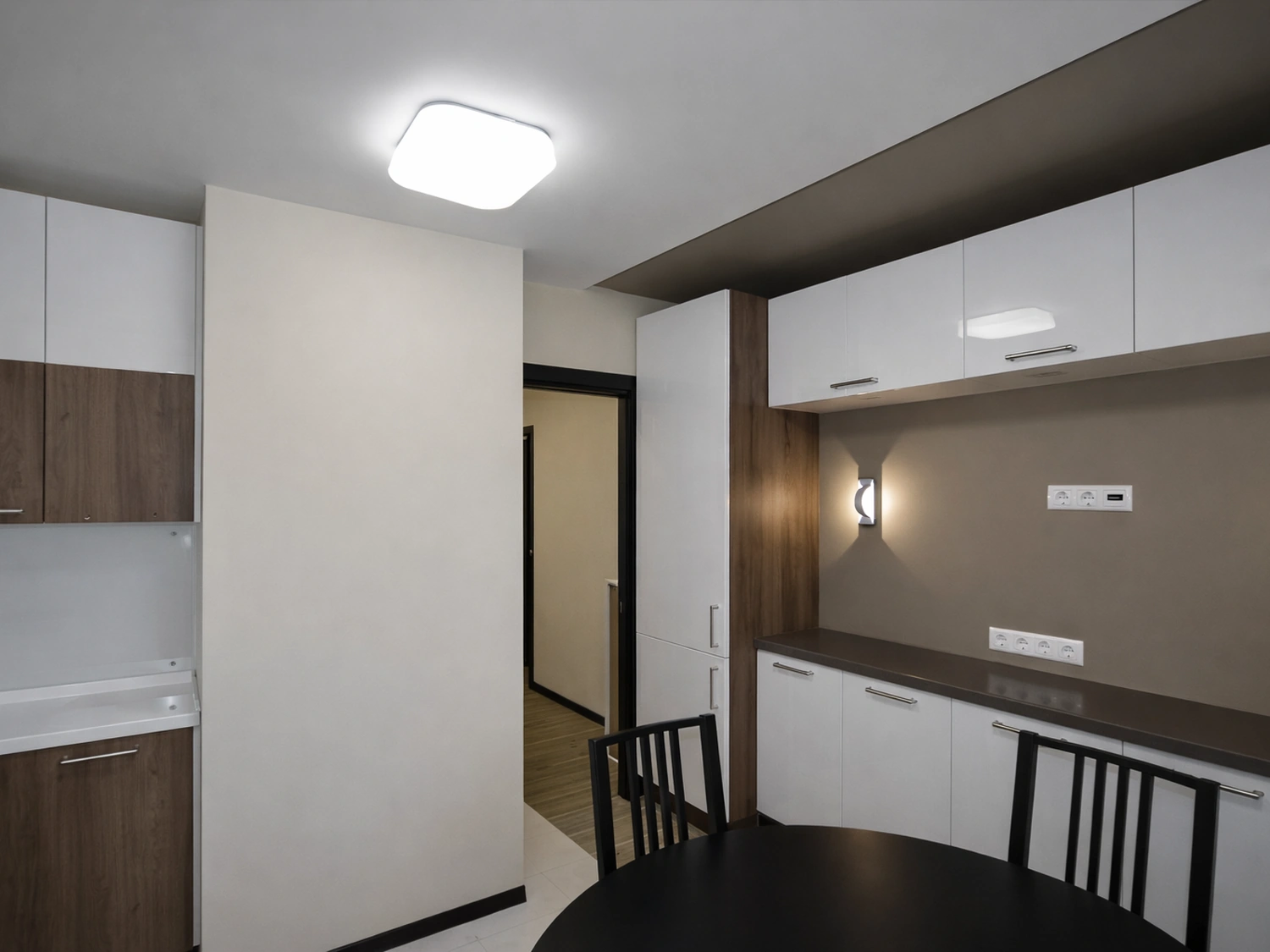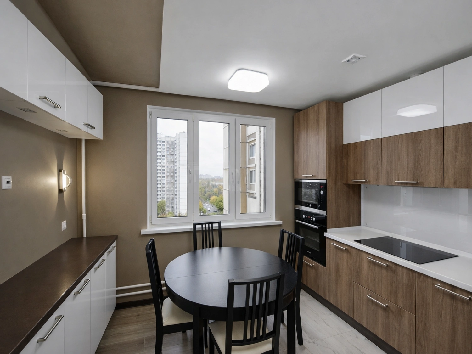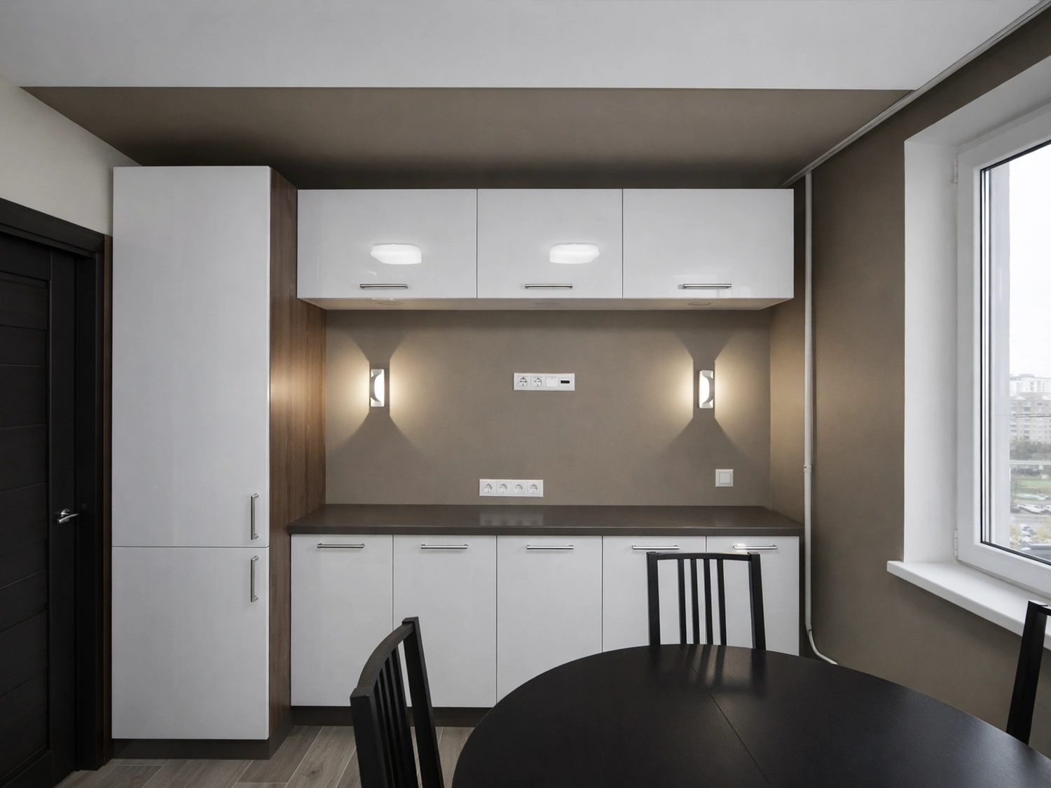 В обеденной зоне предусмотрено локальное освещение в виде настенных бра, создающих мягкий, камерный свет для вечерних чаепитий. Стены здесь выкрашены в нейтральный сложный оттенок тауп (серо-коричневый), который отлично сочетается с черной обеденной группой.
