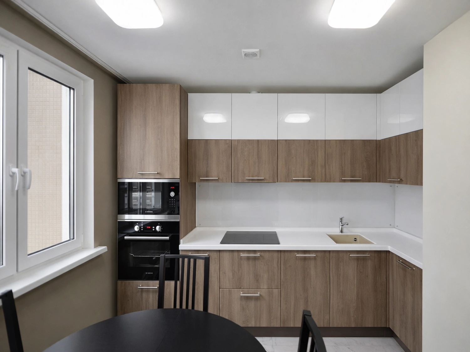 В кухне мы продолжили игру контрастов. Гарнитур выполнен в двух фактурах: нижние базы с фасадами под дерево добавляют тепла и заземляют интерьер, а верхние шкафы в белом глянце растворяются в пространстве, облегчая конструкцию. Такое решение особенно актуально для помещений средней площади. Встроенная техника вынесена в отдельную колонну — это эргономичный стандарт, который мы рекомендуем всем заказчикам.