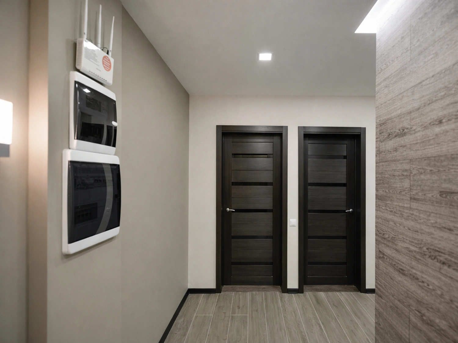 Инженерная часть вынесена на видное, но аккуратно оформленное место. Электрический щит и слаботочный узел для Wi-Fi роутера сгруппированы вертикально. Мы убеждены, что техническая эстетика — важная часть современного жилья.