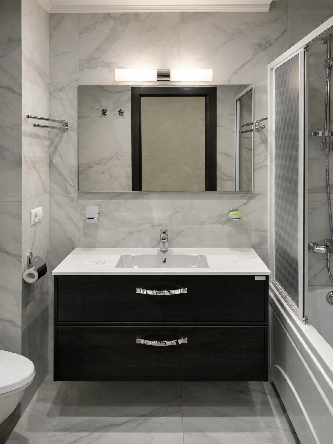 В ванной комнате мы столкнулись с задачей разместить всё необходимое на ограниченной площади. Как дизайнер интерьера, я всегда борюсь за каждый сантиметр полезной площади. Для отделки мы выбрали крупноформатный керамогранит под каррарский мрамор, который визуально расширяет пространство.