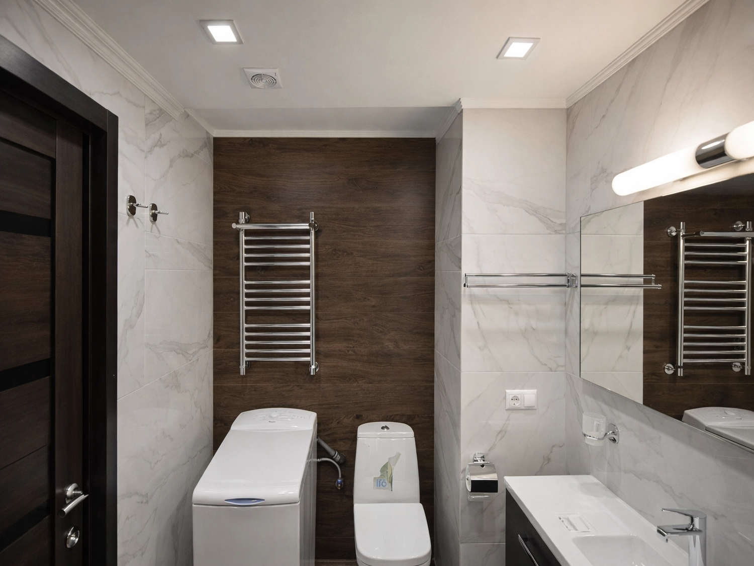 Зона инсталляции унитаза выделена акцентной плиткой под темное дерево, создавая визуальную глубину. Здесь же мы нашли оптимальное место для стиральной машины с вертикальной загрузкой. Это неочевидное, но крайне эффективное решение для узких ниш, позволяющее сохранить полноценный проход.
