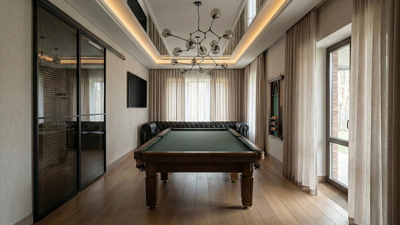 Жемчужина цокольного уровня — собственный кинотеатр. Это помещение потребовало сложнейшей акустической подготовки. Мы возвели систему "комната в комнате" со звукоизоляционными мембранами, установили акустические панели и плотные светонепроницаемые шторы. Визуальным центром притяжения стал невероятный потолок с эффектом ночного звездного неба, созданный с помощью сотен микроскопических оптоволоконных нитей. Огромные напольные колонки, мягкие модульные диваны и деревянные стеллажи делают просмотр фильмов по-настоящему иммерсивным.