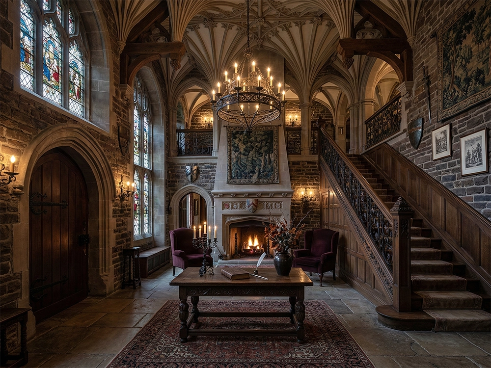 Готика пугает и притягивает одновременно своей исключительной выразительностью. Это грандиозный масштаб, архитектурная глубина и виртуозная работа с фактурами. Массивные каменные стены, сложная деревянная лестница с коваными элементами и высокие стрельчатые арки задают строгий тон прямо с порога. Как дизайнер интерьера, я прекрасно понимаю, что пространство дышит историей, но должно оставаться живым и уютным. Огонь в открытом камине дает необходимое тепло, а мягкий свет от монументальной многоярусной люстры выгодно подчеркивает сложный рельеф ребристых сводов. Правильно рассчитанное распределение света позволяет избежать ощущения мрачности и превращает дом в комфортное место.