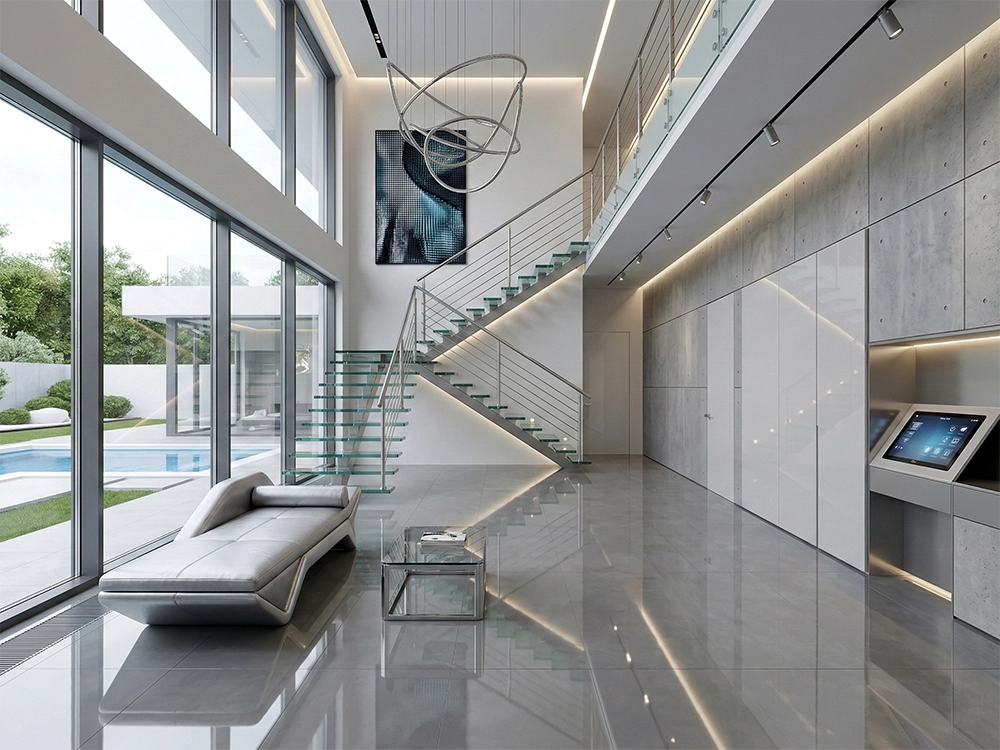 Разрабатывая дизайн интерьера, я всегда начинаю с формирования правильной геометрии объемов. Холл — это визитная карточка резиденции, задающая тон всему дальнейшему восприятию дома. Посмотрите на эту двусветную входную группу: обилие воздуха, строгие стеновые панели под архитектурный бетон и безупречный глянец крупноформатного керамогранита на полу. Лестница из закаленного стекла и нержавеющей стали выглядит абсолютно невесомой. Свет здесь работает как полноправный строительный материал. Линейные LED-профили подчеркивают геометрию стен, а сенсорная панель умного дома у входа позволяет моментально активировать нужный сценарий освещения.