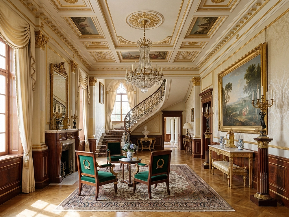 Рассматривая дизайн интерьера в этом величественном и строгом направлении, предельно важно уделить особое внимание входной группе. Холл всегда задает правильный тон всему дому с первых секунд. На представленном изображении вы четко видите классический пример: изящная деревянная лестница с витиеватыми коваными элементами плавно огибает пространство, а огромная хрустальная люстра и античные мотивы в декоре потолка сразу заявляют о высочайшем статусе интерьера. Зеленые кресла с характерным золотым шитьем гармонично и элегантно дополняют общую композицию.