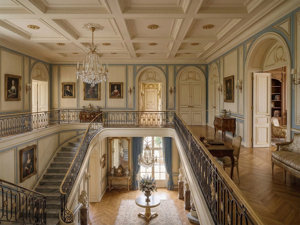 Первое впечатление о доме начинается с холла. Здесь задается масштаб, ритм и настроение всего пространства. Высокие потолки, сложные гипсовые карнизы и стены, украшенные классическими буазери в кремовых и нежно-голубых тонах, создают грандиозную архитектурную канву. Как дизайнер интерьера, я уделяю особое внимание геометрии и перспективе. Массивная мраморная лестница с изящным кованым ограждением выступает главной архитектурной доминантой. Классический паркет, уложенный французской елкой, направляет взгляд к центру композиции — круглому столу с пышной цветочной композицией. Антикварные бюсты на мраморных постаментах и массивная хрустальная люстра завершают образ парадного входа.