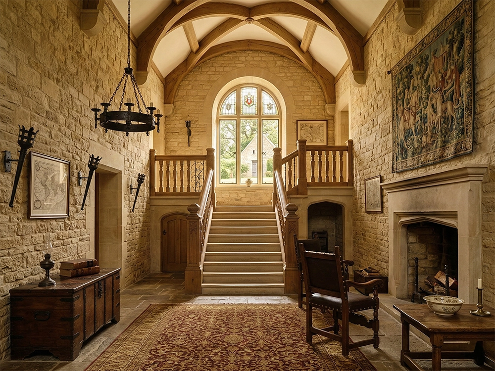 Романский интерьер начинается с архитектуры. Вы не сможете воссоздать эту атмосферу в тесном помещении с низкими потолками. Нам нужны объемы, воздух и ощущение надежной крепости. Главную скрипку здесь играют полуциркульные арки, мощные своды и фактурные каменные стены. Деревянные потолочные балки не должны быть декоративными пустышками — они обязаны выглядеть так, словно держат на себе вес столетий. В проектах такого уровня каждый архитектурный элемент работает на общее восприятие прочности и долговечности.