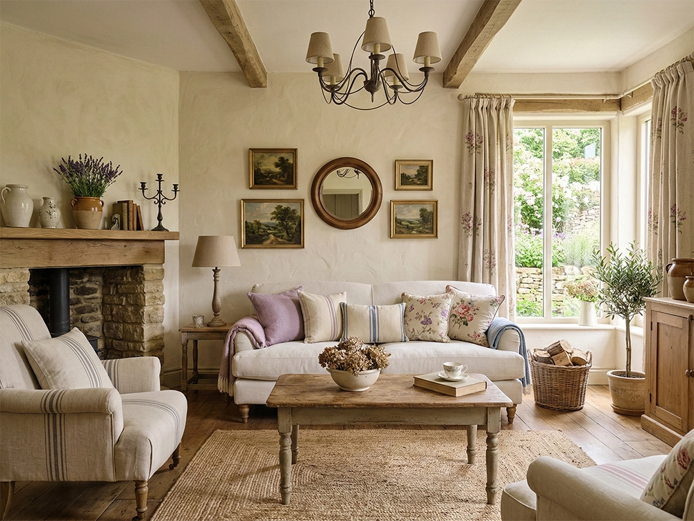 В зоне отдыха абсолютным центром притяжения чаще всего становится портал камина, выложенный грубым диким камнем. Он символизирует незыблемость традиций и стабильность. Мягкая мебель здесь всегда объемная, глубокая, располагающая к длительному отдыху. Светлый льняной диван и классические кресла создают идеальную нейтральную базу. А вот истинное настроение задают тщательно подобранные детали: мягкие подушки пастельных тонов с нежными цветочными или строгими полосатыми принтами, винтажные зеркала в массивных деревянных рамах, классические пейзажи на стенах и композиции из сухоцветов. Продумывая целостный дизайн интерьера дома, очень важно соблюдать тонкий баланс между деревенской простотой и элегантным изяществом, чтобы комнаты дышали и не казались перегруженными декором.